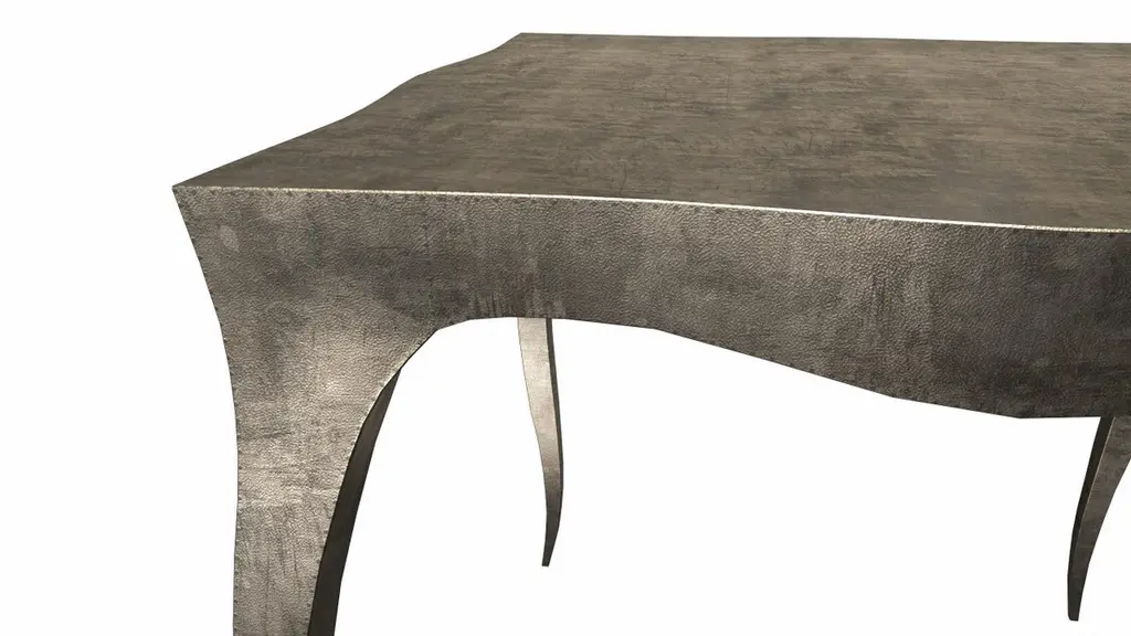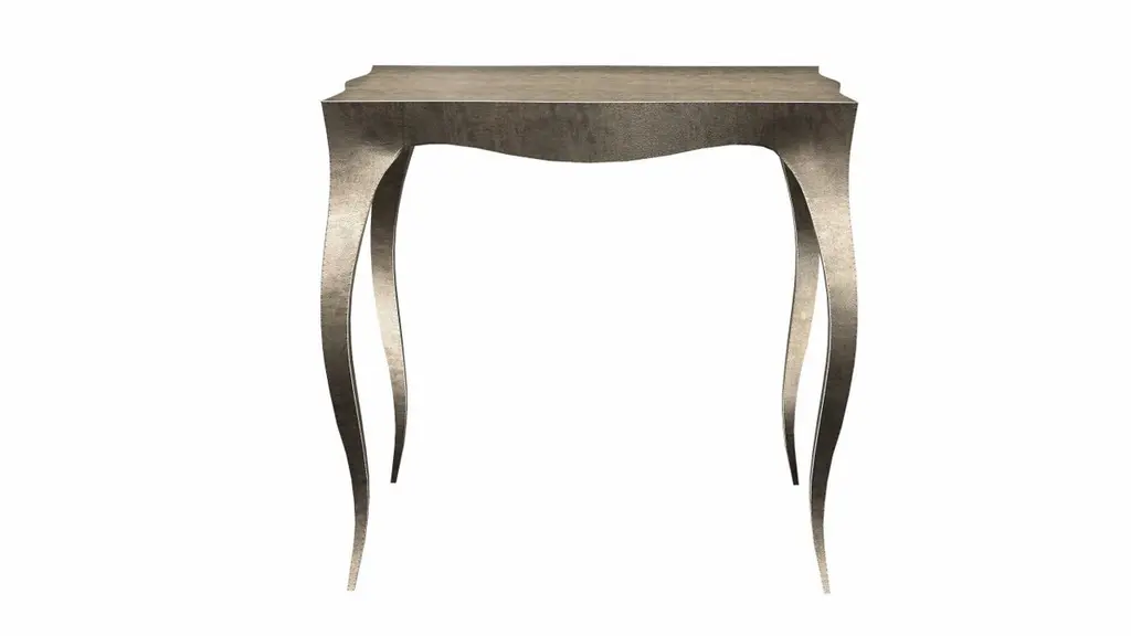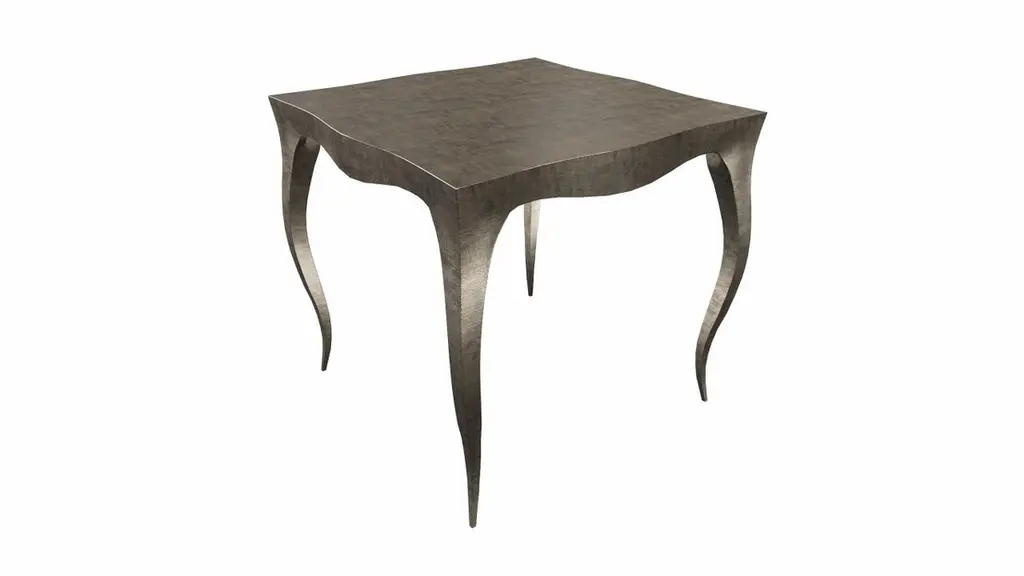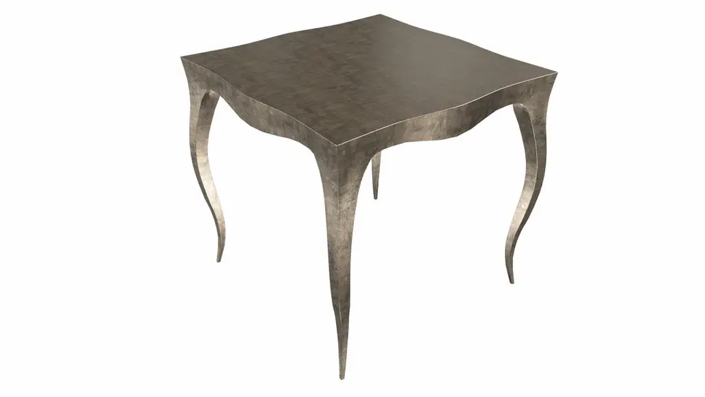 Louis Card Tables from our Louise Collection. The renowned designer Paul Mathieu chose the name “Louise” when he created his more feminine version of Louis XV (1730-1760) furniture. The characteristic cabriole leg, curving outward at the knee and inward towards the foot in an "S" shape was born during this period. It is during the same era that English furniture makers produced the Queen Anne and Chippendale styles.Crafted with utmost care and attention to detail, these Louis Card Tables are made to order and are available in twelve metal clad finishes, ensuring that you can choose the perfect one to match your individual style and taste. The use of high-quality materials and expert craftsmanship ensure that each Art Deco Louis Card Tables is not only beautiful but also a true piece of art.The curved legs and side arms of this Art Deco Louis Card Tables are hand carved from solid pieces of teak. Pattern makers trace and cut complex forms that will cover the chair in a skin of copper, white bronze, brass or antiqued white bronze The metal finishes will tarnish over time. Regular non-abrasive household metal polishes can be used to restore the original luster.Overall, if you're looking for a piece of furniture that combines luxury, comfort, and style, then the Art Deco Card Tables is an excellent choice. With its distinctive curved profile and multiple finish options, this Chair set is sure to elevate the look of any room it is placed in, and be a beloved addition to your home for years to come.The images shown in this listing are shot in different lighting conditions and/or are 3D illustrations. We encourage our customers to please request a sample or a full sample set of 12 finishes so that they can experience the finish first hand. Louise Art Deco Game Tables Fine Hammered Antique Bronze by Paul MathieuSize- 32"x 32"x 30"HMaterials - Antique Bronze, Metal sheet, Teak, Wood, MetalTechniques: Hand-Crafted, Hand-Carved, Metal Work, Wood Work, Metal Wrapping, PolishedPlease note that moisture in air, sudden change in temperature and natural movement of wood over time causes the metal to wrinkle or bubble up. We use well seasoned, reclaimed teak and high quality marine grade MDF (wherever technically possible) to avoid and delay the mentioned changes. However a perfect stability of metal cannot be guaranteed. Please note that our smooth finish metal clad pieces will have some unavoidable tool marks. This is proof that everything is done by hand. The smooth finish will not come out like a machine made perfect surface and the master artisan will do their best to make it look as good/clean/stable/perfect as he possibly can.The antique white bronze finish is hand done by using an acidic chemical over the white bronze finish to recreate a natural patination. Like with the natural patination of silver, copper, or brass, the final result and color uniformity of the patina cannot be guaranteed. The goal of this finish is to achieve rainbow-like shades with dull, shiny, cloudy, and streaky patches to give an illusion of antiquing. Please note:None of our metal clad pieces are treated with a protective “finish” thus enabling the items to age naturally over time. We will of course polish them well before we pack them. a) Copper oxidizes faster than the other metals. In six to twelve months it will most likely lose its shine and will gradually turn to different shades of brown and/or green/blue. This aging process and its effect is referred to as verdigris. After a year the piece should not change much more. Copper does not rust, but does require periodic cleaning in order to retain its original shine if that the preferred option. ('BRASSO' or any known copper polish can be used to polish copper).b) Brass retains its shine for far longer than others, but will tarnish if not cleaned on occasion. ('BRASSO' is made to polish brass).c) White bronze, has the least tendency to show age or tarnish. If kept in a controlled climate, this metal will hold its shine for years. It can be cleaned with a cleanser and polished with a cloth. d) The antiqued white bronze finish will react with the natural elements the fastest in the beginning but it too will stop reacting and will settle down in a stable state like copper after 6-12 months. Since it is already antiqued and looked like it is tarnished, as described in an earlier message, this fast reaction will not change the over all look. In that way this surface is most forgiving. The images shown in this listing are shot in different lighting conditions and/or are 3D illustrations. We encourage our customers to please request a sample or a full sample set of 12 finishes so that they can experience the finish first hand.