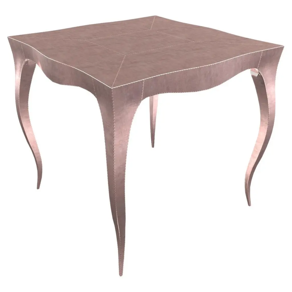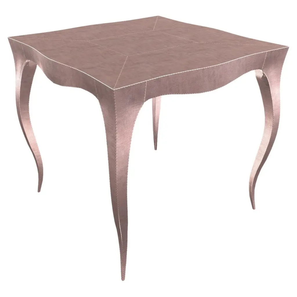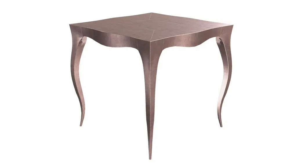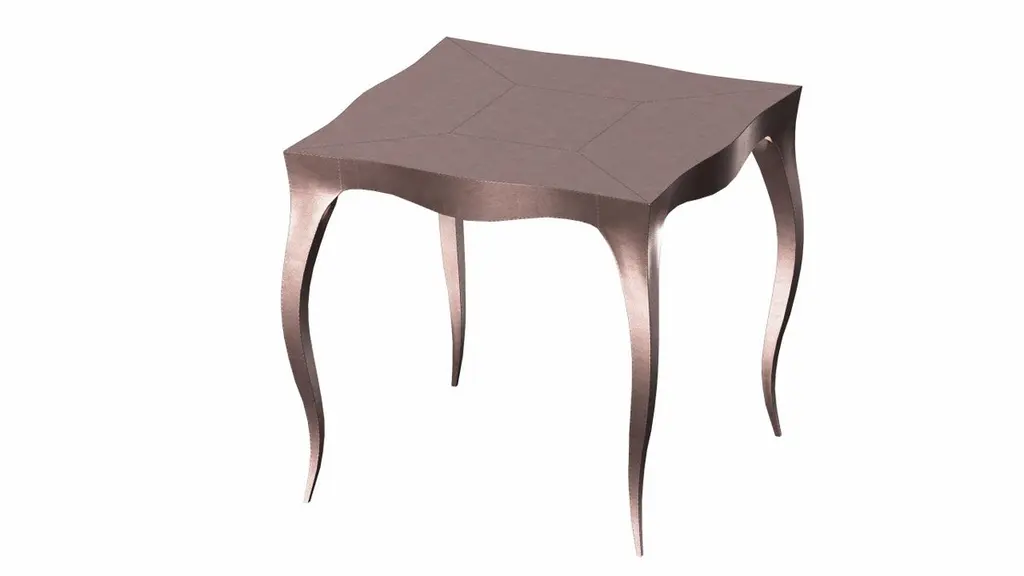 Louis Card Tables from our Louise Collection. The renowned designer Paul Mathieu chose the name “Louise” when he created his more feminine version of Louis XV (1730-1760) furniture. The characteristic cabriole leg, curving outward at the knee and inward towards the foot in an "S" shape was born during this period. It is during the same era that English furniture makers produced the Queen Anne and Chippendale styles.Crafted with utmost care and attention to detail, these Louis Card Tables are made to order and are available in twelve metal clad finishes, ensuring that you can choose the perfect one to match your individual style and taste. The use of high-quality materials and expert craftsmanship ensure that each Art Deco Louis Card Tables is not only beautiful but also a true piece of art.The curved legs and side arms of this Art Deco Louis Card Tables are hand carved from solid pieces of teak. Pattern makers trace and cut complex forms that will cover the chair in a skin of copper, white bronze, brass or antiqued white bronze The metal finishes will tarnish over time. Regular non-abrasive household metal polishes can be used to restore the original luster.Overall, if you're looking for a piece of furniture that combines luxury, comfort, and style, then the Art Deco Card Tables is an excellent choice. With its distinctive curved profile and multiple finish options, this Chair set is sure to elevate the look of any room it is placed in, and be a beloved addition to your home for years to come.The images shown in this listing are shot in different lighting conditions and/or are 3D illustrations. We encourage our customers to please request a sample or a full sample set of 12 finishes so that they can experience the finish first hand. Louise Art Deco Game Tables Mid. Hammered Copper by Paul Mathieu for Stephanie OdegardSize- 32"x 32"x 30"HMaterials - White Bronze, Metal sheet, Teak, Wood, MetalTechniques: Hand-Crafted, Hand-Carved, Metal Work, Wood Work, Metal Wrapping, PolishedPlease note that moisture in air, sudden change in temperature and natural movement of wood over time causes the metal to wrinkle or bubble up. We use well seasoned, reclaimed teak and high quality marine grade MDF (wherever technically possible) to avoid and delay the mentioned changes. However a perfect stability of metal cannot be guaranteed. Please note that our smooth finish metal clad pieces will have some unavoidable tool marks. This is proof that everything is done by hand. The smooth finish will not come out like a machine made perfect surface and the master artisan will do their best to make it look as good/clean/stable/perfect as he possibly can.The antique white bronze finish is hand done by using an acidic chemical over the white bronze finish to recreate a natural patination. Like with the natural patination of silver, copper, or brass, the final result and color uniformity of the patina cannot be guaranteed. The goal of this finish is to achieve rainbow-like shades with dull, shiny, cloudy, and streaky patches to give an illusion of antiquing. Please note:None of our metal clad pieces are treated with a protective “finish” thus enabling the items to age naturally over time. We will of course polish them well before we pack them. a) Copper oxidizes faster than the other metals. In six to twelve months it will most likely lose its shine and will gradually turn to different shades of brown and/or green/blue. This aging process and its effect is referred to as verdigris. After a year the piece should not change much more. Copper does not rust, but does require periodic cleaning in order to retain its original shine if that the preferred option. ('BRASSO' or any known copper polish can be used to polish copper).b) Brass retains its shine for far longer than others, but will tarnish if not cleaned on occasion. ('BRASSO' is made to polish brass).c) White bronze, has the least tendency to show age or tarnish. If kept in a controlled climate, this metal will hold its shine for years. It can be cleaned with a cleanser and polished with a cloth. d) The antiqued white bronze finish will react with the natural elements the fastest in the beginning but it too will stop reacting and will settle down in a stable state like copper after 6-12 months. Since it is already antiqued and looked like it is tarnished, as described in an earlier message, this fast reaction will not change the over all look. In that way this surface is most forgiving. The images shown in this listing are shot in different lighting conditions and/or are 3D illustrations. We encourage our customers to please request a sample or a full sample set of 12 finishes so that they can experience the finish first hand.