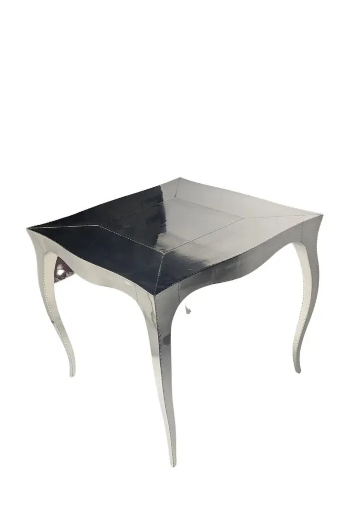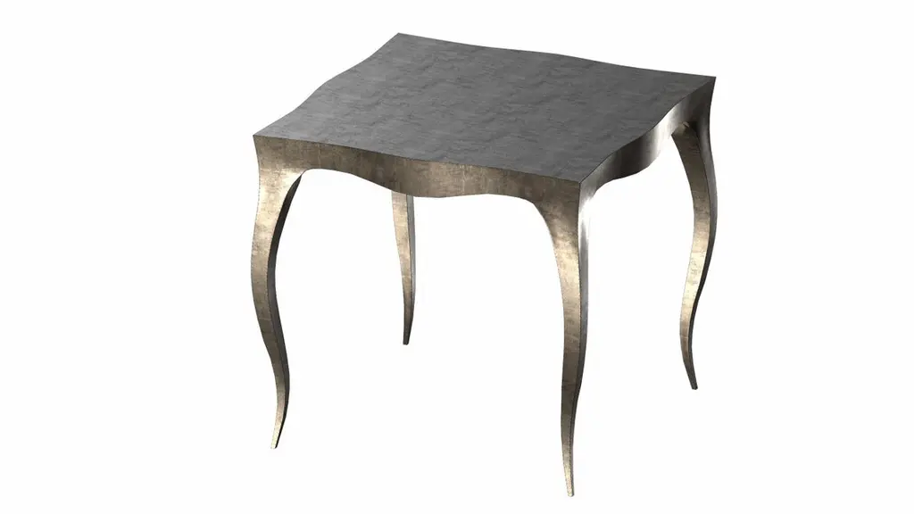 Louis Card Tables from our Louise Collection. The renowned designer Paul Mathieu chose the name “Louise” when he created his more feminine version of Louis XV (1730-1760) furniture. The characteristic cabriole leg, curving outward at the knee and inward towards the foot in an "S" shape was born during this period. It is during the same era that English furniture makers produced the Queen Anne and Chippendale styles.Crafted with utmost care and attention to detail, these Louis Card Tables are made to order and are available in twelve metal clad finishes, ensuring that you can choose the perfect one to match your individual style and taste. The use of high-quality materials and expert craftsmanship ensure that each Art Deco Louis Card Tables is not only beautiful but also a true piece of art.The curved legs and side arms of this Art Deco Louis Card Tables are hand carved from solid pieces of teak. Pattern makers trace and cut complex forms that will cover the chair in a skin of copper, white bronze, brass or antiqued white bronze The metal finishes will tarnish over time. Regular non-abrasive household metal polishes can be used to restore the original luster.Overall, if you're looking for a piece of furniture that combines luxury, comfort, and style, then the Art Deco Card Tables is an excellent choice. With its distinctive curved profile and multiple finish options, this Chair set is sure to elevate the look of any room it is placed in, and be a beloved addition to your home for years to come.The images shown in this listing are shot in different lighting conditions and/or are 3D illustrations. We encourage our customers to please request a sample or a full sample set of 12 finishes so that they can experience the finish first hand. Louise Art Deco Game Tables Smooth Antique Bronze by Paul Mathieu for Stephanie OdegardSize- 32"x 32"x 30"HMaterials - White Bronze, Metal sheet, Teak, Wood, MetalTechniques: Hand-Crafted, Hand-Carved, Metal Work, Wood Work, Metal Wrapping, PolishedPlease note that moisture in air, sudden change in temperature and natural movement of wood over time causes the metal to wrinkle or bubble up. We use well seasoned, reclaimed teak and high quality marine grade MDF (wherever technically possible) to avoid and delay the mentioned changes. However a perfect stability of metal cannot be guaranteed. Please note that our smooth finish metal clad pieces will have some unavoidable tool marks. This is proof that everything is done by hand. The smooth finish will not come out like a machine made perfect surface and the master artisan will do their best to make it look as good/clean/stable/perfect as he possibly can.The antique white bronze finish is hand done by using an acidic chemical over the white bronze finish to recreate a natural patination. Like with the natural patination of silver, copper, or brass, the final result and color uniformity of the patina cannot be guaranteed. The goal of this finish is to achieve rainbow-like shades with dull, shiny, cloudy, and streaky patches to give an illusion of antiquing. Please note:None of our metal clad pieces are treated with a protective “finish” thus enabling the items to age naturally over time. We will of course polish them well before we pack them. a) Copper oxidizes faster than the other metals. In six to twelve months it will most likely lose its shine and will gradually turn to different shades of brown and/or green/blue. This aging process and its effect is referred to as verdigris. After a year the piece should not change much more. Copper does not rust, but does require periodic cleaning in order to retain its original shine if that the preferred option. ('BRASSO' or any known copper polish can be used to polish copper).b) Brass retains its shine for far longer than others, but will tarnish if not cleaned on occasion. ('BRASSO' is made to polish brass).c) White bronze, has the least tendency to show age or tarnish. If kept in a controlled climate, this metal will hold its shine for years. It can be cleaned with a cleanser and polished with a cloth. d) The antiqued white bronze finish will react with the natural elements the fastest in the beginning but it too will stop reacting and will settle down in a stable state like copper after 6-12 months. Since it is already antiqued and looked like it is tarnished, as described in an earlier message, this fast reaction will not change the over all look. In that way this surface is most forgiving. The images shown in this listing are shot in different lighting conditions and/or are 3D illustrations. We encourage our customers to please request a sample or a full sample set of 12 finishes so that they can experience the finish first hand.