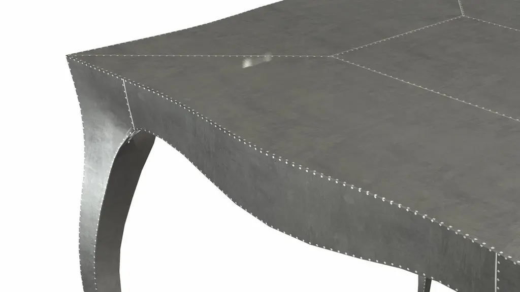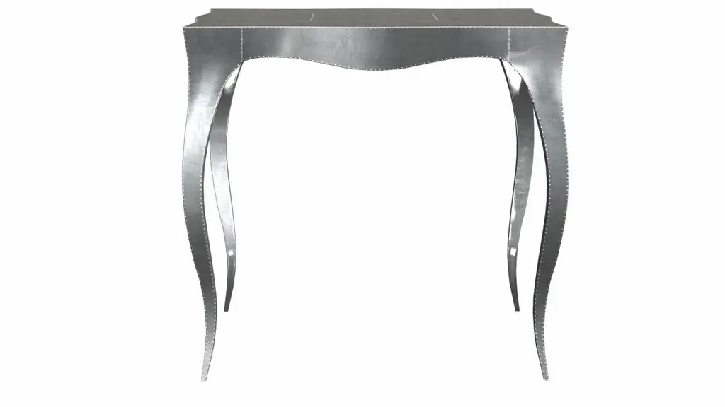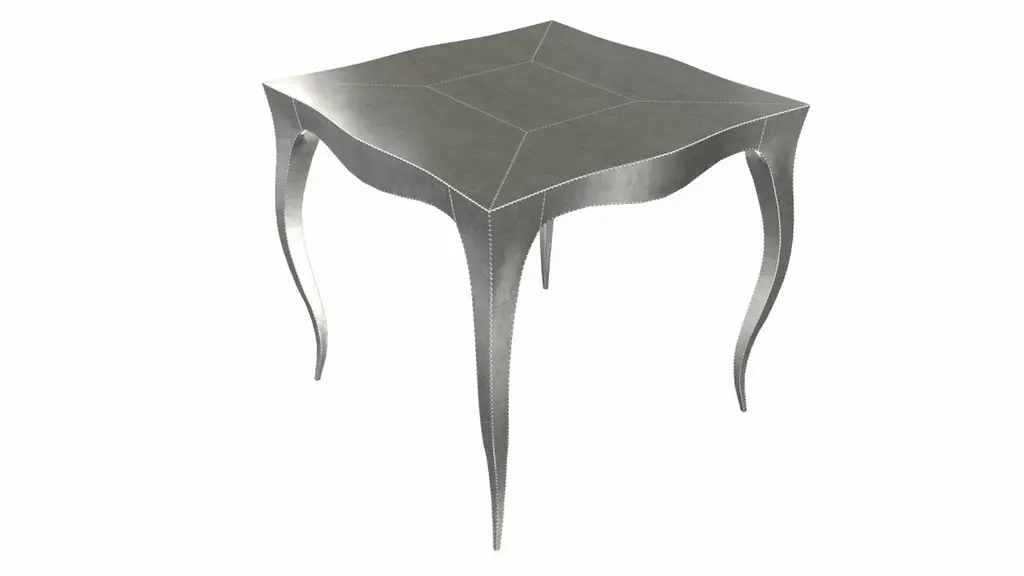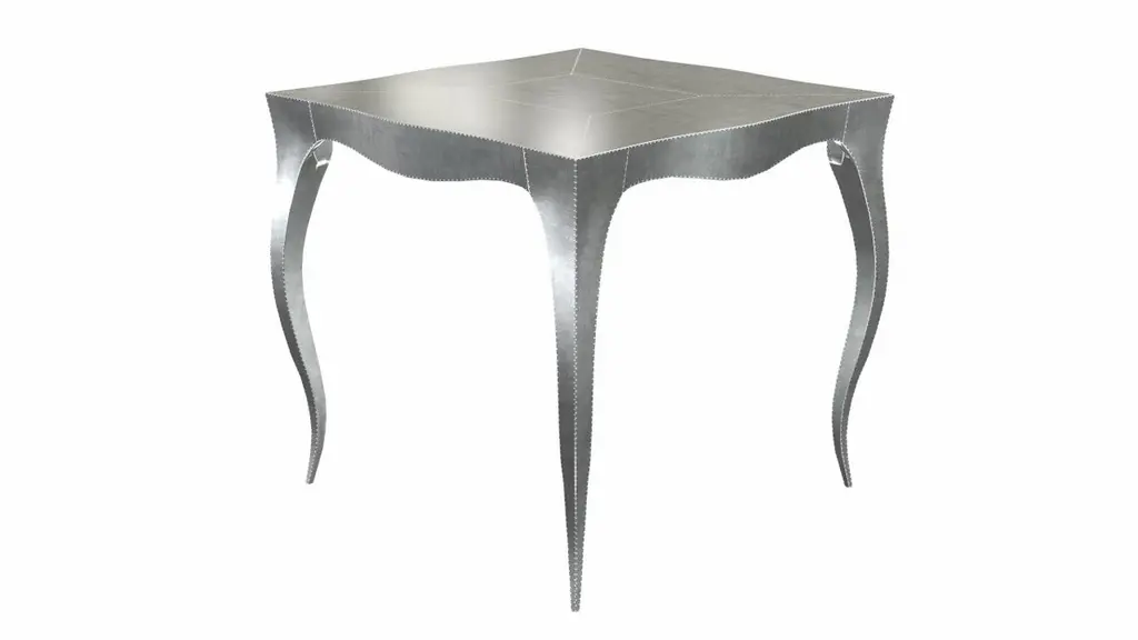 Louis Card Tables from our Louise Collection. The renowned designer Paul Mathieu chose the name “Louise” when he created his more feminine version of Louis XV (1730-1760) furniture. The characteristic cabriole leg, curving outward at the knee and inward towards the foot in an "S" shape was born during this period. It is during the same era that English furniture makers produced the Queen Anne and Chippendale styles.Crafted with utmost care and attention to detail, these Louis Card Tables are made to order and are available in twelve metal clad finishes, ensuring that you can choose the perfect one to match your individual style and taste. The use of high-quality materials and expert craftsmanship ensure that each Art Deco Louis Card Tables is not only beautiful but also a true piece of art.The curved legs and side arms of this Art Deco Louis Card Tables are hand carved from solid pieces of teak. Pattern makers trace and cut complex forms that will cover the chair in a skin of copper, white bronze, brass or antiqued white bronze The metal finishes will tarnish over time. Regular non-abrasive household metal polishes can be used to restore the original luster.Overall, if you're looking for a piece of furniture that combines luxury, comfort, and style, then the Art Deco Card Tables is an excellent choice. With its distinctive curved profile and multiple finish options, this Chair set is sure to elevate the look of any room it is placed in, and be a beloved addition to your home for years to come.The images shown in this listing are shot in different lighting conditions and/or are 3D illustrations. We encourage our customers to please request a sample or a full sample set of 12 finishes so that they can experience the finish first hand. Louise Art Deco Game Tables Smooth White Bronze by Paul Mathieu for Stephanie OdegardSize- 32"x 32"x 30"HMaterials - White Bronze, Metal sheet, Teak, Wood, MetalTechniques: Hand-Crafted, Hand-Carved, Metal Work, Wood Work, Metal Wrapping, PolishedPlease note that moisture in air, sudden change in temperature and natural movement of wood over time causes the metal to wrinkle or bubble up. We use well seasoned, reclaimed teak and high quality marine grade MDF (wherever technically possible) to avoid and delay the mentioned changes. However a perfect stability of metal cannot be guaranteed. Please note that our smooth finish metal clad pieces will have some unavoidable tool marks. This is proof that everything is done by hand. The smooth finish will not come out like a machine made perfect surface and the master artisan will do their best to make it look as good/clean/stable/perfect as he possibly can.The antique white bronze finish is hand done by using an acidic chemical over the white bronze finish to recreate a natural patination. Like with the natural patination of silver, copper, or brass, the final result and color uniformity of the patina cannot be guaranteed. The goal of this finish is to achieve rainbow-like shades with dull, shiny, cloudy, and streaky patches to give an illusion of antiquing. Please note:None of our metal clad pieces are treated with a protective “finish” thus enabling the items to age naturally over time. We will of course polish them well before we pack them. a) Copper oxidizes faster than the other metals. In six to twelve months it will most likely lose its shine and will gradually turn to different shades of brown and/or green/blue. This aging process and its effect is referred to as verdigris. After a year the piece should not change much more. Copper does not rust, but does require periodic cleaning in order to retain its original shine if that the preferred option. ('BRASSO' or any known copper polish can be used to polish copper).b) Brass retains its shine for far longer than others, but will tarnish if not cleaned on occasion. ('BRASSO' is made to polish brass).c) White bronze, has the least tendency to show age or tarnish. If kept in a controlled climate, this metal will hold its shine for years. It can be cleaned with a cleanser and polished with a cloth. d) The antiqued white bronze finish will react with the natural elements the fastest in the beginning but it too will stop reacting and will settle down in a stable state like copper after 6-12 months. Since it is already antiqued and looked like it is tarnished, as described in an earlier message, this fast reaction will not change the over all look. In that way this surface is most forgiving. The images shown in this listing are shot in different lighting conditions and/or are 3D illustrations. We encourage our customers to please request a sample or a full sample set of 12 finishes so that they can experience the finish first hand.