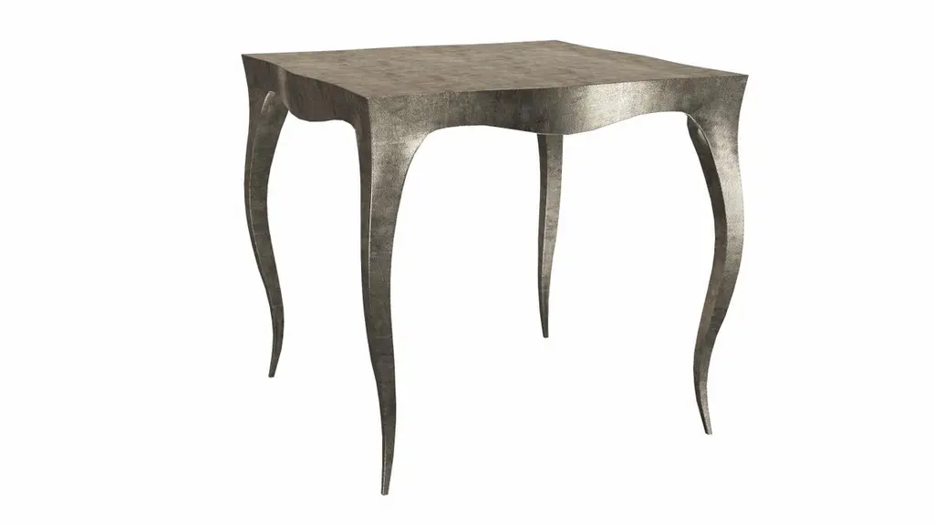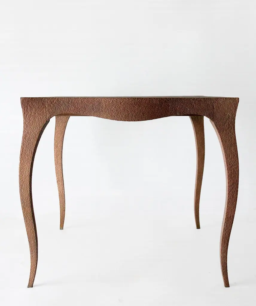 Louis Card Tables from our Louise Collection. The renowned designer Paul Mathieu chose the name “Louise” when he created his more feminine version of Louis XV (1730-1760) furniture. The characteristic cabriole leg, curving outward at the knee and inward towards the foot in an "S" shape was born during this period. It is during the same era that English furniture makers produced the Queen Anne and Chippendale styles.Crafted with utmost care and attention to detail, these Louis Card Tables are made to order and are available in twelve metal clad finishes, ensuring that you can choose the perfect one to match your individual style and taste. The use of high-quality materials and expert craftsmanship ensure that each Art Deco Louis Card Tables is not only beautiful but also a true piece of art.The curved legs and side arms of this Art Deco Louis Card Tables are hand carved from solid pieces of teak. Pattern makers trace and cut complex forms that will cover the chair in a skin of copper, white bronze, brass or antiqued white bronze The metal finishes will tarnish over time. Regular non-abrasive household metal polishes can be used to restore the original luster.Overall, if you're looking for a piece of furniture that combines luxury, comfort, and style, then the Art Deco Card Tables is an excellent choice. With its distinctive curved profile and multiple finish options, this Chair set is sure to elevate the look of any room it is placed in, and be a beloved addition to your home for years to come.The images shown in this listing are shot in different lighting conditions and/or are 3D illustrations. We encourage our customers to please request a sample or a full sample set of 12 finishes so that they can experience the finish first hand. Louise Art Deco Industrial and Work Tables Mid. Hammered Antique Bronze by Paul Mathieu for Stephanie OdegardSize- 32"x 32"x 30"HMaterials - Antique Bronze, Metal sheet, Teak, Wood, MetalTechniques: Hand-Crafted, Hand-Carved, Metal Work, Wood Work, Metal Wrapping, PolishedPlease note that moisture in air, sudden change in temperature and natural movement of wood over time causes the metal to wrinkle or bubble up. We use well seasoned, reclaimed teak and high quality marine grade MDF (wherever technically possible) to avoid and delay the mentioned changes. However a perfect stability of metal cannot be guaranteed. Please note that our smooth finish metal clad pieces will have some unavoidable tool marks. This is proof that everything is done by hand. The smooth finish will not come out like a machine made perfect surface and the master artisan will do their best to make it look as good/clean/stable/perfect as he possibly can.The antique white bronze finish is hand done by using an acidic chemical over the white bronze finish to recreate a natural patination. Like with the natural patination of silver, copper, or brass, the final result and color uniformity of the patina cannot be guaranteed. The goal of this finish is to achieve rainbow-like shades with dull, shiny, cloudy, and streaky patches to give an illusion of antiquing. Please note:None of our metal clad pieces are treated with a protective “finish” thus enabling the items to age naturally over time. We will of course polish them well before we pack them. a) Copper oxidizes faster than the other metals. In six to twelve months it will most likely lose its shine and will gradually turn to different shades of brown and/or green/blue. This aging process and its effect is referred to as verdigris. After a year the piece should not change much more. Copper does not rust, but does require periodic cleaning in order to retain its original shine if that the preferred option. ('BRASSO' or any known copper polish can be used to polish copper).b) Brass retains its shine for far longer than others, but will tarnish if not cleaned on occasion. ('BRASSO' is made to polish brass).c) White bronze, has the least tendency to show age or tarnish. If kept in a controlled climate, this metal will hold its shine for years. It can be cleaned with a cleanser and polished with a cloth. d) The antiqued white bronze finish will react with the natural elements the fastest in the beginning but it too will stop reacting and will settle down in a stable state like copper after 6-12 months. Since it is already antiqued and looked like it is tarnished, as described in an earlier message, this fast reaction will not change the over all look. In that way this surface is most forgiving. The images shown in this listing are shot in different lighting conditions and/or are 3D illustrations. We encourage our customers to please request a sample or a full sample set of 12 finishes so that they can experience the finish first hand.