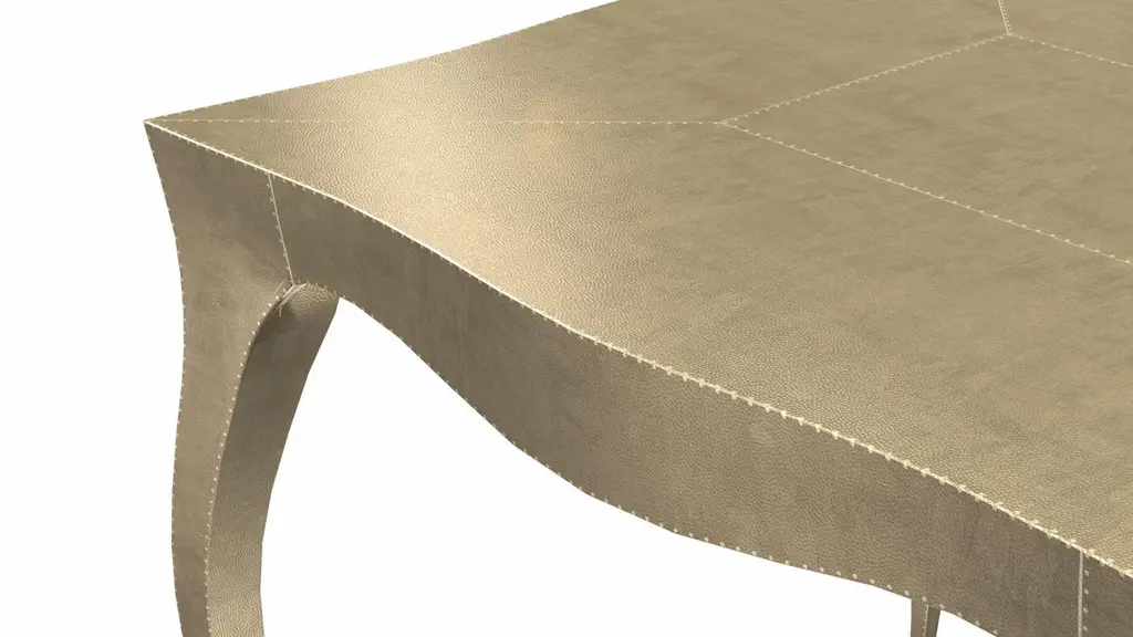 Louis Card Tables from our Louise Collection. The renowned designer Paul Mathieu chose the name “Louise” when he created his more feminine version of Louis XV (1730-1760) furniture. The characteristic cabriole leg, curving outward at the knee and inward towards the foot in an "S" shape was born during this period. It is during the same era that English furniture makers produced the Queen Anne and Chippendale styles.Crafted with utmost care and attention to detail, these Louis Card Tables are made to order and are available in twelve metal clad finishes, ensuring that you can choose the perfect one to match your individual style and taste. The use of high-quality materials and expert craftsmanship ensure that each Art Deco Louis Card Tables is not only beautiful but also a true piece of art.The curved legs and side arms of this Art Deco Louis Card Tables are hand carved from solid pieces of teak. Pattern makers trace and cut complex forms that will cover the chair in a skin of copper, white bronze, brass or antiqued white bronze The metal finishes will tarnish over time. Regular non-abrasive household metal polishes can be used to restore the original luster.Overall, if you're looking for a piece of furniture that combines luxury, comfort, and style, then the Art Deco Card Tables is an excellent choice. With its distinctive curved profile and multiple finish options, this Chair set is sure to elevate the look of any room it is placed in, and be a beloved addition to your home for years to come.The images shown in this listing are shot in different lighting conditions and/or are 3D illustrations. We encourage our customers to please request a sample or a full sample set of 12 finishes so that they can experience the finish first hand. Louise Art Deco Industrial and Work Tables Mid. Hammered Brass by Paul Mathieu for Stephanie OdegardSize- 32"x 32"x 30"HMaterials - White Bronze, Metal sheet, Teak, Wood, MetalTechniques: Hand-Crafted, Hand-Carved, Metal Work, Wood Work, Metal Wrapping, PolishedPlease note that moisture in air, sudden change in temperature and natural movement of wood over time causes the metal to wrinkle or bubble up. We use well seasoned, reclaimed teak and high quality marine grade MDF (wherever technically possible) to avoid and delay the mentioned changes. However a perfect stability of metal cannot be guaranteed. Please note that our smooth finish metal clad pieces will have some unavoidable tool marks. This is proof that everything is done by hand. The smooth finish will not come out like a machine made perfect surface and the master artisan will do their best to make it look as good/clean/stable/perfect as he possibly can.The antique white bronze finish is hand done by using an acidic chemical over the white bronze finish to recreate a natural patination. Like with the natural patination of silver, copper, or brass, the final result and color uniformity of the patina cannot be guaranteed. The goal of this finish is to achieve rainbow-like shades with dull, shiny, cloudy, and streaky patches to give an illusion of antiquing. Please note:None of our metal clad pieces are treated with a protective “finish” thus enabling the items to age naturally over time. We will of course polish them well before we pack them. a) Copper oxidizes faster than the other metals. In six to twelve months it will most likely lose its shine and will gradually turn to different shades of brown and/or green/blue. This aging process and its effect is referred to as verdigris. After a year the piece should not change much more. Copper does not rust, but does require periodic cleaning in order to retain its original shine if that the preferred option. ('BRASSO' or any known copper polish can be used to polish copper).b) Brass retains its shine for far longer than others, but will tarnish if not cleaned on occasion. ('BRASSO' is made to polish brass).c) White bronze, has the least tendency to show age or tarnish. If kept in a controlled climate, this metal will hold its shine for years. It can be cleaned with a cleanser and polished with a cloth. d) The antiqued white bronze finish will react with the natural elements the fastest in the beginning but it too will stop reacting and will settle down in a stable state like copper after 6-12 months. Since it is already antiqued and looked like it is tarnished, as described in an earlier message, this fast reaction will not change the over all look. In that way this surface is most forgiving. The images shown in this listing are shot in different lighting conditions and/or are 3D illustrations. We encourage our customers to please request a sample or a full sample set of 12 finishes so that they can experience the finish first hand.