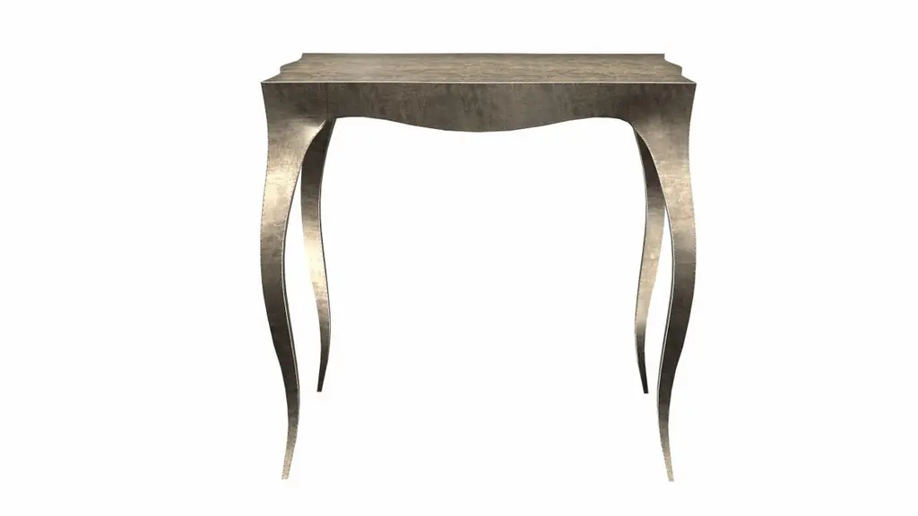Louis Card Tables from our Louise Collection. The renowned designer Paul Mathieu chose the name “Louise” when he created his more feminine version of Louis XV (1730-1760) furniture. The characteristic cabriole leg, curving outward at the knee and inward towards the foot in an "S" shape was born during this period. It is during the same era that English furniture makers produced the Queen Anne and Chippendale styles.Crafted with utmost care and attention to detail, these Louis Card Tables are made to order and are available in twelve metal clad finishes, ensuring that you can choose the perfect one to match your individual style and taste. The use of high-quality materials and expert craftsmanship ensure that each Art Deco Louis Card Tables is not only beautiful but also a true piece of art.The curved legs and side arms of this Art Deco Louis Card Tables are hand carved from solid pieces of teak. Pattern makers trace and cut complex forms that will cover the chair in a skin of copper, white bronze, brass or antiqued white bronze The metal finishes will tarnish over time. Regular non-abrasive household metal polishes can be used to restore the original luster.Overall, if you're looking for a piece of furniture that combines luxury, comfort, and style, then the Art Deco Card Tables is an excellent choice. With its distinctive curved profile and multiple finish options, this Chair set is sure to elevate the look of any room it is placed in, and be a beloved addition to your home for years to come.The images shown in this listing are shot in different lighting conditions and/or are 3D illustrations. We encourage our customers to please request a sample or a full sample set of 12 finishes so that they can experience the finish first hand. Louise Art Deco Industrial and Work Tables Smooth Antique Bronze by Paul Mathieu for Stephanie OdegardSize- 32"x 32"x 30"HMaterials - White Bronze, Metal sheet, Teak, Wood, MetalTechniques: Hand-Crafted, Hand-Carved, Metal Work, Wood Work, Metal Wrapping, PolishedPlease note that moisture in air, sudden change in temperature and natural movement of wood over time causes the metal to wrinkle or bubble up. We use well seasoned, reclaimed teak and high quality marine grade MDF (wherever technically possible) to avoid and delay the mentioned changes. However a perfect stability of metal cannot be guaranteed. Please note that our smooth finish metal clad pieces will have some unavoidable tool marks. This is proof that everything is done by hand. The smooth finish will not come out like a machine made perfect surface and the master artisan will do their best to make it look as good/clean/stable/perfect as he possibly can.The antique white bronze finish is hand done by using an acidic chemical over the white bronze finish to recreate a natural patination. Like with the natural patination of silver, copper, or brass, the final result and color uniformity of the patina cannot be guaranteed. The goal of this finish is to achieve rainbow-like shades with dull, shiny, cloudy, and streaky patches to give an illusion of antiquing. Please note:None of our metal clad pieces are treated with a protective “finish” thus enabling the items to age naturally over time. We will of course polish them well before we pack them. a) Copper oxidizes faster than the other metals. In six to twelve months it will most likely lose its shine and will gradually turn to different shades of brown and/or green/blue. This aging process and its effect is referred to as verdigris. After a year the piece should not change much more. Copper does not rust, but does require periodic cleaning in order to retain its original shine if that the preferred option. ('BRASSO' or any known copper polish can be used to polish copper).b) Brass retains its shine for far longer than others, but will tarnish if not cleaned on occasion. ('BRASSO' is made to polish brass).c) White bronze, has the least tendency to show age or tarnish. If kept in a controlled climate, this metal will hold its shine for years. It can be cleaned with a cleanser and polished with a cloth. d) The antiqued white bronze finish will react with the natural elements the fastest in the beginning but it too will stop reacting and will settle down in a stable state like copper after 6-12 months. Since it is already antiqued and looked like it is tarnished, as described in an earlier message, this fast reaction will not change the over all look. In that way this surface is most forgiving. The images shown in this listing are shot in different lighting conditions and/or are 3D illustrations. We encourage our customers to please request a sample or a full sample set of 12 finishes so that they can experience the finish first hand.