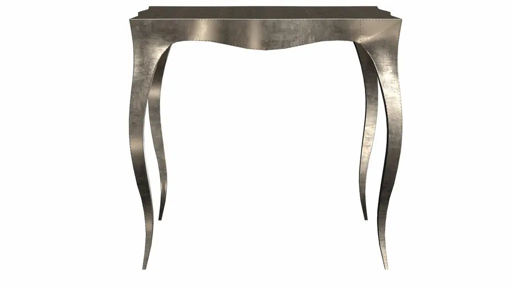 Louis Card Tables from our Louise Collection. The renowned designer Paul Mathieu chose the name “Louise” when he created his more feminine version of Louis XV (1730-1760) furniture. The characteristic cabriole leg, curving outward at the knee and inward towards the foot in an "S" shape was born during this period. It is during the same era that English furniture makers produced the Queen Anne and Chippendale styles.Crafted with utmost care and attention to detail, these Louis Card Tables are made to order and are available in twelve metal clad finishes, ensuring that you can choose the perfect one to match your individual style and taste. The use of high-quality materials and expert craftsmanship ensure that each Art Deco Louis Card Tables is not only beautiful but also a true piece of art.The curved legs and side arms of this Art Deco Louis Card Tables are hand carved from solid pieces of teak. Pattern makers trace and cut complex forms that will cover the chair in a skin of copper, white bronze, brass or antiqued white bronze The metal finishes will tarnish over time. Regular non-abrasive household metal polishes can be used to restore the original luster.Overall, if you're looking for a piece of furniture that combines luxury, comfort, and style, then the Art Deco Card Tables is an excellent choice. With its distinctive curved profile and multiple finish options, this Chair set is sure to elevate the look of any room it is placed in, and be a beloved addition to your home for years to come.The images shown in this listing are shot in different lighting conditions and/or are 3D illustrations. We encourage our customers to please request a sample or a full sample set of 12 finishes so that they can experience the finish first hand. Louise Art Nouveau Vanities Tables Smooth Antique Bronze by Paul Mathieu for Stephanie OdegardSize- 32"x 32"x 30"HMaterials - White Bronze, Metal sheet, Teak, Wood, MetalTechniques: Hand-Crafted, Hand-Carved, Metal Work, Wood Work, Metal Wrapping, PolishedPlease note that moisture in air, sudden change in temperature and natural movement of wood over time causes the metal to wrinkle or bubble up. We use well seasoned, reclaimed teak and high quality marine grade MDF (wherever technically possible) to avoid and delay the mentioned changes. However a perfect stability of metal cannot be guaranteed. Please note that our smooth finish metal clad pieces will have some unavoidable tool marks. This is proof that everything is done by hand. The smooth finish will not come out like a machine made perfect surface and the master artisan will do their best to make it look as good/clean/stable/perfect as he possibly can.The antique white bronze finish is hand done by using an acidic chemical over the white bronze finish to recreate a natural patination. Like with the natural patination of silver, copper, or brass, the final result and color uniformity of the patina cannot be guaranteed. The goal of this finish is to achieve rainbow-like shades with dull, shiny, cloudy, and streaky patches to give an illusion of antiquing. Please note:None of our metal clad pieces are treated with a protective “finish” thus enabling the items to age naturally over time. We will of course polish them well before we pack them. a) Copper oxidizes faster than the other metals. In six to twelve months it will most likely lose its shine and will gradually turn to different shades of brown and/or green/blue. This aging process and its effect is referred to as verdigris. After a year the piece should not change much more. Copper does not rust, but does require periodic cleaning in order to retain its original shine if that the preferred option. ('BRASSO' or any known copper polish can be used to polish copper).b) Brass retains its shine for far longer than others, but will tarnish if not cleaned on occasion. ('BRASSO' is made to polish brass).c) White bronze, has the least tendency to show age or tarnish. If kept in a controlled climate, this metal will hold its shine for years. It can be cleaned with a cleanser and polished with a cloth. d) The antiqued white bronze finish will react with the natural elements the fastest in the beginning but it too will stop reacting and will settle down in a stable state like copper after 6-12 months. Since it is already antiqued and looked like it is tarnished, as described in an earlier message, this fast reaction will not change the over all look. In that way this surface is most forgiving. The images shown in this listing are shot in different lighting conditions and/or are 3D illustrations. We encourage our customers to please request a sample or a full sample set of 12 finishes so that they can experience the finish first hand.