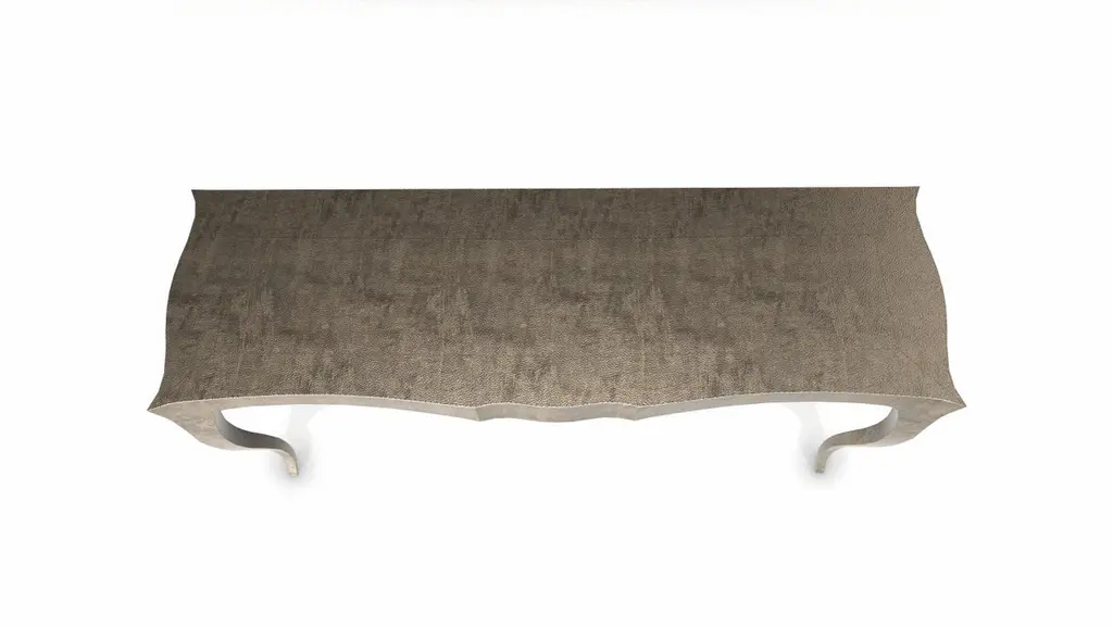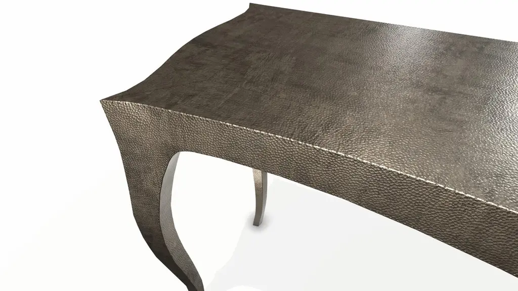 Louise Console Table from our Louise Collection. The renowned designer Paul Mathieu chose the name “Louise” when he created his more feminine version of Louis XV (1730-1760) furniture. The characteristic cabriole leg, curving outward at the knee and inward towards the foot in an "S" shape was born during this period. It is during the same era that English furniture makers produced the Queen Anne and Chippendale styles.Crafted with utmost care and attention to detail, these Louis Card Tables are made to order and are available in twelve metal clad finishes, ensuring that you can choose the perfect one to match your individual style and taste. The use of high-quality materials and expert craftsmanship ensure that each Art Deco Louis Card Tables is not only beautiful but also a true piece of Art.The curved legs and side arms of this Art Deco Louis Card Tables are hand carved from solid pieces of teak. Pattern makers trace and cut complex forms that will cover the chair in a skin of copper, white bronze, brass or antiqued white bronze The metal finishes will tarnish over time. Regular non-abrasive household metal polishes can be used to restore the original luster.Overall, if you're looking for a piece of furniture that combines luxury, comfort, and style, then the Art Deco Card Tables is an excellent choice. With its distinctive curved profile and multiple finish options, this Chair set is sure to elevate the look of any room it is placed in, and be a beloved addition to your home for years to come.The images shown in this listing are shot in different lighting conditions and/or are 3D illustrations. We encourage our customers to please request a sample or a full sample set of 12 finishes so that they can experience the finish first hand. Louise Console Art Deco Card and Tea Tables Mid. Hammered Antique Bronze by Paul Mathieu for Stephanie OdegardSize- 60"x 18.5"x 30"HMaterials - Antique Bronze, Metal sheet, Teak, Wood, MetalTechniques: Hand-Crafted, Hand-Carved, Metal Work, Wood Work, Metal Wrapping, PolishedPlease note that moisture in air, sudden change in temperature and natural movement of wood over time causes the metal to wrinkle or bubble up. We use well seasoned, reclaimed teak and high quality marine grade MDF (wherever technically possible) to avoid and delay the mentioned changes. However a perfect stability of metal cannot be guaranteed. Please note that our smooth finish metal clad pieces will have some unavoidable tool marks. This is proof that everything is done by hand. The smooth finish will not come out like a machine made perfect surface and the master Artisan will do their best to make it look as good/clean/stable/perfect as he possibly can.The antique white bronze finish is hand done by using an acidic chemical over the white bronze finish to recreate a natural patination. Like with the natural patination of silver, copper, or brass, the final result and color uniformity of the patina cannot be guaranteed. The goal of this finish is to achieve rainbow-like shades with dull, shiny, cloudy, and streaky patches to give an illusion of antiquing. Please note:None of our metal clad pieces are treated with a protective “finish” thus enabling the items to age naturally over time. We will of course polish them well before we pack them. a) Copper oxidizes faster than the other metals. In six to twelve months it will most likely lose its shine and will gradually turn to different shades of brown and/or green/blue. This aging process and its effect is referred to as verdigris. After a year the piece should not change much more. Copper does not rust, but does require periodic cleaning in order to retain its original shine if that the preferred option. ('BRASSO' or any known copper polish can be used to polish copper).b) Brass retains its shine for far longer than others, but will tarnish if not cleaned on occasion. ('BRASSO' is made to polish brass).c) White bronze, has the least tendency to show age or tarnish. If kept in a controlled climate, this metal will hold its shine for years. It can be cleaned with a cleanser and polished with a cloth. d) The antiqued white bronze finish will react with the natural elements the fastest in the beginning but it too will stop reacting and will settle down in a stable state like copper after 6-12 months. Since it is already antiqued and looked like it is tarnished, as described in an earlier message, this fast reaction will not change the over all look. In that way this surface is most forgiving. The images shown in this listing are shot in different lighting conditions and/or are 3D illustrations. We encourage our customers to please request a sample or a full sample set of 12 finishes so that they can experience the finish first hand.