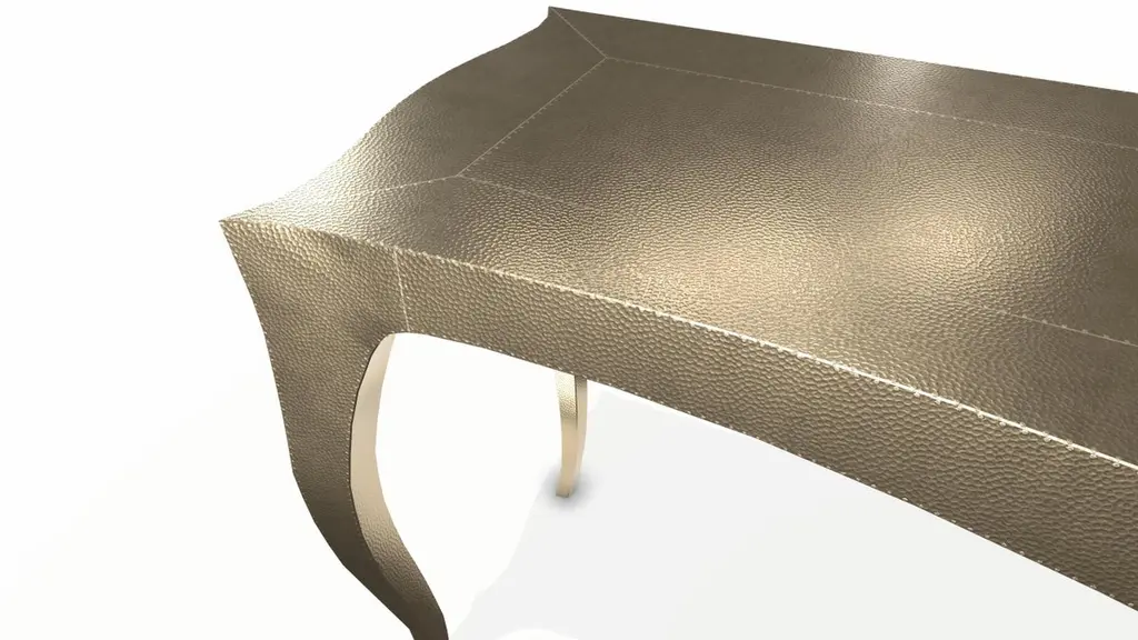 Louise Console Table from our Louise Collection. The renowned designer Paul Mathieu chose the name “Louise” when he created his more feminine version of Louis XV (1730-1760) furniture. The characteristic cabriole leg, curving outward at the knee and inward towards the foot in an "S" shape was born during this period. It is during the same era that English furniture makers produced the Queen Anne and Chippendale styles.Crafted with utmost care and attention to detail, these Louis Card Tables are made to order and are available in twelve metal clad finishes, ensuring that you can choose the perfect one to match your individual style and taste. The use of high-quality materials and expert craftsmanship ensure that each Art Deco Louis Card Tables is not only beautiful but also a true piece of Art.The curved legs and side arms of this Art Deco Louis Card Tables are hand carved from solid pieces of teak. Pattern makers trace and cut complex forms that will cover the chair in a skin of copper, white bronze, brass or antiqued white bronze The metal finishes will tarnish over time. Regular non-abrasive household metal polishes can be used to restore the original luster.Overall, if you're looking for a piece of furniture that combines luxury, comfort, and style, then the Art Deco Card Tables is an excellent choice. With its distinctive curved profile and multiple finish options, this Chair set is sure to elevate the look of any room it is placed in, and be a beloved addition to your home for years to come.The images shown in this listing are shot in different lighting conditions and/or are 3D illustrations. We encourage our customers to please request a sample or a full sample set of 12 finishes so that they can experience the finish first hand. Louise Console Art Deco Card and Tea Tables Mid. Hammered Brass by Paul Mathieu for Stephanie OdegardSize- 60"x 18.5"x 30"HMaterials - Brass, Metal sheet, Teak, Wood, MetalTechniques: Hand-Crafted, Hand-Carved, Metal Work, Wood Work, Metal Wrapping, PolishedPlease note that moisture in air, sudden change in temperature and natural movement of wood over time causes the metal to wrinkle or bubble up. We use well seasoned, reclaimed teak and high quality marine grade MDF (wherever technically possible) to avoid and delay the mentioned changes. However a perfect stability of metal cannot be guaranteed. Please note that our smooth finish metal clad pieces will have some unavoidable tool marks. This is proof that everything is done by hand. The smooth finish will not come out like a machine made perfect surface and the master Artisan will do their best to make it look as good/clean/stable/perfect as he possibly can.The antique white bronze finish is hand done by using an acidic chemical over the white bronze finish to recreate a natural patination. Like with the natural patination of silver, copper, or brass, the final result and color uniformity of the patina cannot be guaranteed. The goal of this finish is to achieve rainbow-like shades with dull, shiny, cloudy, and streaky patches to give an illusion of antiquing. Please note:None of our metal clad pieces are treated with a protective “finish” thus enabling the items to age naturally over time. We will of course polish them well before we pack them. a) Copper oxidizes faster than the other metals. In six to twelve months it will most likely lose its shine and will gradually turn to different shades of brown and/or green/blue. This aging process and its effect is referred to as verdigris. After a year the piece should not change much more. Copper does not rust, but does require periodic cleaning in order to retain its original shine if that the preferred option. ('BRASSO' or any known copper polish can be used to polish copper).b) Brass retains its shine for far longer than others, but will tarnish if not cleaned on occasion. ('BRASSO' is made to polish brass).c) White bronze, has the least tendency to show age or tarnish. If kept in a controlled climate, this metal will hold its shine for years. It can be cleaned with a cleanser and polished with a cloth. d) The antiqued white bronze finish will react with the natural elements the fastest in the beginning but it too will stop reacting and will settle down in a stable state like copper after 6-12 months. Since it is already antiqued and looked like it is tarnished, as described in an earlier message, this fast reaction will not change the over all look. In that way this surface is most forgiving. The images shown in this listing are shot in different lighting conditions and/or are 3D illustrations. We encourage our customers to please request a sample or a full sample set of 12 finishes so that they can experience the finish first hand.