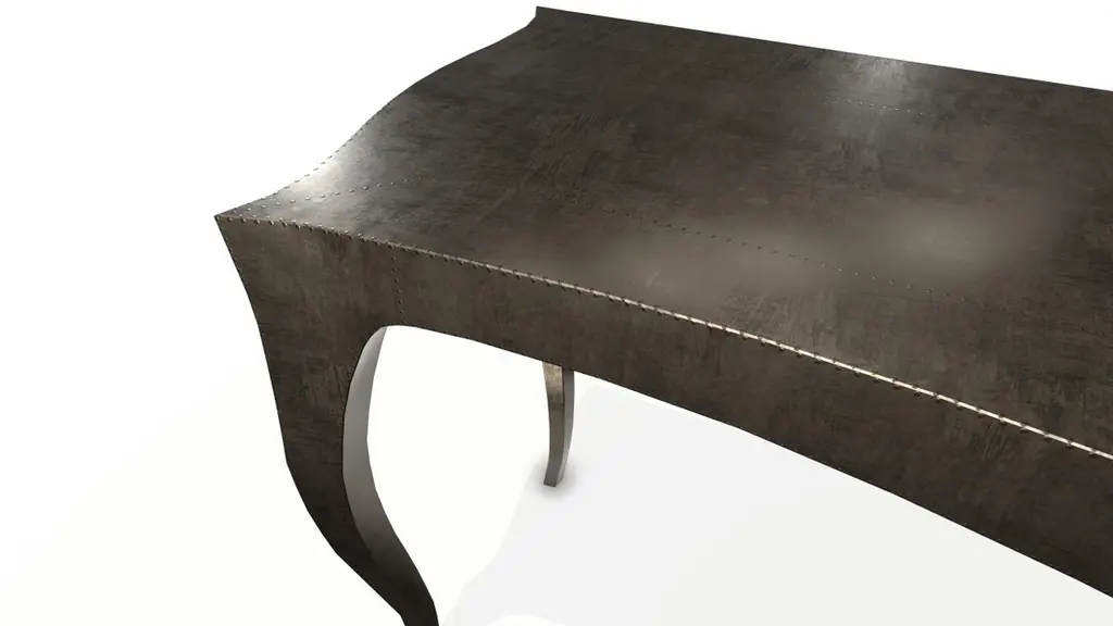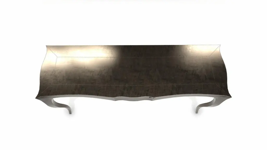Louise Console Table from our Louise Collection. The renowned designer Paul Mathieu chose the name “Louise” when he created his more feminine version of Louis XV (1730-1760) furniture. The characteristic cabriole leg, curving outward at the knee and inward towards the foot in an "S" shape was born during this period. It is during the same era that English furniture makers produced the Queen Anne and Chippendale styles.Crafted with utmost care and attention to detail, these Louis Card Tables are made to order and are available in twelve metal clad finishes, ensuring that you can choose the perfect one to match your individual style and taste. The use of high-quality materials and expert craftsmanship ensure that each Art Deco Louis Card Tables is not only beautiful but also a true piece of Art.The curved legs and side arms of this Art Deco Louis Card Tables are hand carved from solid pieces of teak. Pattern makers trace and cut complex forms that will cover the chair in a skin of copper, white bronze, brass or antiqued white bronze The metal finishes will tarnish over time. Regular non-abrasive household metal polishes can be used to restore the original luster.Overall, if you're looking for a piece of furniture that combines luxury, comfort, and style, then the Art Deco Card Tables is an excellent choice. With its distinctive curved profile and multiple finish options, this Chair set is sure to elevate the look of any room it is placed in, and be a beloved addition to your home for years to come.The images shown in this listing are shot in different lighting conditions and/or are 3D illustrations. We encourage our customers to please request a sample or a full sample set of 12 finishes so that they can experience the finish first hand. Louise Console Art Deco Card and Tea Tables Smooth Antique Bronze by Paul Mathieu for Stephanie OdegardSize- 60"x 18.5"x 30"HMaterials - Antique Bronze, Metal sheet, Teak, Wood, MetalTechniques: Hand-Crafted, Hand-Carved, Metal Work, Wood Work, Metal Wrapping, PolishedPlease note that moisture in air, sudden change in temperature and natural movement of wood over time causes the metal to wrinkle or bubble up. We use well seasoned, reclaimed teak and high quality marine grade MDF (wherever technically possible) to avoid and delay the mentioned changes. However a perfect stability of metal cannot be guaranteed. Please note that our smooth finish metal clad pieces will have some unavoidable tool marks. This is proof that everything is done by hand. The smooth finish will not come out like a machine made perfect surface and the master Artisan will do their best to make it look as good/clean/stable/perfect as he possibly can.The antique white bronze finish is hand done by using an acidic chemical over the white bronze finish to recreate a natural patination. Like with the natural patination of silver, copper, or brass, the final result and color uniformity of the patina cannot be guaranteed. The goal of this finish is to achieve rainbow-like shades with dull, shiny, cloudy, and streaky patches to give an illusion of antiquing. Please note:None of our metal clad pieces are treated with a protective “finish” thus enabling the items to age naturally over time. We will of course polish them well before we pack them. a) Copper oxidizes faster than the other metals. In six to twelve months it will most likely lose its shine and will gradually turn to different shades of brown and/or green/blue. This aging process and its effect is referred to as verdigris. After a year the piece should not change much more. Copper does not rust, but does require periodic cleaning in order to retain its original shine if that the preferred option. ('BRASSO' or any known copper polish can be used to polish copper).b) Brass retains its shine for far longer than others, but will tarnish if not cleaned on occasion. ('BRASSO' is made to polish brass).c) White bronze, has the least tendency to show age or tarnish. If kept in a controlled climate, this metal will hold its shine for years. It can be cleaned with a cleanser and polished with a cloth. d) The antiqued white bronze finish will react with the natural elements the fastest in the beginning but it too will stop reacting and will settle down in a stable state like copper after 6-12 months. Since it is already antiqued and looked like it is tarnished, as described in an earlier message, this fast reaction will not change the over all look. In that way this surface is most forgiving. The images shown in this listing are shot in different lighting conditions and/or are 3D illustrations. We encourage our customers to please request a sample or a full sample set of 12 finishes so that they can experience the finish first hand.