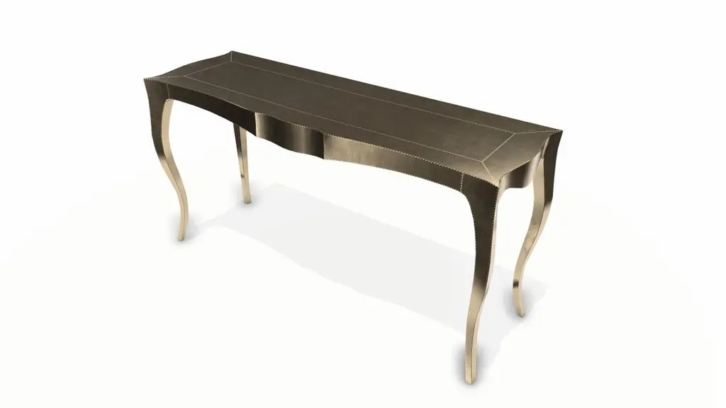 Louise Console Table from our Louise Collection. The renowned designer Paul Mathieu chose the name “Louise” when he created his more feminine version of Louis XV (1730-1760) furniture. The characteristic cabriole leg, curving outward at the knee and inward towards the foot in an "S" shape was born during this period. It is during the same era that English furniture makers produced the Queen Anne and Chippendale styles.Crafted with utmost care and attention to detail, these Louis Card Tables are made to order and are available in twelve metal clad finishes, ensuring that you can choose the perfect one to match your individual style and taste. The use of high-quality materials and expert craftsmanship ensure that each Art Deco Louis Card Tables is not only beautiful but also a true piece of Art.The curved legs and side arms of this Art Deco Louis Card Tables are hand carved from solid pieces of teak. Pattern makers trace and cut complex forms that will cover the chair in a skin of copper, white bronze, brass or antiqued white bronze The metal finishes will tarnish over time. Regular non-abrasive household metal polishes can be used to restore the original luster.Overall, if you're looking for a piece of furniture that combines luxury, comfort, and style, then the Art Deco Card Tables is an excellent choice. With its distinctive curved profile and multiple finish options, this Chair set is sure to elevate the look of any room it is placed in, and be a beloved addition to your home for years to come.The images shown in this listing are shot in different lighting conditions and/or are 3D illustrations. We encourage our customers to please request a sample or a full sample set of 12 finishes so that they can experience the finish first hand. Louise Console Art Deco Card and Tea Tables Smooth Brass by Paul Mathieu for Stephanie OdegardSize- 60"x 18.5"x 30"HMaterials - Brass, Metal sheet, Teak, Wood, MetalTechniques: Hand-Crafted, Hand-Carved, Metal Work, Wood Work, Metal Wrapping, PolishedPlease note that moisture in air, sudden change in temperature and natural movement of wood over time causes the metal to wrinkle or bubble up. We use well seasoned, reclaimed teak and high quality marine grade MDF (wherever technically possible) to avoid and delay the mentioned changes. However a perfect stability of metal cannot be guaranteed. Please note that our smooth finish metal clad pieces will have some unavoidable tool marks. This is proof that everything is done by hand. The smooth finish will not come out like a machine made perfect surface and the master Artisan will do their best to make it look as good/clean/stable/perfect as he possibly can.The antique white bronze finish is hand done by using an acidic chemical over the white bronze finish to recreate a natural patination. Like with the natural patination of silver, copper, or brass, the final result and color uniformity of the patina cannot be guaranteed. The goal of this finish is to achieve rainbow-like shades with dull, shiny, cloudy, and streaky patches to give an illusion of antiquing. Please note:None of our metal clad pieces are treated with a protective “finish” thus enabling the items to age naturally over time. We will of course polish them well before we pack them. a) Copper oxidizes faster than the other metals. In six to twelve months it will most likely lose its shine and will gradually turn to different shades of brown and/or green/blue. This aging process and its effect is referred to as verdigris. After a year the piece should not change much more. Copper does not rust, but does require periodic cleaning in order to retain its original shine if that the preferred option. ('BRASSO' or any known copper polish can be used to polish copper).b) Brass retains its shine for far longer than others, but will tarnish if not cleaned on occasion. ('BRASSO' is made to polish brass).c) White bronze, has the least tendency to show age or tarnish. If kept in a controlled climate, this metal will hold its shine for years. It can be cleaned with a cleanser and polished with a cloth. d) The antiqued white bronze finish will react with the natural elements the fastest in the beginning but it too will stop reacting and will settle down in a stable state like copper after 6-12 months. Since it is already antiqued and looked like it is tarnished, as described in an earlier message, this fast reaction will not change the over all look. In that way this surface is most forgiving. The images shown in this listing are shot in different lighting conditions and/or are 3D illustrations. We encourage our customers to please request a sample or a full sample set of 12 finishes so that they can experience the finish first hand.