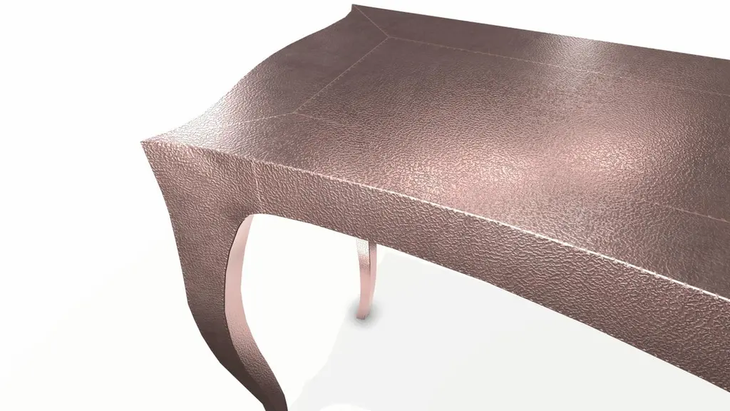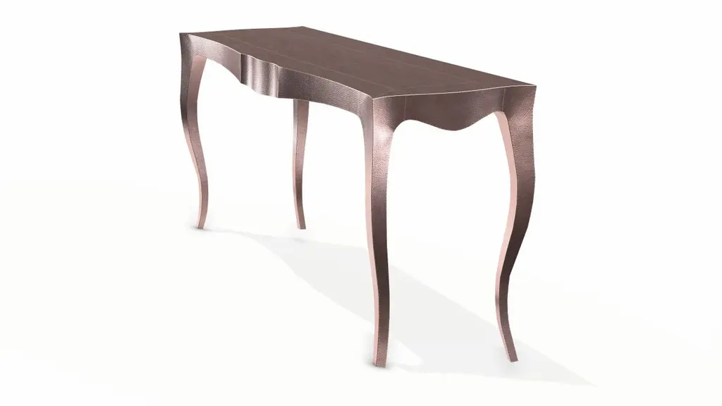 Louise Console Table from our Louise Collection. The renowned designer Paul Mathieu chose the name “Louise” when he created his more feminine version of Louis XV (1730-1760) furniture. The characteristic cabriole leg, curving outward at the knee and inward towards the foot in an "S" shape was born during this period. It is during the same era that English furniture makers produced the Queen Anne and Chippendale styles.Crafted with utmost care and attention to detail, these Louis Card Tables are made to order and are available in twelve metal clad finishes, ensuring that you can choose the perfect one to match your individual style and taste. The use of high-quality materials and expert craftsmanship ensure that each Art Deco Louis Card Tables is not only beautiful but also a true piece of Art.The curved legs and side arms of this Art Deco Louis Card Tables are hand carved from solid pieces of teak. Pattern makers trace and cut complex forms that will cover the chair in a skin of copper, white bronze, brass or antiqued white bronze The metal finishes will tarnish over time. Regular non-abrasive household metal polishes can be used to restore the original luster.Overall, if you're looking for a piece of furniture that combines luxury, comfort, and style, then the Art Deco Card Tables is an excellent choice. With its distinctive curved profile and multiple finish options, this Chair set is sure to elevate the look of any room it is placed in, and be a beloved addition to your home for years to come.The images shown in this listing are shot in different lighting conditions and/or are 3D illustrations. We encourage our customers to please request a sample or a full sample set of 12 finishes so that they can experience the finish first hand. Louise Console Art Deco Industrial and Work Table Fine Hammered Copper by Paul Mathieu for Stephanie OdegardSize- 60"x 18.5"x 30"HMaterials - Copper, Metal sheet, Teak, Wood, MetalTechniques: Hand-Crafted, Hand-Carved, Metal Work, Wood Work, Metal Wrapping, PolishedPlease note that moisture in air, sudden change in temperature and natural movement of wood over time causes the metal to wrinkle or bubble up. We use well seasoned, reclaimed teak and high quality marine grade MDF (wherever technically possible) to avoid and delay the mentioned changes. However a perfect stability of metal cannot be guaranteed. Please note that our smooth finish metal clad pieces will have some unavoidable tool marks. This is proof that everything is done by hand. The smooth finish will not come out like a machine made perfect surface and the master Artisan will do their best to make it look as good/clean/stable/perfect as he possibly can.The antique white bronze finish is hand done by using an acidic chemical over the white bronze finish to recreate a natural patination. Like with the natural patination of silver, copper, or brass, the final result and color uniformity of the patina cannot be guaranteed. The goal of this finish is to achieve rainbow-like shades with dull, shiny, cloudy, and streaky patches to give an illusion of antiquing. Please note:None of our metal clad pieces are treated with a protective “finish” thus enabling the items to age naturally over time. We will of course polish them well before we pack them. a) Copper oxidizes faster than the other metals. In six to twelve months it will most likely lose its shine and will gradually turn to different shades of brown and/or green/blue. This aging process and its effect is referred to as verdigris. After a year the piece should not change much more. Copper does not rust, but does require periodic cleaning in order to retain its original shine if that the preferred option. ('BRASSO' or any known copper polish can be used to polish copper).b) Brass retains its shine for far longer than others, but will tarnish if not cleaned on occasion. ('BRASSO' is made to polish brass).c) White bronze, has the least tendency to show age or tarnish. If kept in a controlled climate, this metal will hold its shine for years. It can be cleaned with a cleanser and polished with a cloth. d) The antiqued white bronze finish will react with the natural elements the fastest in the beginning but it too will stop reacting and will settle down in a stable state like copper after 6-12 months. Since it is already antiqued and looked like it is tarnished, as described in an earlier message, this fast reaction will not change the over all look. In that way this surface is most forgiving. The images shown in this listing are shot in different lighting conditions and/or are 3D illustrations. We encourage our customers to please request a sample or a full sample set of 12 finishes so that they can experience the finish first hand.