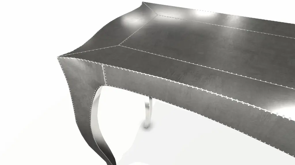 Louise Console Table from our Louise Collection. The renowned designer Paul Mathieu chose the name “Louise” when he created his more feminine version of Louis XV (1730-1760) furniture. The characteristic cabriole leg, curving outward at the knee and inward towards the foot in an "S" shape was born during this period. It is during the same era that English furniture makers produced the Queen Anne and Chippendale styles.Crafted with utmost care and attention to detail, these Louis Card Tables are made to order and are available in twelve metal clad finishes, ensuring that you can choose the perfect one to match your individual style and taste. The use of high-quality materials and expert craftsmanship ensure that each Art Deco Louis Card Tables is not only beautiful but also a true piece of Art.The curved legs and side arms of this Art Deco Louis Card Tables are hand carved from solid pieces of teak. Pattern makers trace and cut complex forms that will cover the chair in a skin of copper, white bronze, brass or antiqued white bronze The metal finishes will tarnish over time. Regular non-abrasive household metal polishes can be used to restore the original luster.Overall, if you're looking for a piece of furniture that combines luxury, comfort, and style, then the Art Deco Card Tables is an excellent choice. With its distinctive curved profile and multiple finish options, this Chair set is sure to elevate the look of any room it is placed in, and be a beloved addition to your home for years to come.The images shown in this listing are shot in different lighting conditions and/or are 3D illustrations. We encourage our customers to please request a sample or a full sample set of 12 finishes so that they can experience the finish first hand. Louise Console Art Deco Industrial and Work Tables Smooth White Bronze by Paul Mathieu for Stephanie OdegardSize- 60"x 18.5"x 30"HMaterials - White Bronze, Metal sheet, Teak, Wood, MetalTechniques: Hand-Crafted, Hand-Carved, Metal Work, Wood Work, Metal Wrapping, PolishedPlease note that moisture in air, sudden change in temperature and natural movement of wood over time causes the metal to wrinkle or bubble up. We use well seasoned, reclaimed teak and high quality marine grade MDF (wherever technically possible) to avoid and delay the mentioned changes. However a perfect stability of metal cannot be guaranteed. Please note that our smooth finish metal clad pieces will have some unavoidable tool marks. This is proof that everything is done by hand. The smooth finish will not come out like a machine made perfect surface and the master Artisan will do their best to make it look as good/clean/stable/perfect as he possibly can.The antique white bronze finish is hand done by using an acidic chemical over the white bronze finish to recreate a natural patination. Like with the natural patination of silver, copper, or brass, the final result and color uniformity of the patina cannot be guaranteed. The goal of this finish is to achieve rainbow-like shades with dull, shiny, cloudy, and streaky patches to give an illusion of antiquing. Please note:None of our metal clad pieces are treated with a protective “finish” thus enabling the items to age naturally over time. We will of course polish them well before we pack them. a) Copper oxidizes faster than the other metals. In six to twelve months it will most likely lose its shine and will gradually turn to different shades of brown and/or green/blue. This aging process and its effect is referred to as verdigris. After a year the piece should not change much more. Copper does not rust, but does require periodic cleaning in order to retain its original shine if that the preferred option. ('BRASSO' or any known copper polish can be used to polish copper).b) Brass retains its shine for far longer than others, but will tarnish if not cleaned on occasion. ('BRASSO' is made to polish brass).c) White bronze, has the least tendency to show age or tarnish. If kept in a controlled climate, this metal will hold its shine for years. It can be cleaned with a cleanser and polished with a cloth. d) The antiqued white bronze finish will react with the natural elements the fastest in the beginning but it too will stop reacting and will settle down in a stable state like copper after 6-12 months. Since it is already antiqued and looked like it is tarnished, as described in an earlier message, this fast reaction will not change the over all look. In that way this surface is most forgiving. The images shown in this listing are shot in different lighting conditions and/or are 3D illustrations. We encourage our customers to please request a sample or a full sample set of 12 finishes so that they can experience the finish first hand.