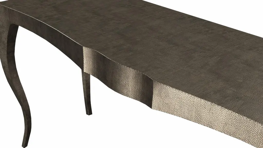 Louise Console Table from our Louise Collection. The renowned designer Paul Mathieu chose the name “Louise” when he created his more feminine version of Louis XV (1730-1760) furniture. The characteristic cabriole leg, curving outward at the knee and inward towards the foot in an "S" shape was born during this period. It is during the same era that English furniture makers produced the Queen Anne and Chippendale styles.Crafted with utmost care and attention to detail, these Louis Card Tables are made to order and are available in twelve metal clad finishes, ensuring that you can choose the perfect one to match your individual style and taste. The use of high-quality materials and expert craftsmanship ensure that each Art Deco Louis Card Tables is not only beautiful but also a true piece of Art.The curved legs and side arms of this Art Deco Louis Card Tables are hand carved from solid pieces of teak. Pattern makers trace and cut complex forms that will cover the chair in a skin of copper, white bronze, brass or antiqued white bronze The metal finishes will tarnish over time. Regular non-abrasive household metal polishes can be used to restore the original luster.Overall, if you're looking for a piece of furniture that combines luxury, comfort, and style, then the Art Deco Card Tables is an excellent choice. With its distinctive curved profile and multiple finish options, this Chair set is sure to elevate the look of any room it is placed in, and be a beloved addition to your home for years to come.The images shown in this listing are shot in different lighting conditions and/or are 3D illustrations. We encourage our customers to please request a sample or a full sample set of 12 finishes so that they can experience the finish first hand. Louise Console Art Industrial and Work Tables Mid. Hammered Antique Bronze by Paul Mathieu for Stephanie OdegardSize- 60"x 18.5"x 30"HMaterials - Antique Bronze, Metal sheet, Teak, Wood, MetalTechniques: Hand-Crafted, Hand-Carved, Metal Work, Wood Work, Metal Wrapping, PolishedPlease note that moisture in air, sudden change in temperature and natural movement of wood over time causes the metal to wrinkle or bubble up. We use well seasoned, reclaimed teak and high quality marine grade MDF (wherever technically possible) to avoid and delay the mentioned changes. However a perfect stability of metal cannot be guaranteed. Please note that our smooth finish metal clad pieces will have some unavoidable tool marks. This is proof that everything is done by hand. The smooth finish will not come out like a machine made perfect surface and the master Artisan will do their best to make it look as good/clean/stable/perfect as he possibly can.The antique white bronze finish is hand done by using an acidic chemical over the white bronze finish to recreate a natural patination. Like with the natural patination of silver, copper, or brass, the final result and color uniformity of the patina cannot be guaranteed. The goal of this finish is to achieve rainbow-like shades with dull, shiny, cloudy, and streaky patches to give an illusion of antiquing. Please note:None of our metal clad pieces are treated with a protective “finish” thus enabling the items to age naturally over time. We will of course polish them well before we pack them. a) Copper oxidizes faster than the other metals. In six to twelve months it will most likely lose its shine and will gradually turn to different shades of brown and/or green/blue. This aging process and its effect is referred to as verdigris. After a year the piece should not change much more. Copper does not rust, but does require periodic cleaning in order to retain its original shine if that the preferred option. ('BRASSO' or any known copper polish can be used to polish copper).b) Brass retains its shine for far longer than others, but will tarnish if not cleaned on occasion. ('BRASSO' is made to polish brass).c) White bronze, has the least tendency to show age or tarnish. If kept in a controlled climate, this metal will hold its shine for years. It can be cleaned with a cleanser and polished with a cloth. d) The antiqued white bronze finish will react with the natural elements the fastest in the beginning but it too will stop reacting and will settle down in a stable state like copper after 6-12 months. Since it is already antiqued and looked like it is tarnished, as described in an earlier message, this fast reaction will not change the over all look. In that way this surface is most forgiving. The images shown in this listing are shot in different lighting conditions and/or are 3D illustrations. We encourage our customers to please request a sample or a full sample set of 12 finishes so that they can experience the finish first hand.
