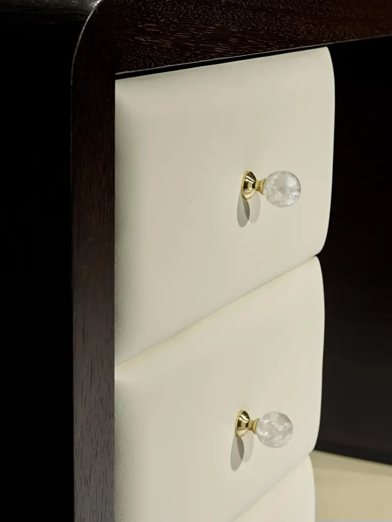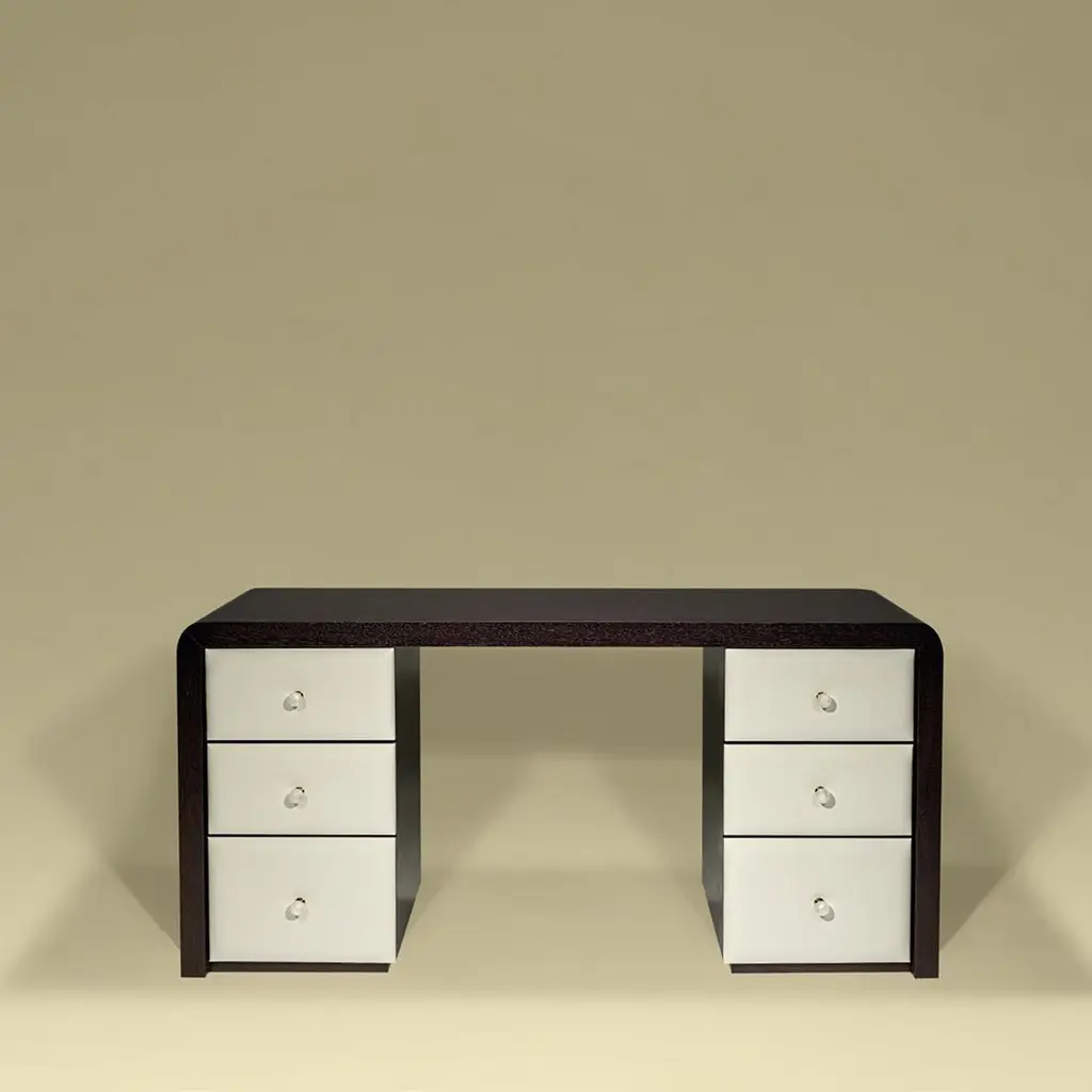 Desk in Wengé wood with glass handles and leather drawer frontsBespoke / CustomizableIdentical shapes with different sizes and finishings.All RAL colors available. (Mate / Half Gloss / Gloss).