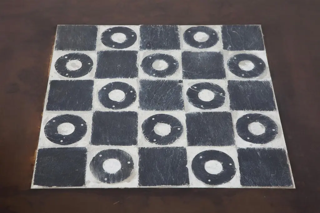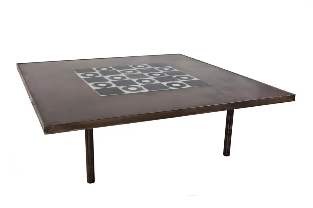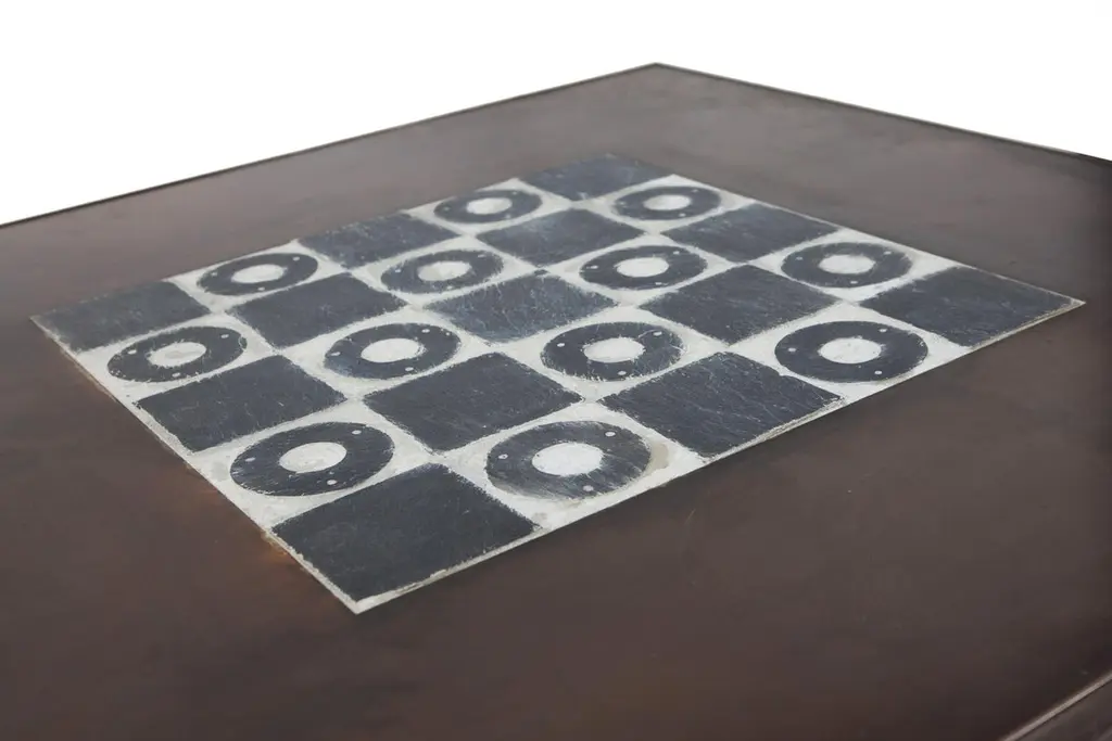 Low table made of steel, top blade in brass patinated with in the middle slates.