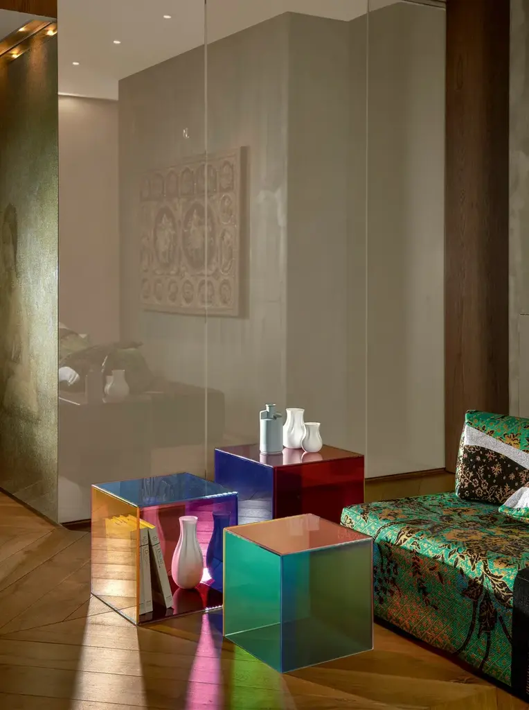 The Luce table by Giulio Cappellini & Antonio Facco represents the fruition of expertise, creativity and the sensibility to experiment with new uses for materials whilst maintaining an essential design.Volumes emphasized through transparency, playful use of colour, refracted nuances: this range of small tables made of extra-clear stratified coloured glass can revive any setting with the captivating allure of a prism.Luce side tables are available in three sizes and a fixed set of colours. When the open side is placed upwards or sideways, they can be transformed into sophisticated containers for the display of objects or magazines.Structure: 5 sheets of coloured and laminated extra-clear glassFinishes - set colour combination:- Red (Ral3003)- Bordeaux (Ral3005 )- Blue (Ral5003)- Yellow (Ral1003)- BlueFeet: transparent silicone rubberNotesThe table is provided with feet which can be fixed at the discretion of the customerThe table can be used with the open side to the ground, or with the upper open side, front or side, as a container of objects or magazines