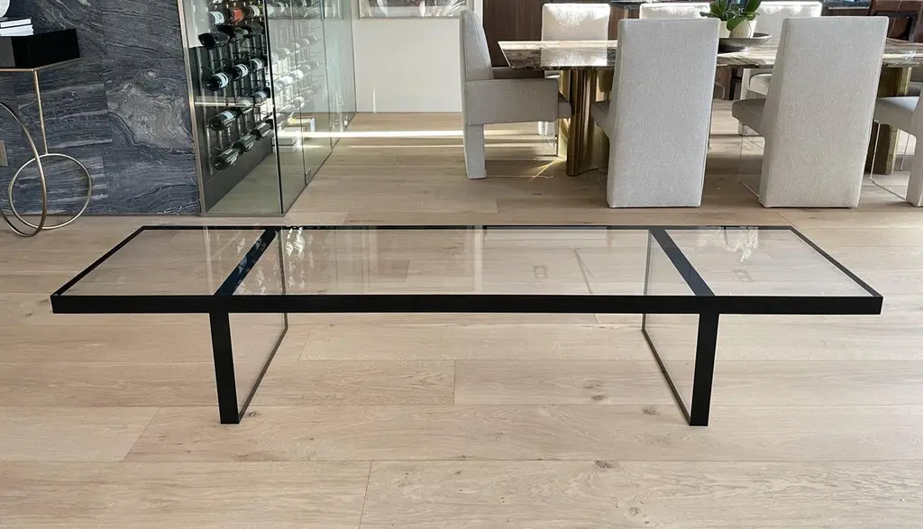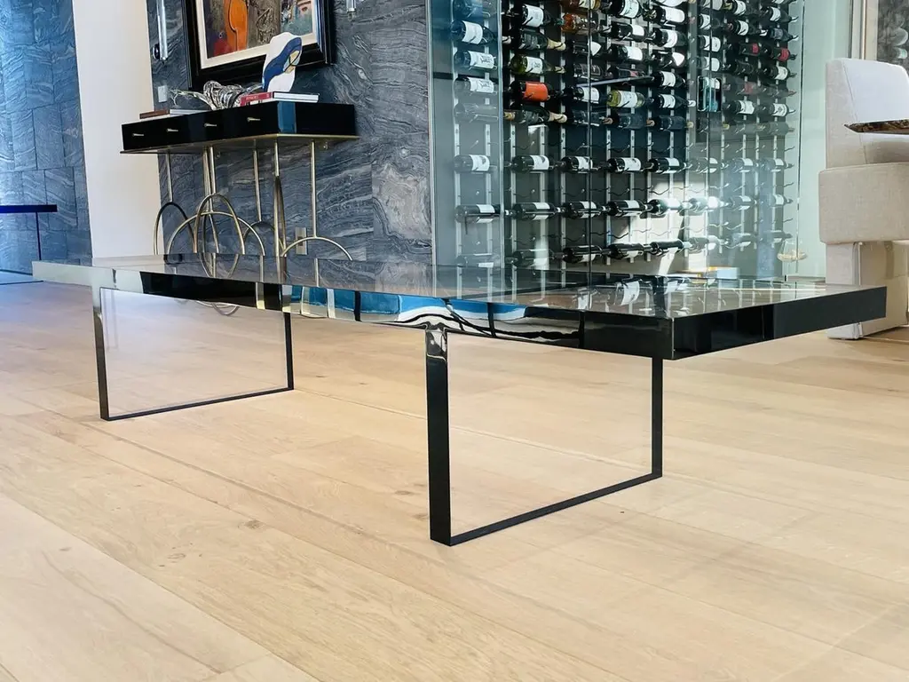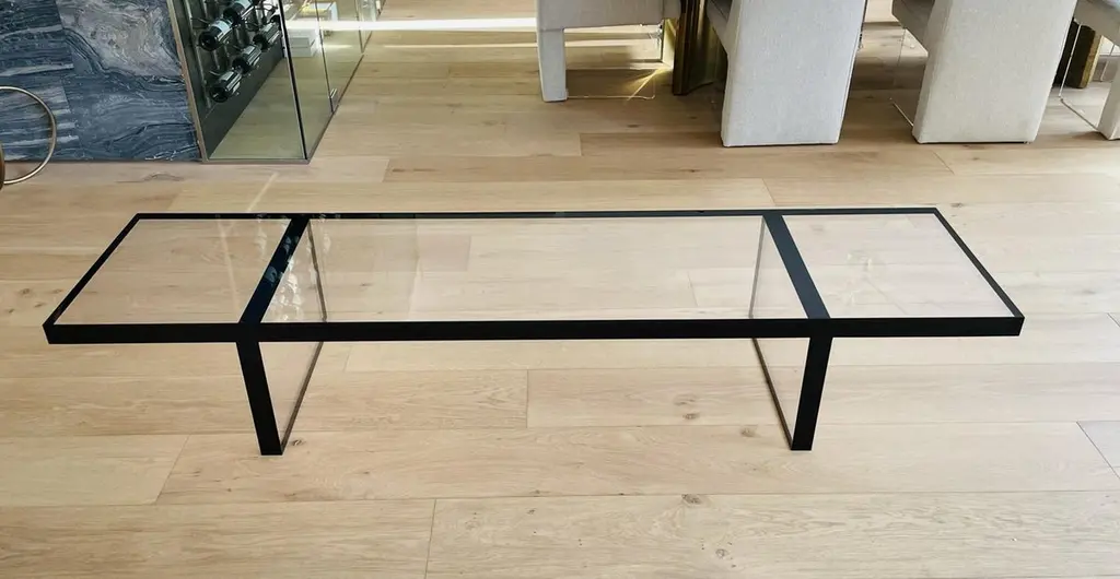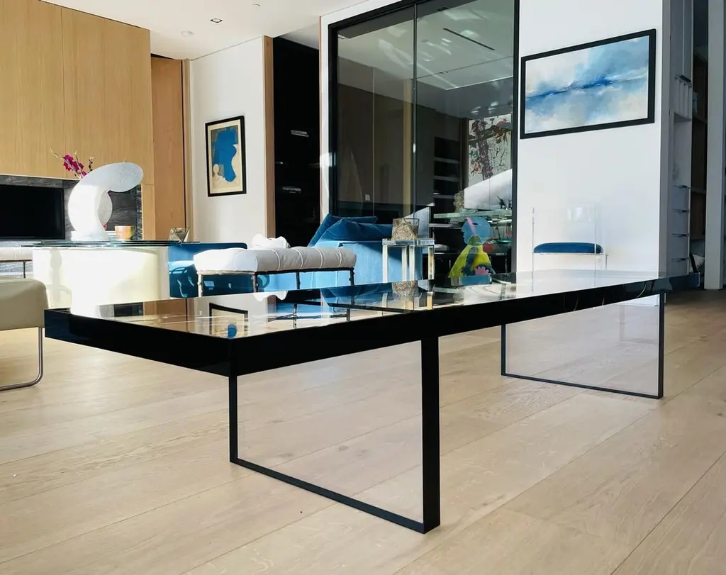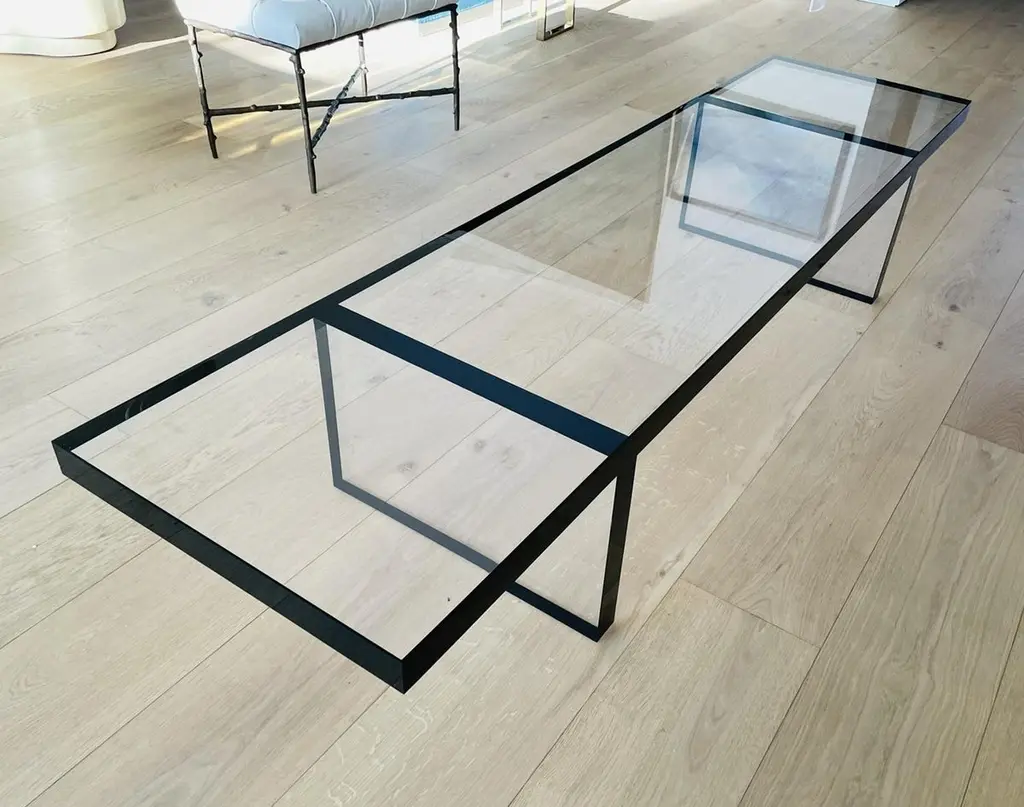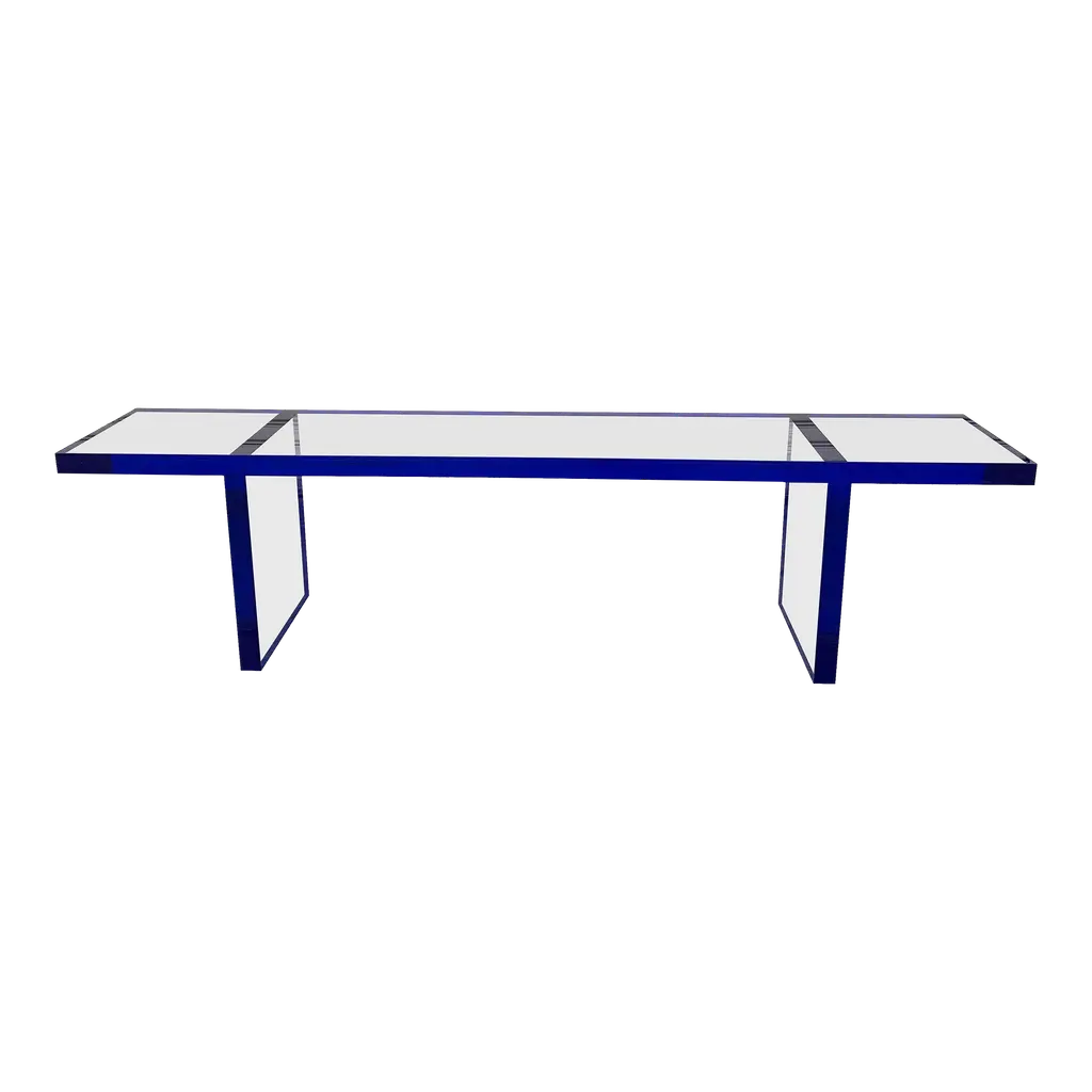 Introducing the Lucite Coffee Table / Bench in Clear & Black Lucite by Amparo Calderon Tapia! This stunning piece of furniture is a perfect blend of practicality and sophistication. Crafted from premium quality clear and black Lucite, this coffee table / bench will instantly elevate the aesthetic appeal of any living space.The bench/coffee table is hand crafted by skilled artisans in Los Angeles California, this bench is not only stylish but also built to last. Featuring a unique design with a 2 inch thick laminated Lucite, this coffee table / bench is both stylish and functional. the clear Lucite top allows you to showcase your favorite decorative items or coffee table books and when used as a bench it can easily accommodate up to 4 people comfortably.The Lucite Coffee Table / Bench in Clear & Black Lucite by Amparo Calderon Tapia is perfect for use as a coffee table or bench, making it a versatile addition to any living space. Whether you're hosting a party or simply relaxing with your family, this coffee table / bench is sure to become the centerpiece of your living room.So, if you are looking for a stylish and functional coffee table / bench that will add a touch of elegance to your living space, look no further.The piece can be customized to any size and we have many colors to choose from, contact us directly if you wish to order a custom piece.Lead time for this piece is 4-6 weeks.Measurements:84 inches wide x 21 inches deep x 15 inches high.Condition:Newly made.Disclaimer;Due to the nature of the material used to manufacture this bench, there will be some imperfections, specially around or under the lamination, this includes and is not limited to small air bubbles, glue residue, hairline scratches that happen during polishing and sizes may vary by 1/8" to 1/4".Lead time for other colors and sizes is 4-6 weeks.