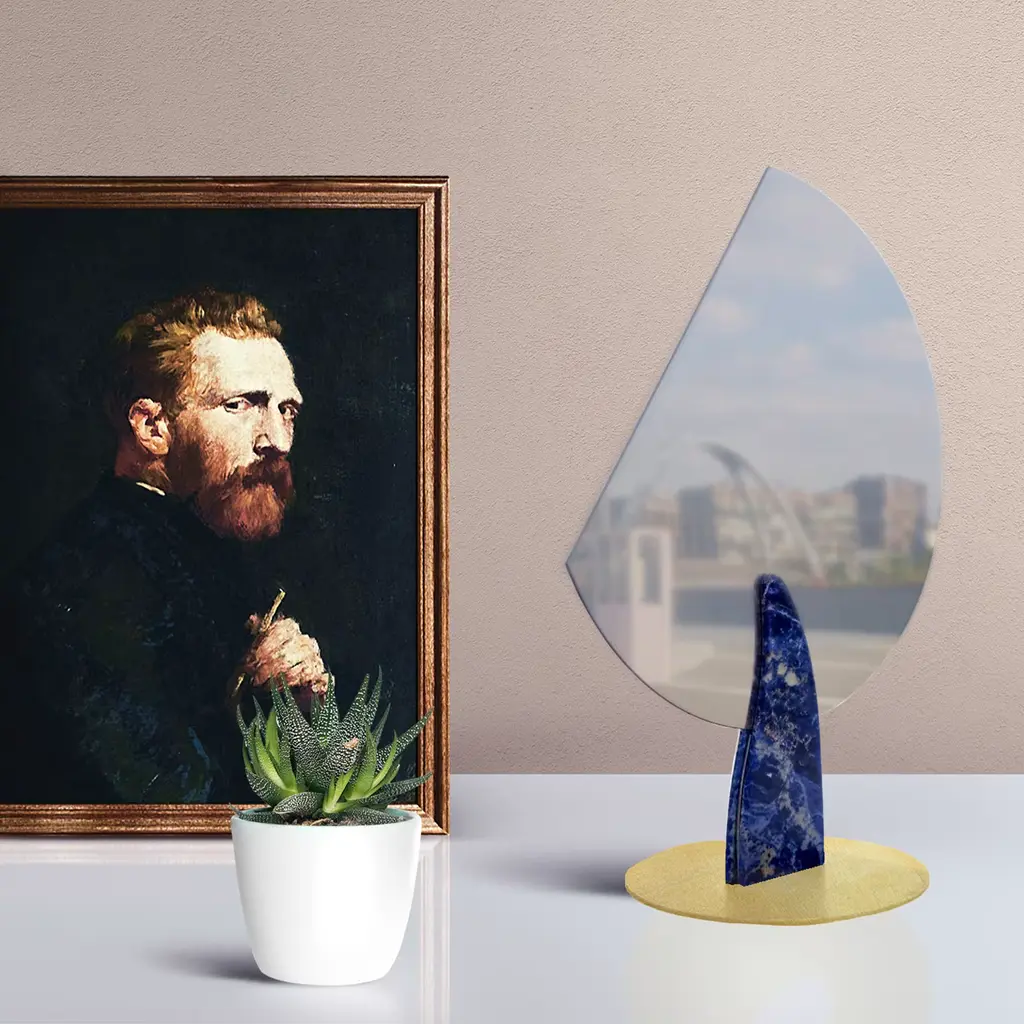The double mirror evokes the crescent moon supported by Blu Sodalite marble, its sky. Elegant, essential, winking, Luna combines the luminosity of glass, the wonder of marble and the stability of iron. The mirror is a dual element, in which one loses oneself and recognizes oneself, one discovers what is fleeting - beauty - and what is eternal - being, one distinguishes the dissimilar from the similar. Please, contact the Concierge for further information.