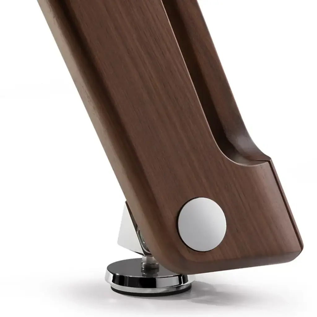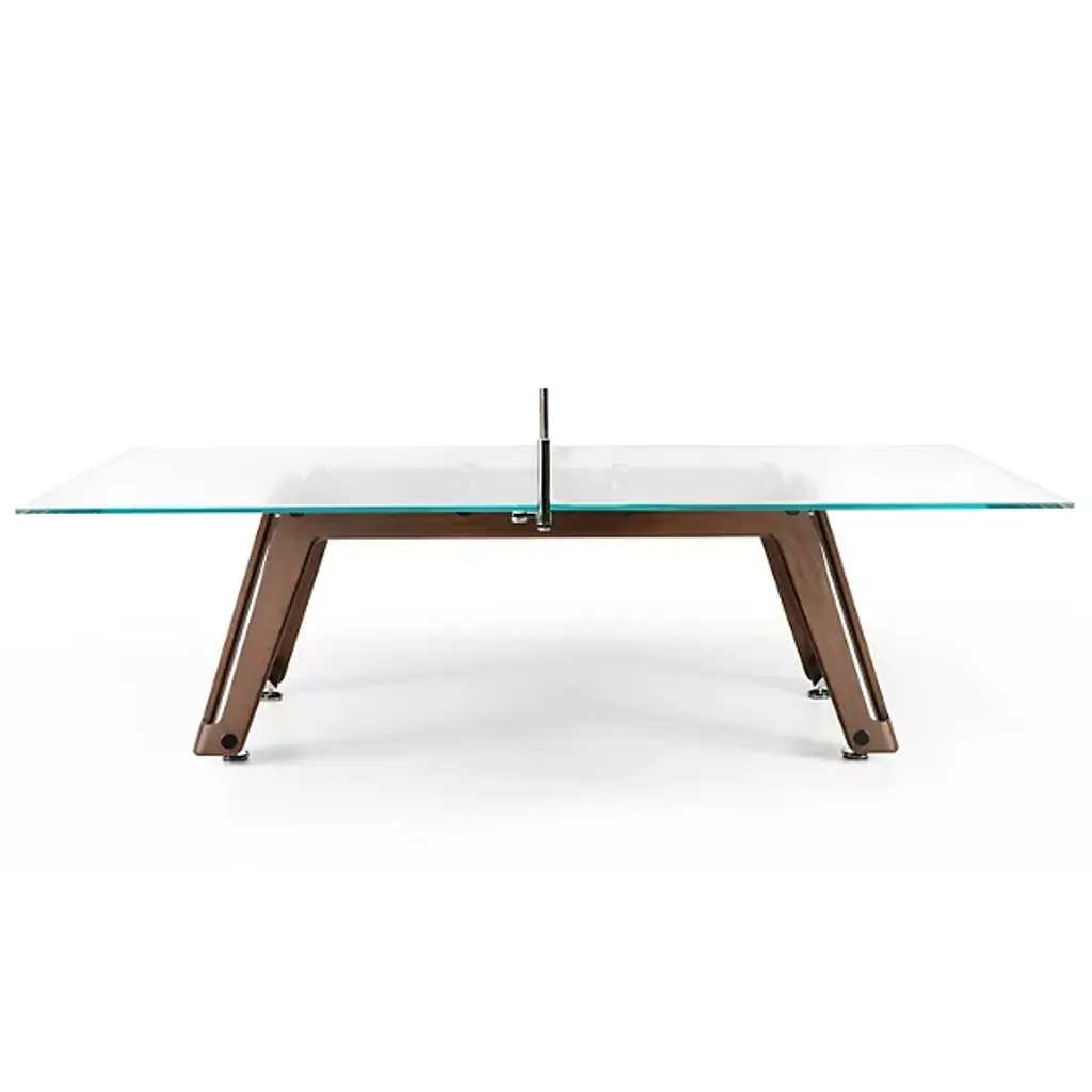 Fabulous and fun, the Lungolinea Ping Pong Table from Impatia brings a touch of welcome playfulness to spaces. An Olympic-sized table from Adriano Design, it’s assembled from softly-curved angular wooden bases with fine metal fittings, holding up the rectangular top of low-iron glass above, its clear surface remaining both strong and crystal clear. Every inch of this table is elegantly refined and uses sleek metal brackets to support a laser-cut net that stretches across its center point, marking the dividing line with a bold and cleverly wrought pattern that naturally draws the eye while contract-grade toughness keeps it going in high-use conditions.