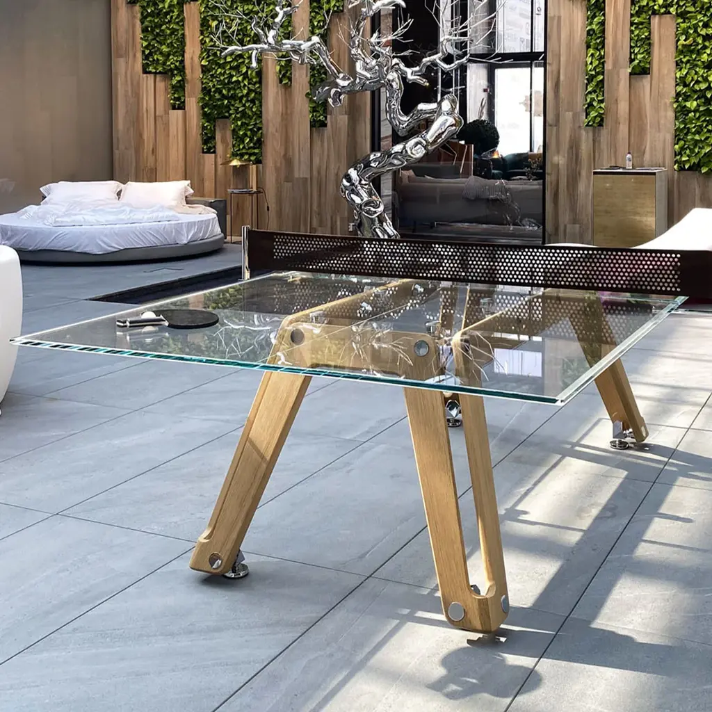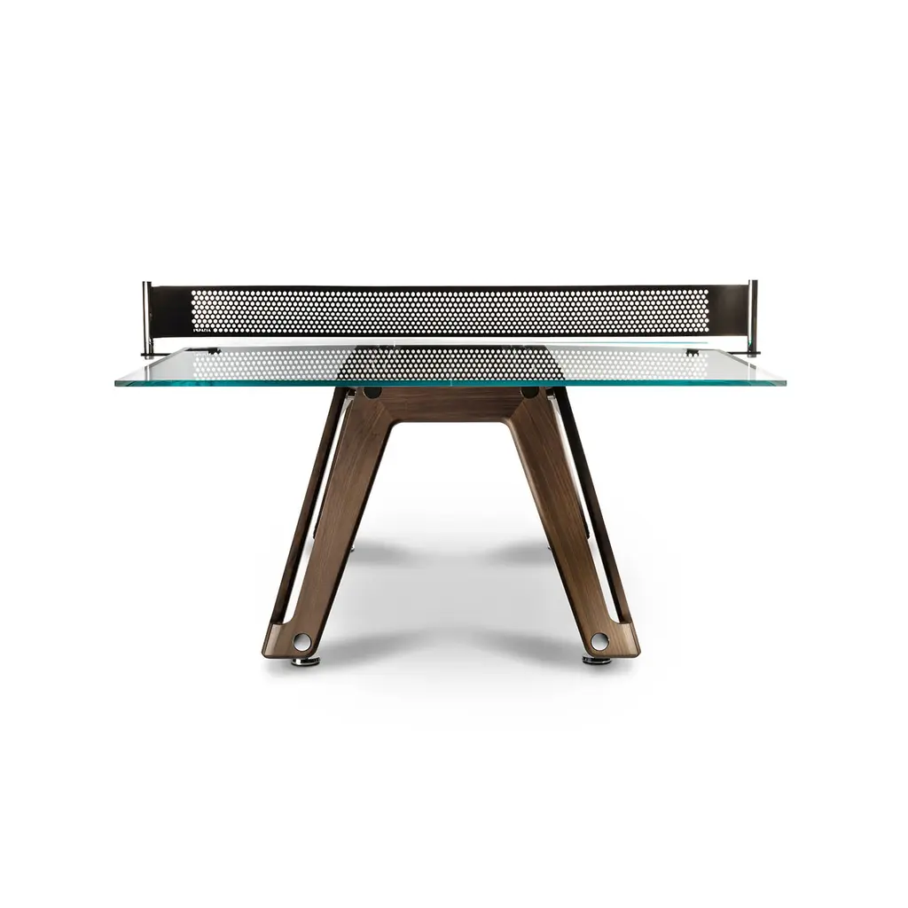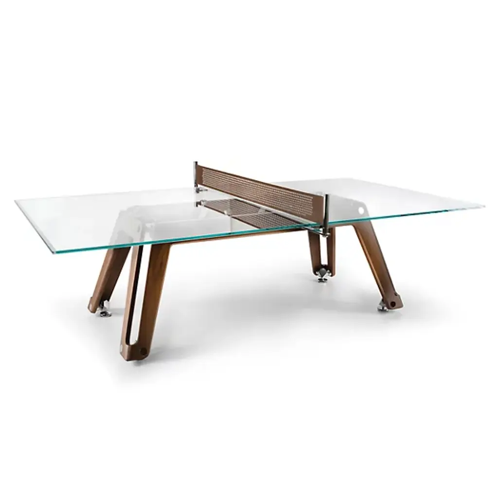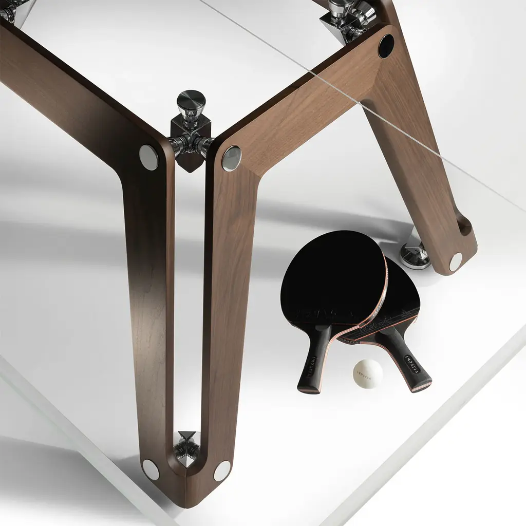 This modern, updated take on the classic ping-pong table features a crystal playing surface, walnut-finished ash wood legs, polished and chrome-plated metal components, and a net made from durable Alcantara® fabric. It includes two professional rackets and ten pro-grade balls. Made using high-precision technology, it meets the needs of even the most demanding players.