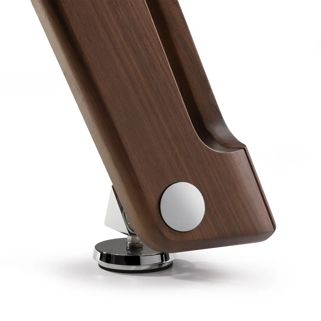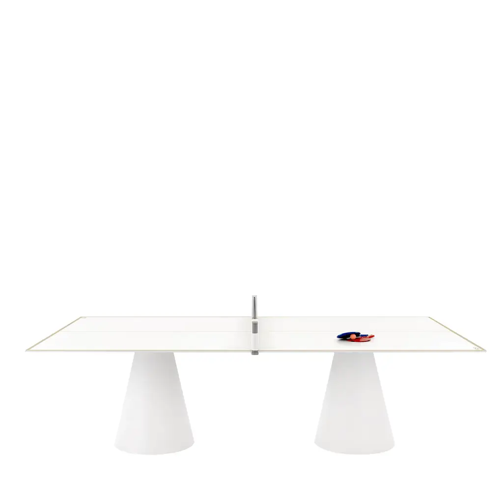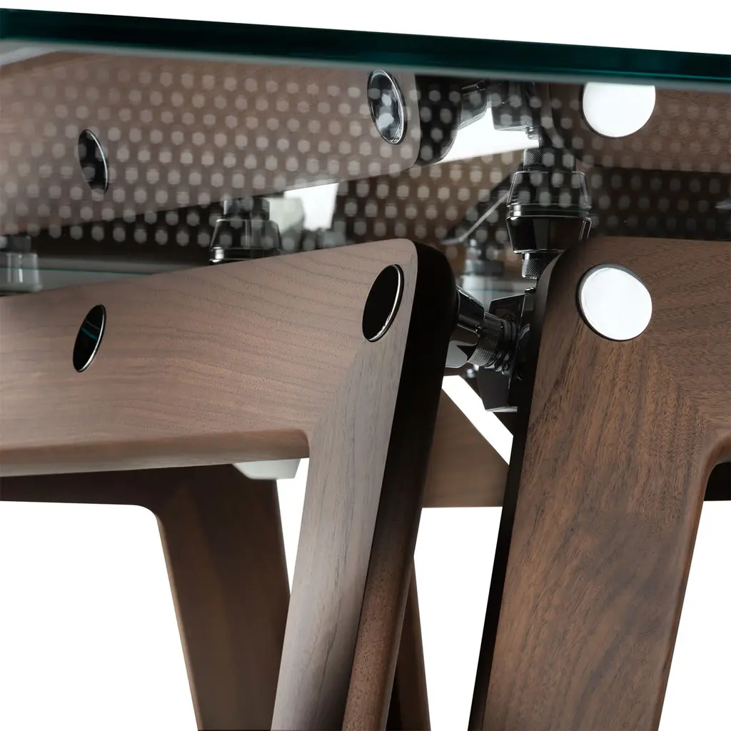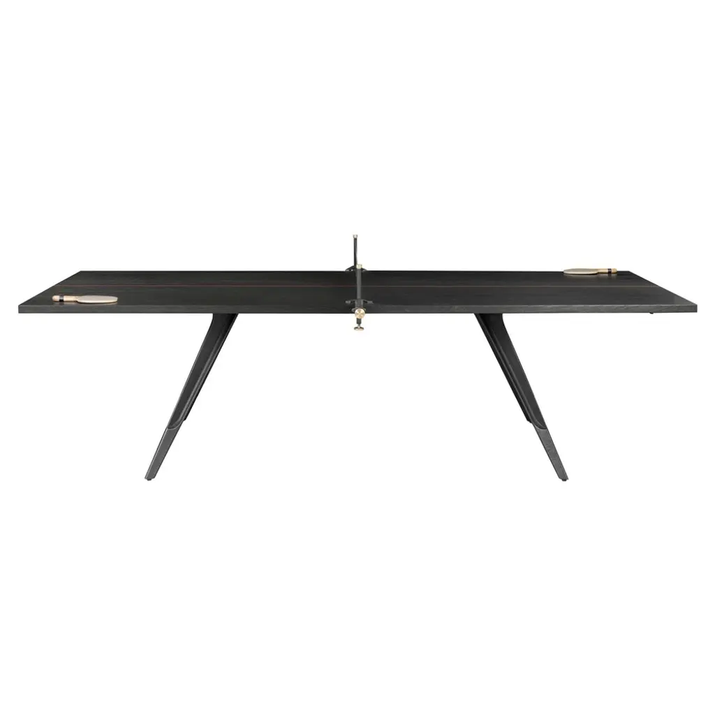 This modern, updated take on the classic ping-pong table features a crystal playing surface, walnut-finished ash wood legs, polished and chrome-plated metal components, and a net made from durable Alcantara® fabric. It includes two professional rackets and ten pro-grade balls. Made using high-precision technology, it meets the needs of even the most demanding players.