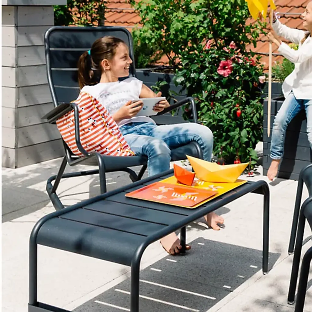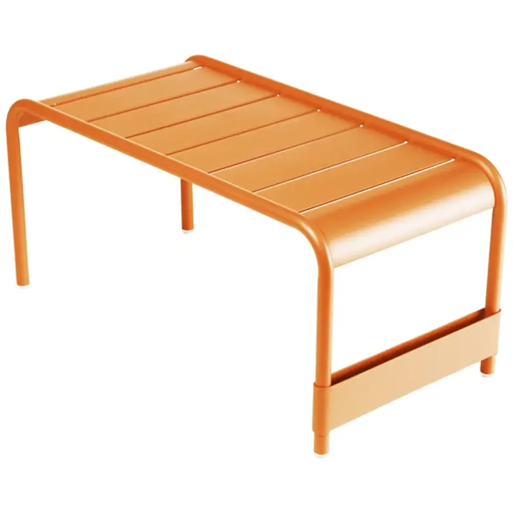 In outdoor settings, the Fermob Luxembourg Large Low Table/Garden Bench pulls triple duty. It's a comfortable bench, convenient cocktail table and even a footrest for the Low Armchair. It is made entirely out of durable, lightweight aluminum, and comes in all Fermob colors to coordinate with Fermob furniture and other outdoor decor.