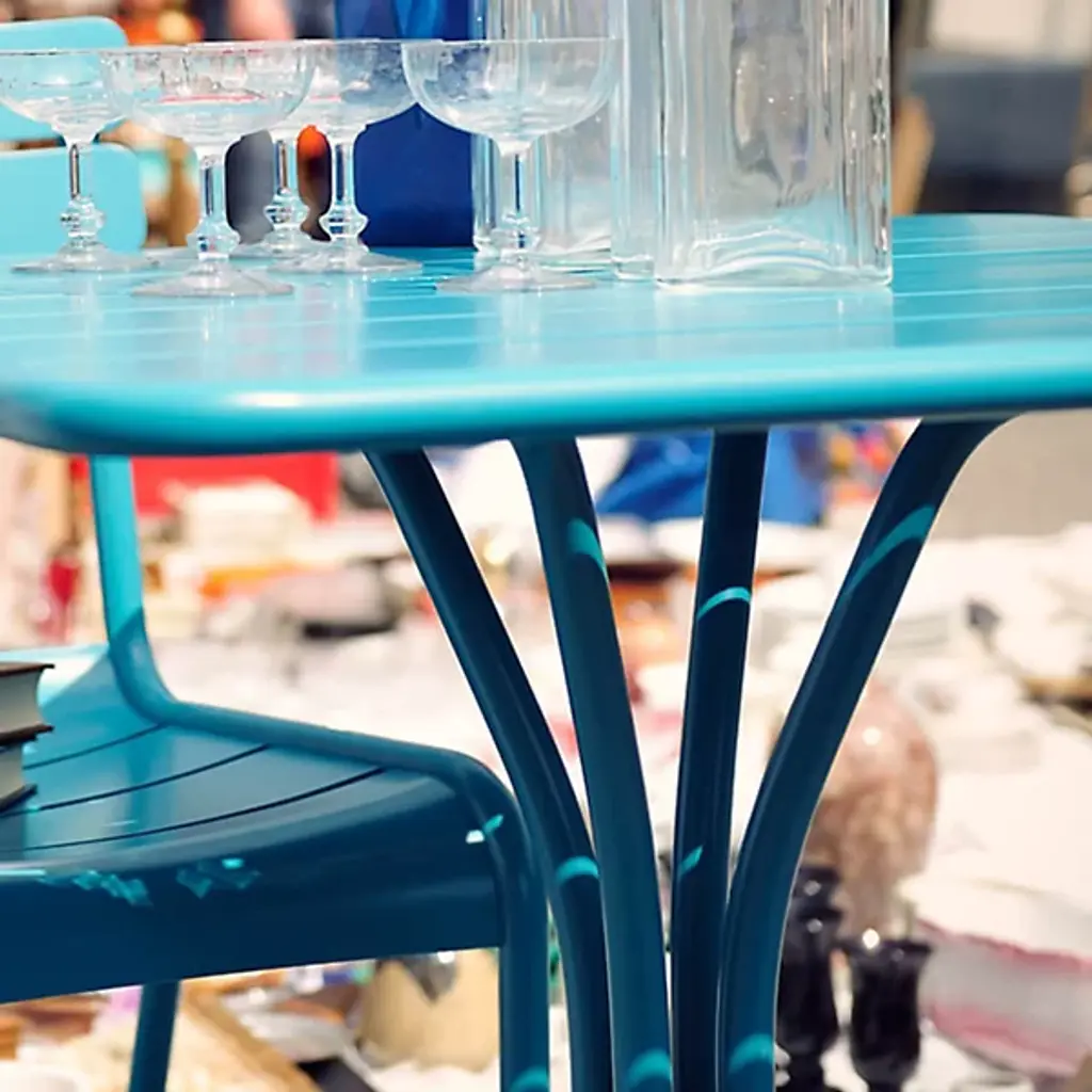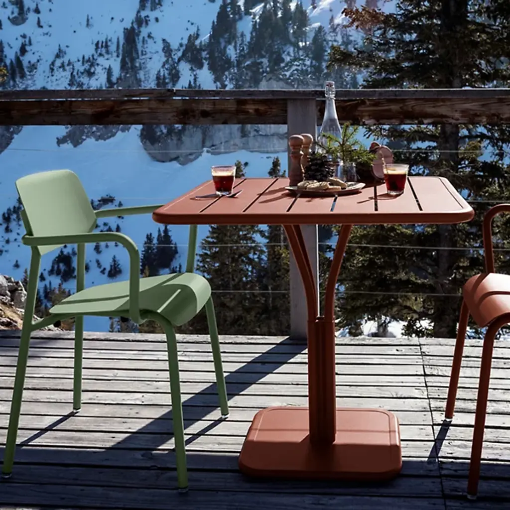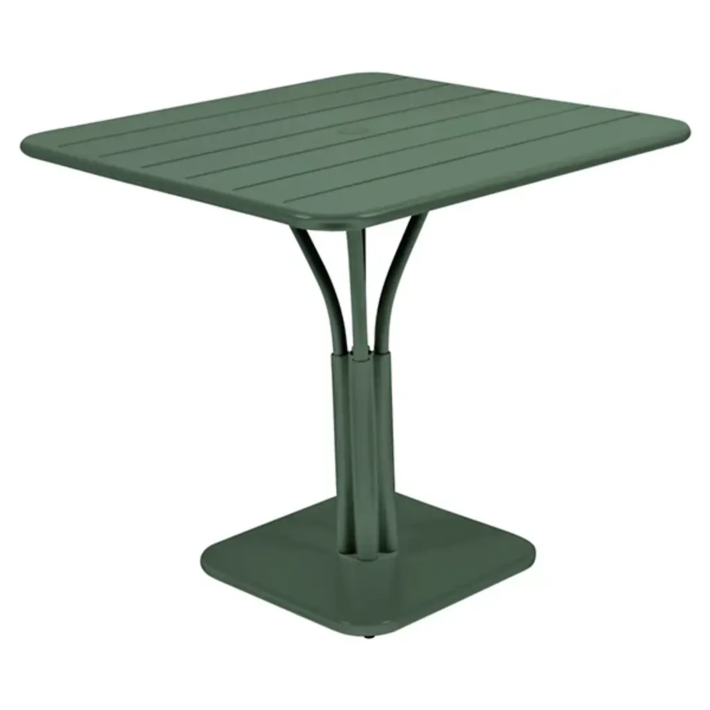The Fermob Luxembourg Square Table pairs the smooth style of the Luxembourg collection with a distinctive pedestal base. The parasol hole in the center of the aluminum tabletop accommodates a standard patio umbrella or can instead be fitted with the included matching cap. Choose between all Fermob colors, and coordinate with Luxembourg Stacking Chairs or Armchairs.