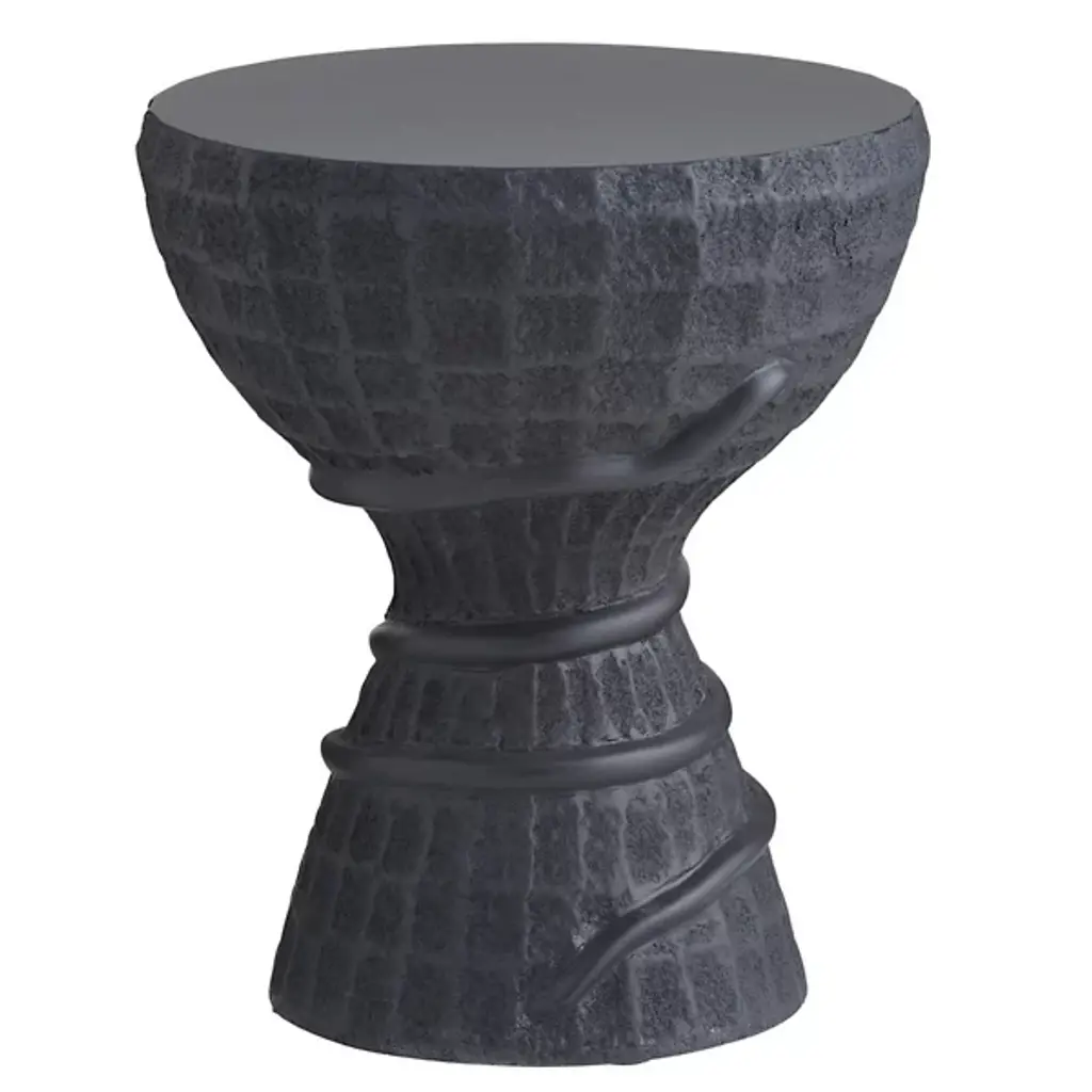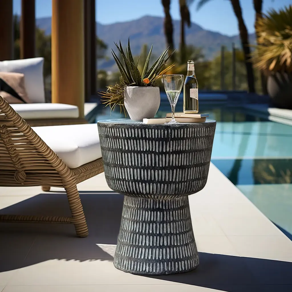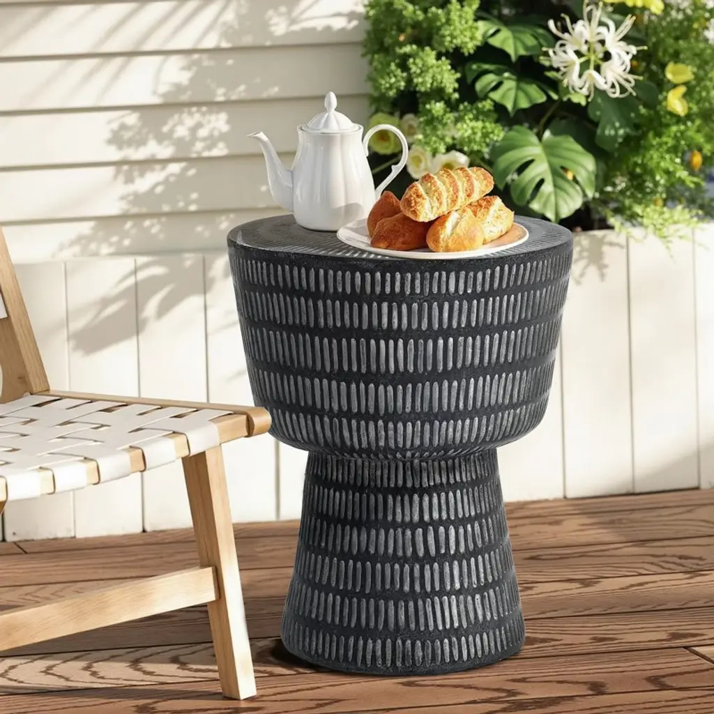 Elevate the ambiance of your outdoor living area with the addition of this exquisitely crafted outdoor side table. Constructed from high-quality magnesium oxide material, this table boasts exceptional strength and durability. The spiral-shaped tabletop, adorned with a captivating striped design of varying surface sizes, adds a distinctive and sophisticated touch to your space. Not only is this table stylish, but it is also highly functional. In a modern black finish with gray accents, this side table effortlessly enhances the natural beauty of your surroundings with its sleek and minimalist appearance. Perfectly suited for placement next to a chat set or combination sofa, this table is an ideal complement to any terrace, patio, or deck.