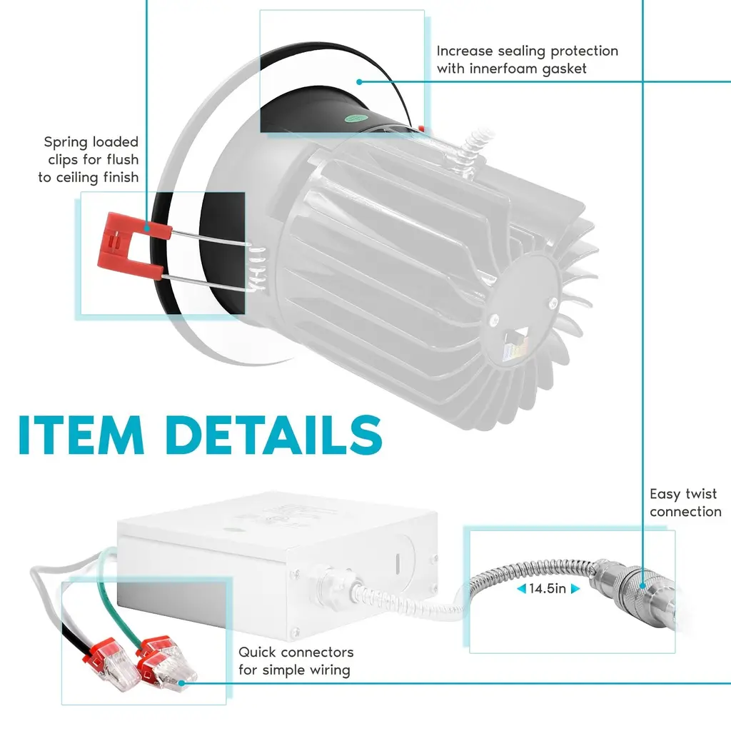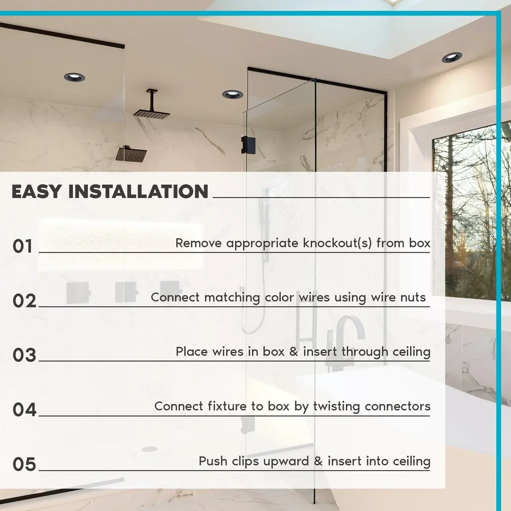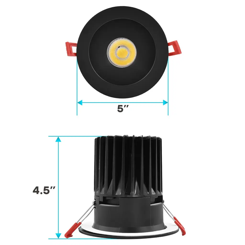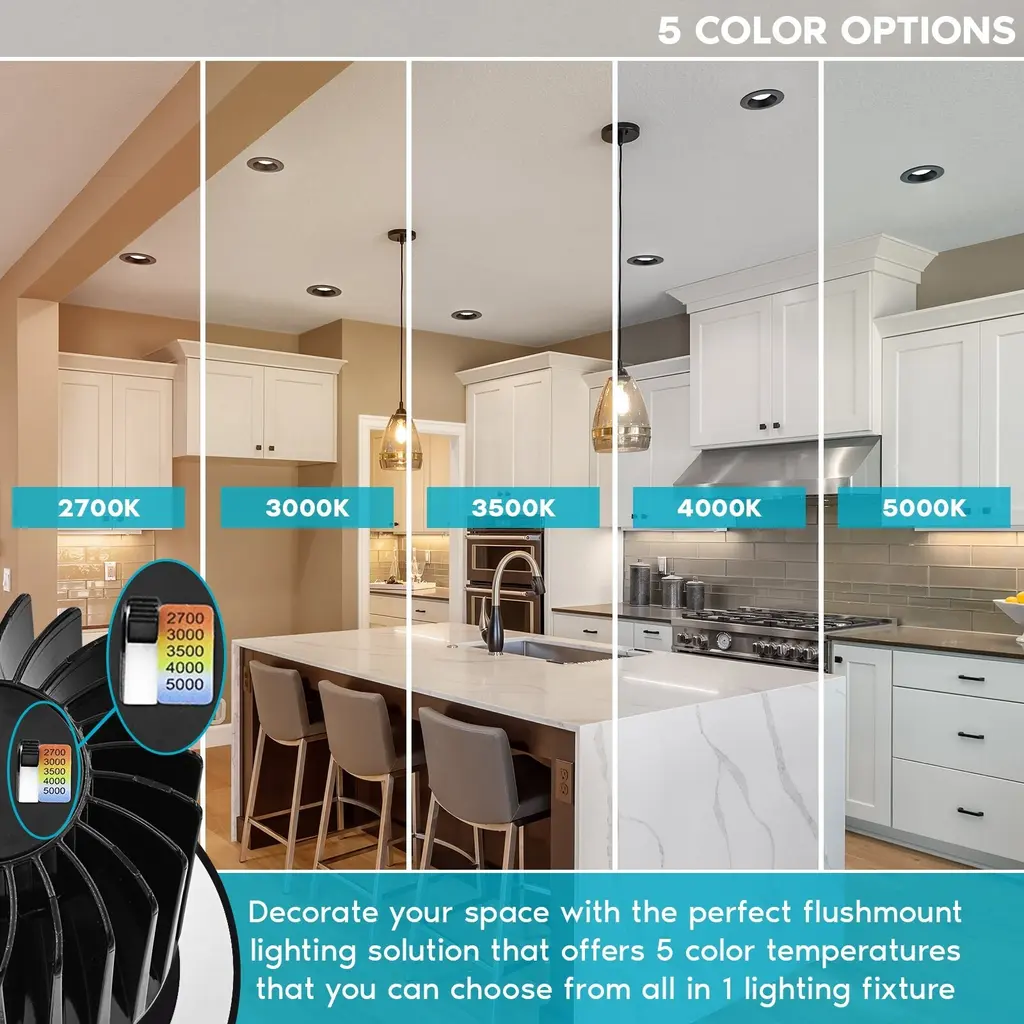 5 COLOR OPTIONS - Not sure what recessed light fixtures color temperature you are looking for in your home? Each 4" recessed light has a simple to use switch connected that can change your lights to 2700K warm white, 3000K soft white, 3500K natural white, 4000K cool white, or 5000K bright white. Your home LED retrofit kit will be adjustable through 5 cct color temperatures until you find the perfect light to select for your space.CANLESS DESIGN - Everything you need in one simple and convenient design that does not require the use of a can housing. Each black recessed light fixture is the perfect solution that comes with a j box and quick connectors for easy wiring, fits into a 3.94 inch diameter ceiling hole, and spring loaded clips for a flush to ceiling finish. With it's 2.5 inch deep regressed trim and 40" beam angle, these are best for accent lighting through your home.DIMMABLE - Control the brightness of your 4" LED recessed lights with it's smooth dimming feature that can be reduced from 100% to 5% lighting. Be in control of your recess lights that will dim down to your preferred setting without flickering or issues, so you can enjoy a pleasant atmosphere every time. With a wet location and IC insulation safe rating, these recessed LED lights are ideal for new and old construction, remodel, soffit, eave, shower, and any indoor or outdoor location.CONTINUOUS LIGHT - Built with an astounding 50,000 hours of lifetime which means no replacement will be needed for the next 45 years, based on 3 hrs/day use. Each canless LED recessed light 4 inch lasts 10x longer than traditional incandescent bulbs which means less time worrying about changing your lights. Use in your bedroom, kitchen, bathroom, living room, garage, basement, patio, porch, and more.RELIABLE LIGHTING - Zero flickering light, zero delay, and zero worries with a LED recessed lighting 4 inch that provides high quality indoor and outdoor lighting. Every canless LED recessed light is quick to install, wet and damp location rated for reliability, CRI 90, IC air tight insulation contact safe and ETL listed, Energy Star and Plenum rated, has a 40 degree spot light, black trim, and backed by a 5 YEAR WARRANTY.
