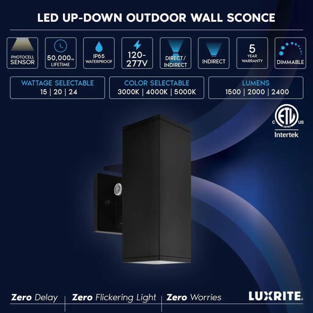 Luxrite Dusk To Dawn Led Outdoor Wall Light, 10", Up Or Up And Down Light, 3Cct 3000k-5000k, 15/20/24w, Ip65, Etl 2-Pack - 3 Color Selectable 30/40/50