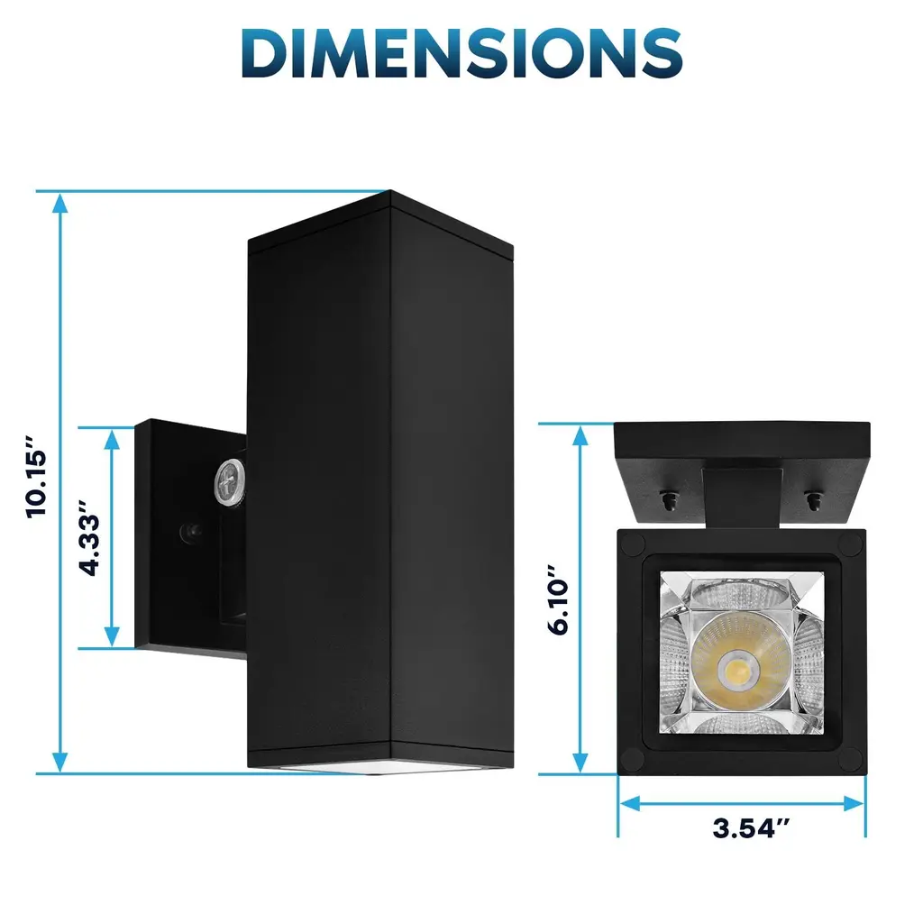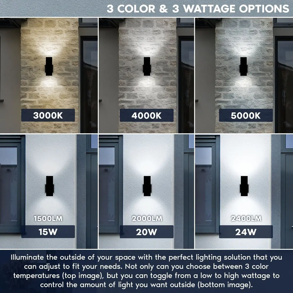 MULTI-OPTION LIGHTING - Enjoy the convenience of integrated LED wall lighting with our exterior cylinder light fixtures, providing you with two versatile light direction settings. These outdoor wall light fixtures offer the flexibility of illuminating both upward and downward simultaneously, or opt for exclusive up lighting from the top, allowing you to customize your outdoor lighting to suit your needs. Ideal for multiple outside locations of your home include porch, patio, garage, and more.COLOR TUNABLE - Enhance your lighting experience by personalizing it with our 3-color selectable switch, which provides you with three Kelvin temperature options: 3000K soft white, 4000K cool white, and 5000K bright white. This versatility empowers you to tailor the ideal ambiance for your outdoor area, elevating its visual appeal, ensuring better visibility, and optimizing overall functionality to suit your specific needs.ADJUSTABLE BRIGHTNESS - Control the amount of light needed in your space with the on-board switch that can adjust the wattage used by these outdoor wall sconces. Use 20 watts for 2000 lumens, 30 watts for 3000 lumens, and 40 watts for 4000 lumens of high output, bright lighting. You can even attach these up and down lights outdoor fixtures to a dimmer switch for smooth dimming capabilities. Adjust from full brightness down to a gentle glow, at any time.DUSK TO DAWN and IP65 - Built with a photocell sensor to automatically turn on at night and off at sunrise to preserve energy. These hardwired porch lights provide lighting only when you need it. You can also choose to turn off the photocell sensor if you want to use these with a regular wall switch. Certified IP65 rated to handle damp and wet locations without loss of function so you can have consistent lighting without issues. Dimensions: 18" x 5.63" x 8.23"RELIABLE LIGHTING - Up down wall lights that provide quality lighting to your exterior residential or commercial space with multiple lighting options in a single wall lighting fixture. Each outdoor porch light has a 3 cct color selectable switch, 3 wattage selectable switch, photocell sensor for auto dusk to dawn lighting, triac/0-10V dimmable, IP65 water proof, ETL listed for your safety, 120 to 277 volt hardwire capable, 25 degree beam angle, and has a 5 YEAR WARRANTY.