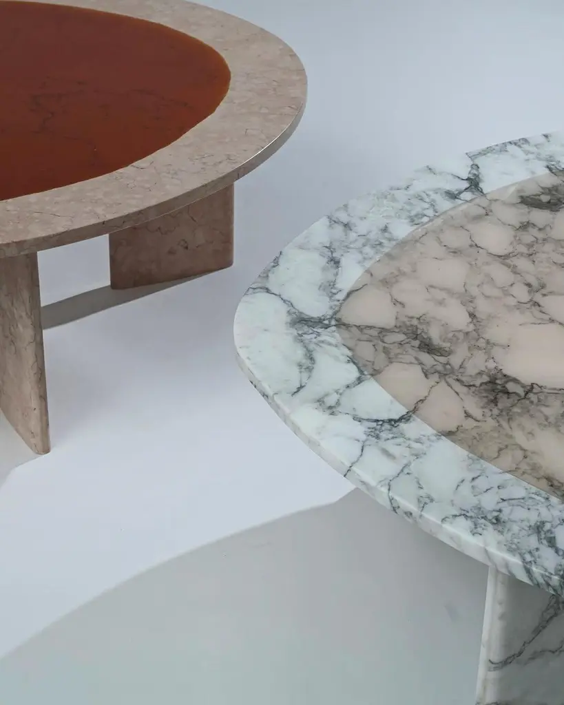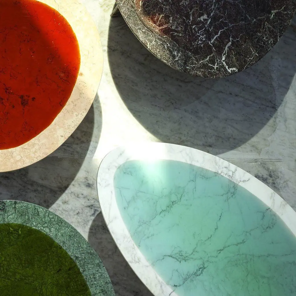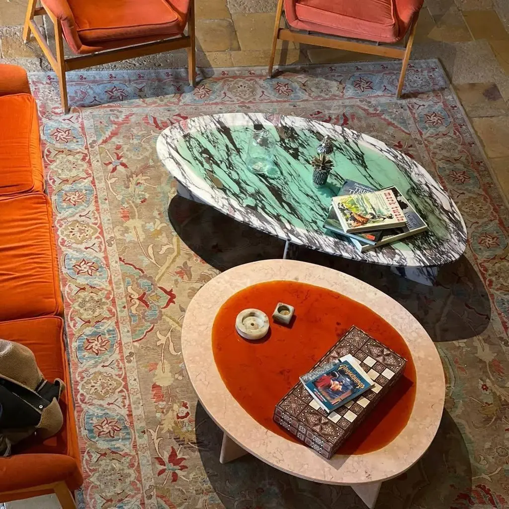 Luxury Handcrafted Natural Marble Turquoise Resin Low Table Minerals, Carla BazDimensions: L 136 x W 75 x H 35/45 CMMaterial: Brescia Viola Marble, Turquoise Resin.Weight: 65 kgAvailable in Oval, Round, Rounded Square shapes. Please contact us!Entirely handcrafted in solid marble with colored resin inlay.The Minerals low table series are an experimental approach to marble, whereby the idea was to start with natural colored marbles that we would enhance with colored resin, giving the pieces more depth and offering a wide array of possibilities and color combinations. Favoring a minimal thickness for the marble table itself, these pieces invite us to look at the surface and delve into the complexity of veins, giving substance while keeping the perception of lightness.Carla Baz is a French-Lebanese designer dedicated to foster synergies between her innovative approach to furniture/lighting and the very accomplished skills of Lebanese artisans. After studying interior architecture at ESAG Penninghen in Paris, she pursued a Masters in product design for the luxury industry at the University of Art and Design Lausanne (ECAL) where she had the opportunity to work on several projects under the supervision of international designers such as Ronan Bouroullec, BarberOsgerby, Marti Guixé, Pierre Charpin and Umberto and Fernando Campana. She then engaged in diverse professional experiences, working in London for Burberry, Vivienne Westwood and Zaha Hadid until she felt it was time to explore her own lines. Thus began a very inspiring sequence of experiments which resulted in small editions of her sculptural and functional furniture and earned her the Brussels based Boghossian Fondation’s 2013 Design Prize. All her projects are rooted in that elaborate relationship where innovative ideas meet noble materials that are worked by hand. Within that journey to their process, unique and elegant products are born that hold their place in our landscape. Carla has recently been awarded the 'Rising Talent' award at Maison & Objet’s 2018 September edition.