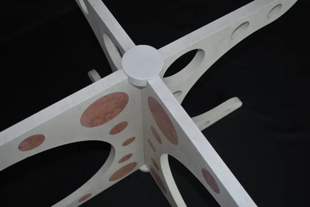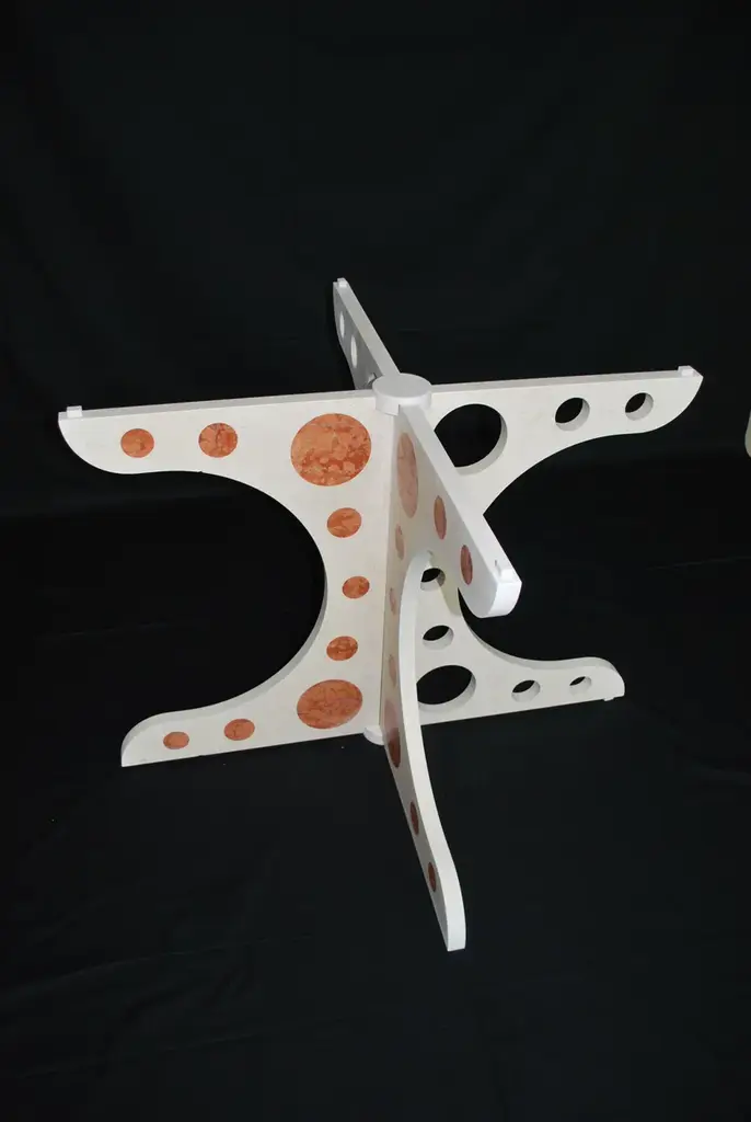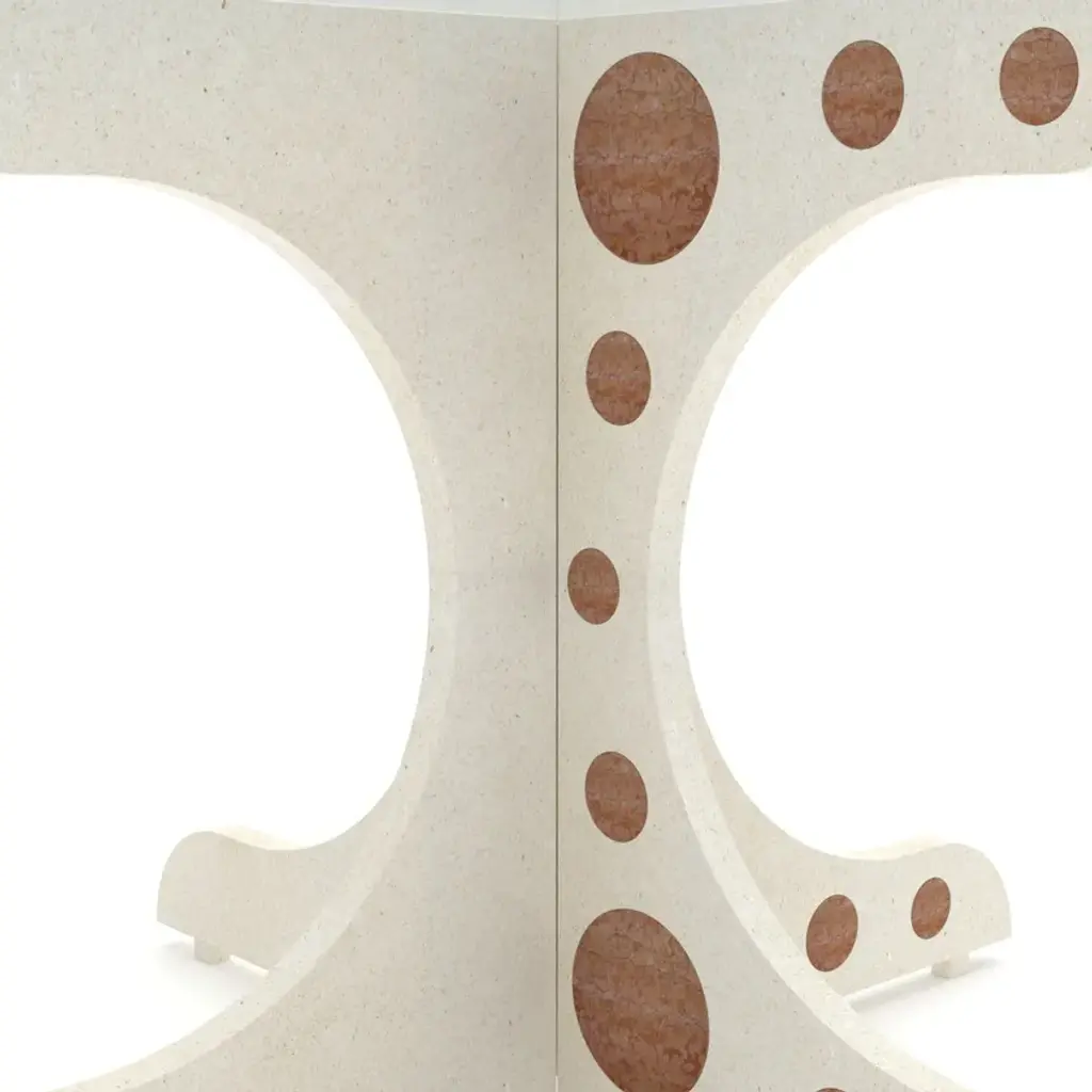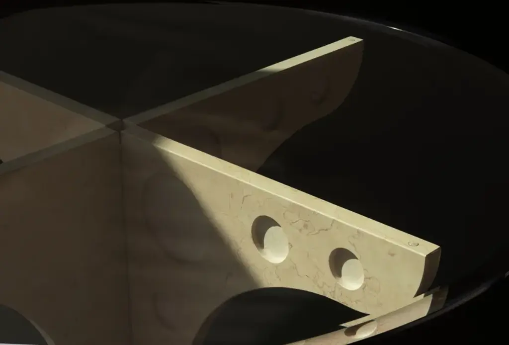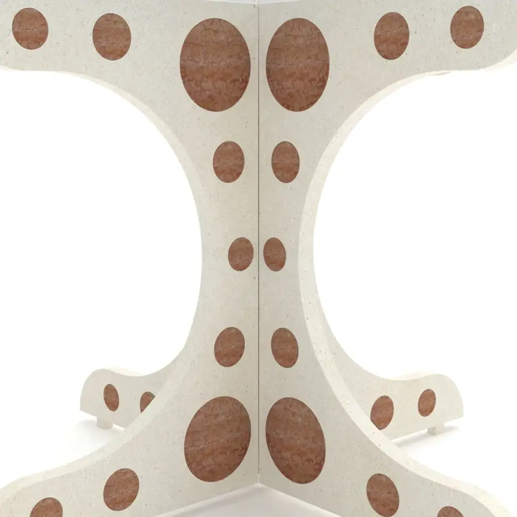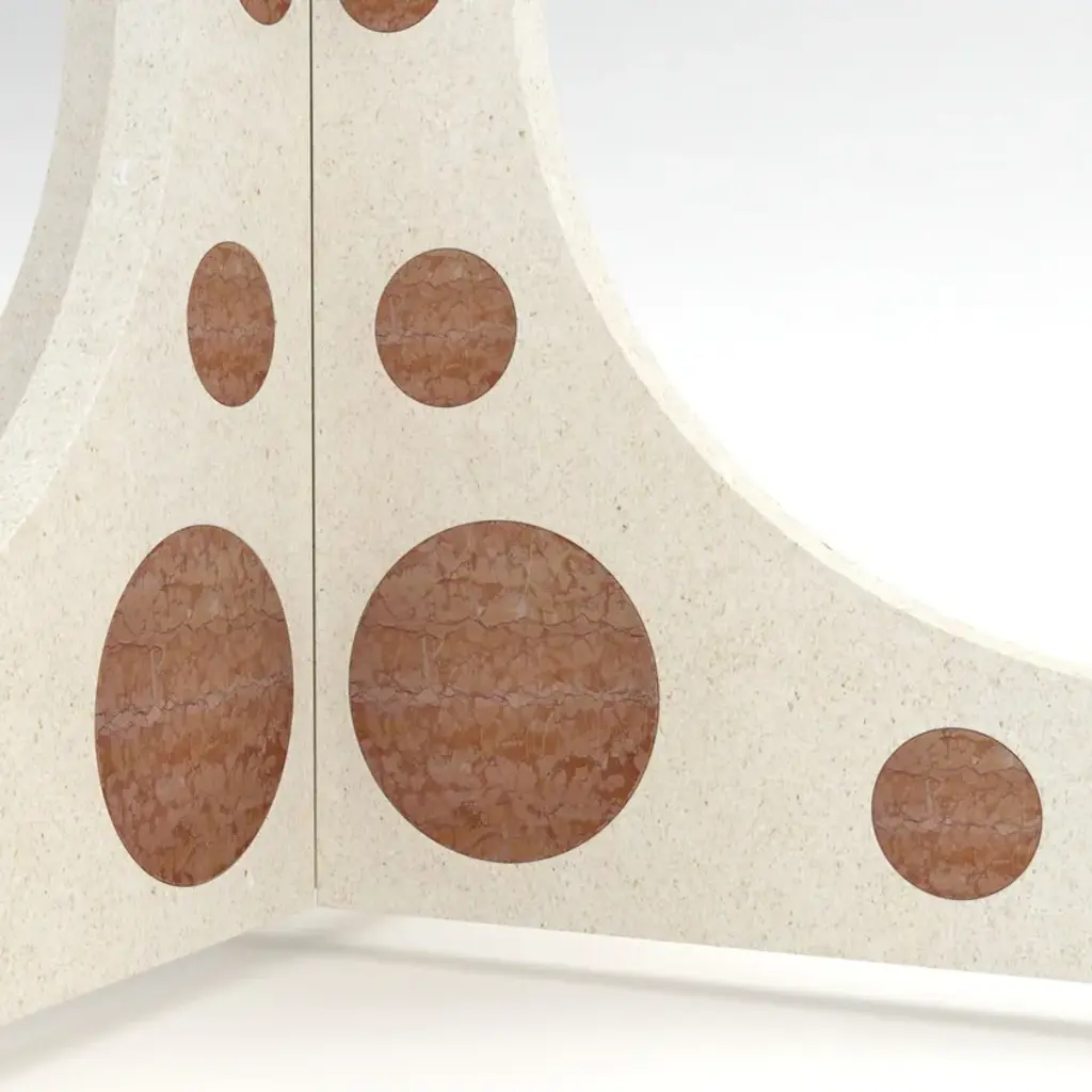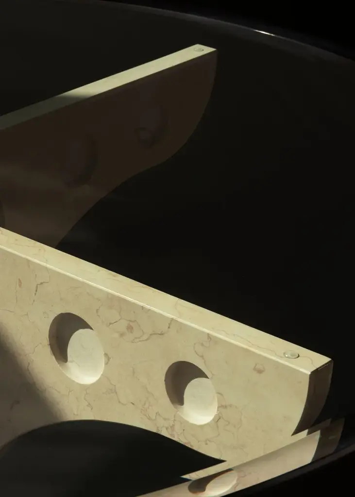 Ma-Mi was born from the desire to combine technology, furniture and art. The main feature of the Ma-Mi marble round table is the contrast given by the colors of the hole spaces and that of the legs, transparency and form, lightness and solidity, harmony and experimentation thanks to glass and stone. The table base, composed of four legs arranged in a cross, is another distinguishing element of MA-MI. Created in collaboration with architect and designer Marcello Albini, MA-MI's design is meant to be customized with made-to-measure solutions, thanks to the "filling" of the holes with marbles of different colors that thus modify the design of the bases according to the customer's pleasure. The holes can also be "emptied" creating even more contrast between empty and full spaces. Variations in color or slight imperfections are the result of the craftsmanship of this article and are not to be considered defects.