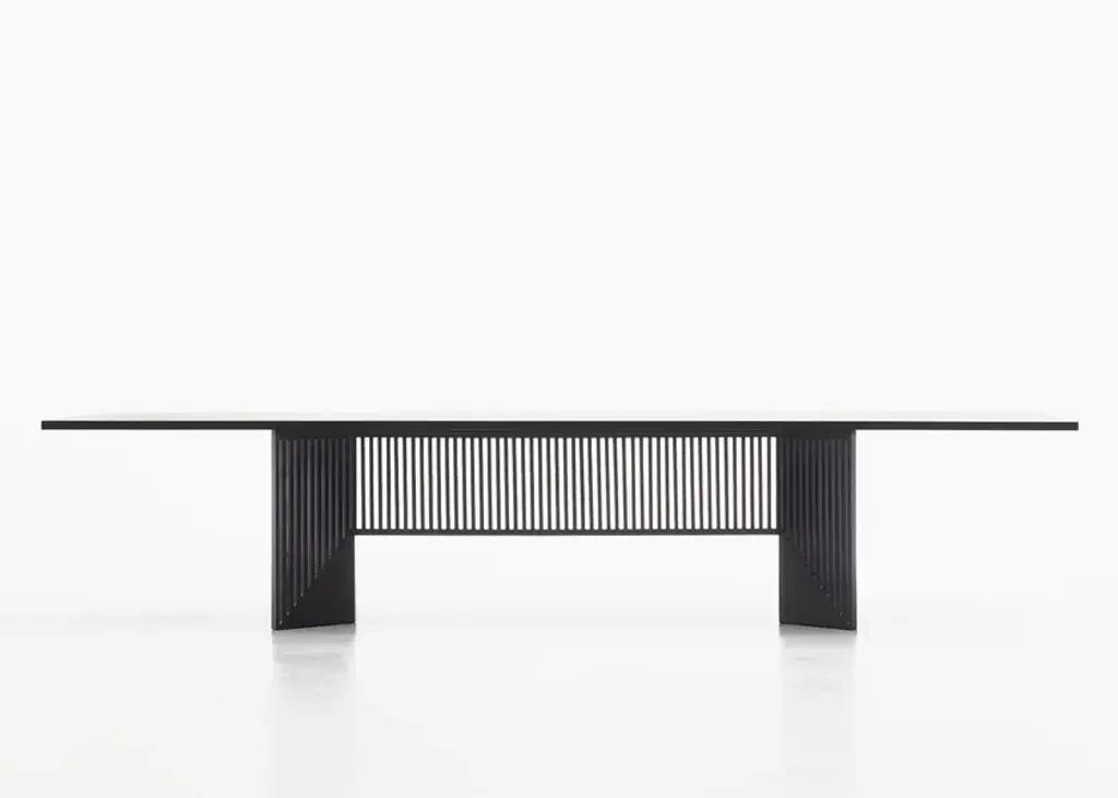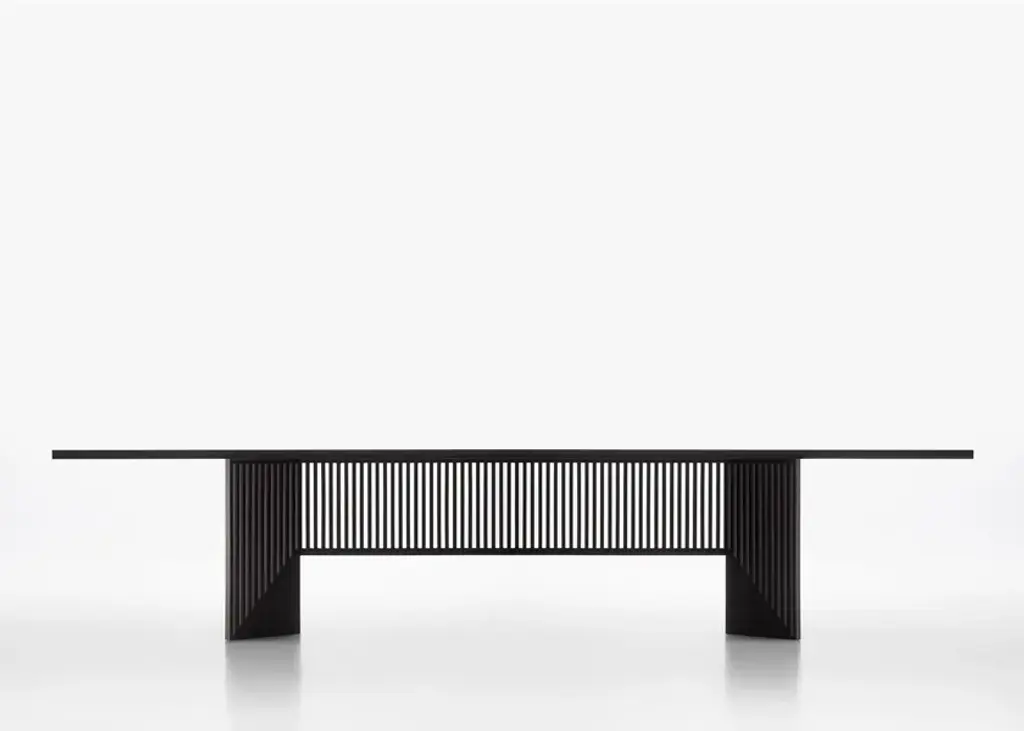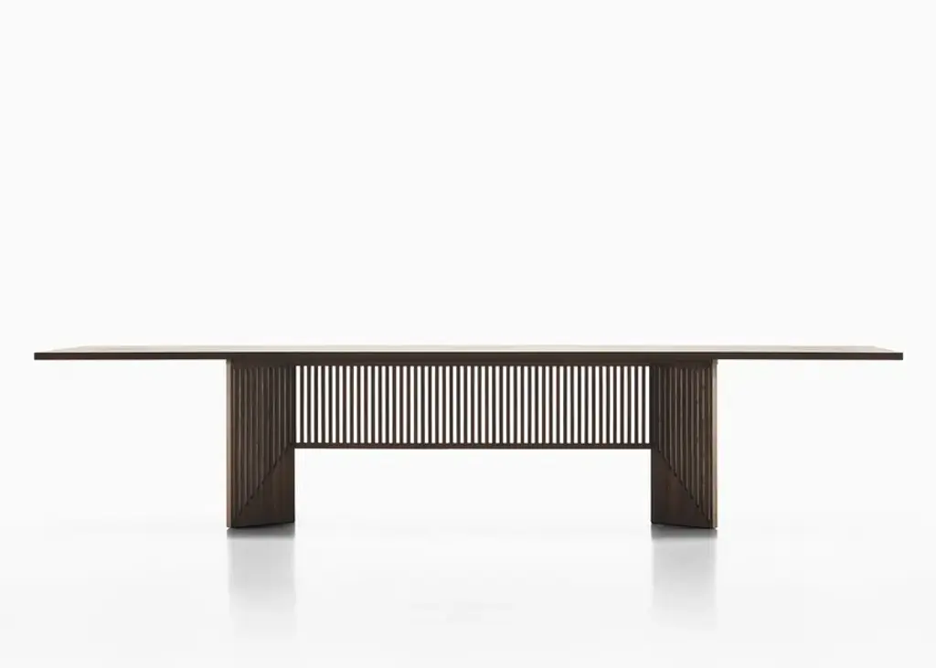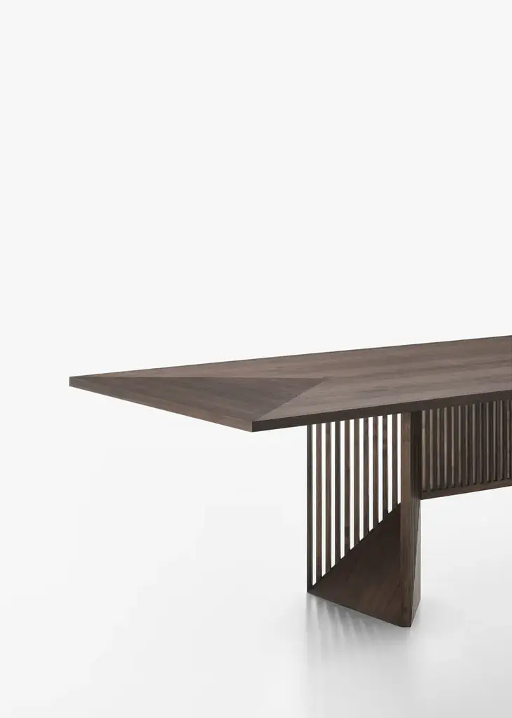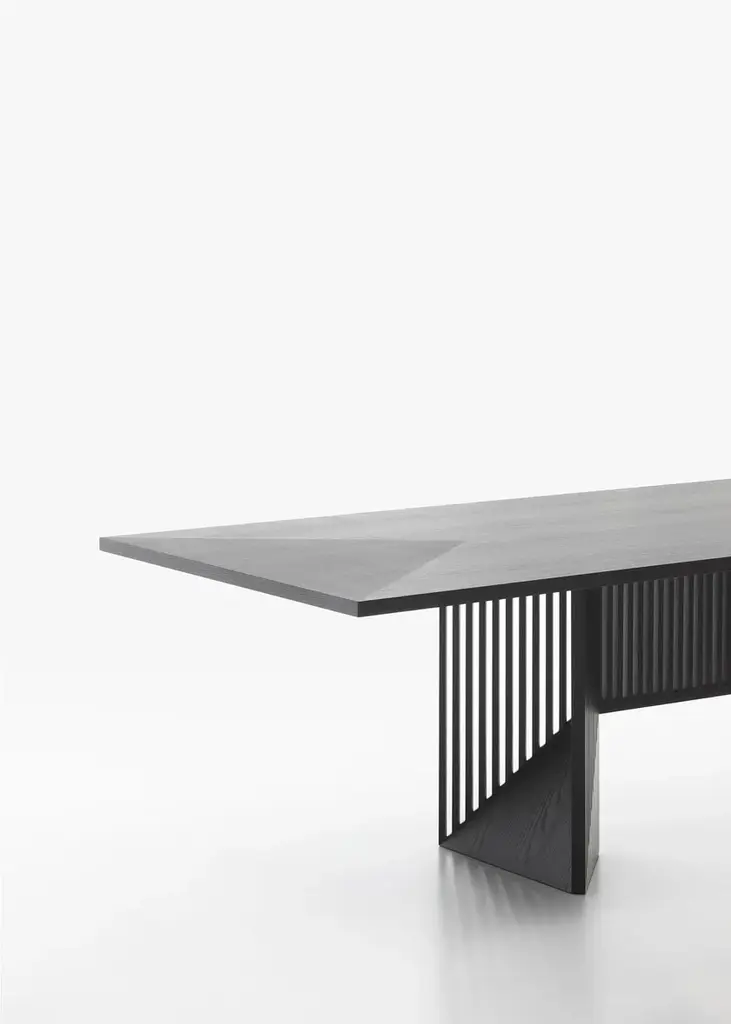 Created at the end of the 1990s by architect Gianfranco Frattini, the Maestro table combines design vision and excellence in the of Italian cabinetmaking savoir faire. Wood is Frattini’s favourite material and reveals his passion through all his projects.The current version follows the original design and maintains its aesthetic appearance but introduces more contemporarywood and dimensions. which are consistent with living areas and domestic interiors. Structure and topThe Maestro table is composed of a base made of solid wood, in three finishes: black ash, bleached ash and dark stained walnut, which emphasises and embellish the structure, the stand’s slatted design is synonymous with quality and authenticity. The top is made of 30 mm thick medium density wood fibre, with a special inlaid and brushed open grain veneer, in black ash, bleached ash or dark stained walnut finishes. These processes require a great manufacturing skill and a deep knowledge of wood.