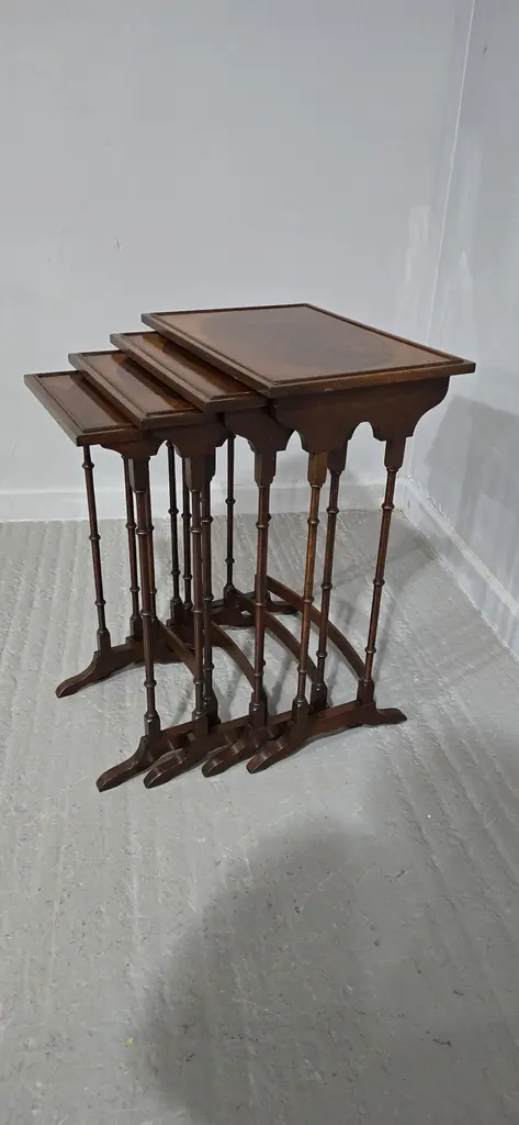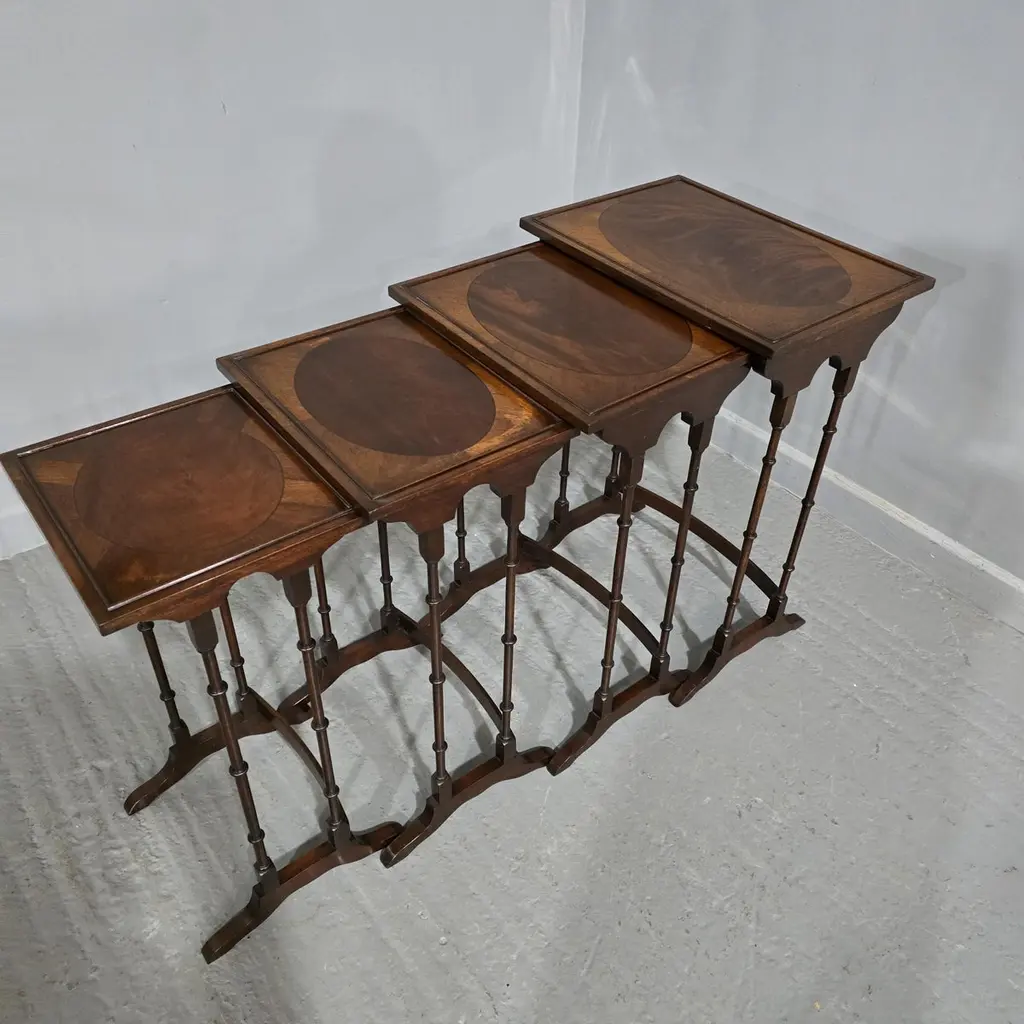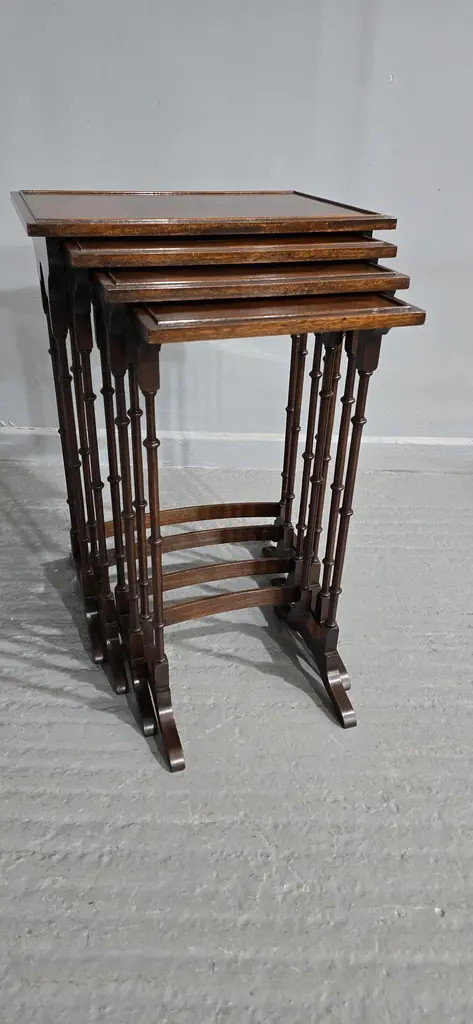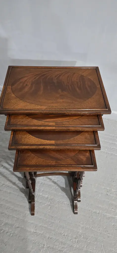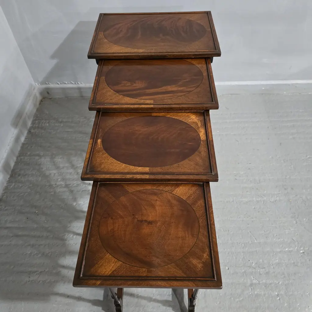 Excellent quality and condition set four mahogany inlaid nest of tables with faux bamboo legs and bowed stretcher, inlaid oval panel to the top.28" high20" wide14" depthYou are welcome to view this item at our showroom, please phone ahead of visiting.Please contact us for more images, Alternatively you are welcome to collect at our large warehouse and showrooms in Derbyshire (20 minutes north of Birmingham). We have a large and ever changing selection of genuine good quality antique furniture and accessories of all types.