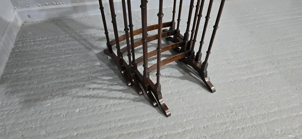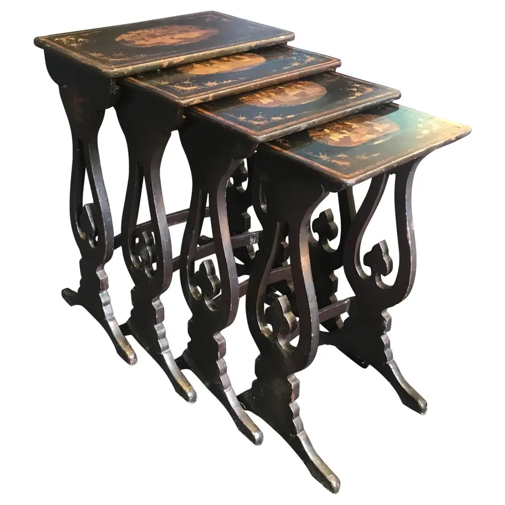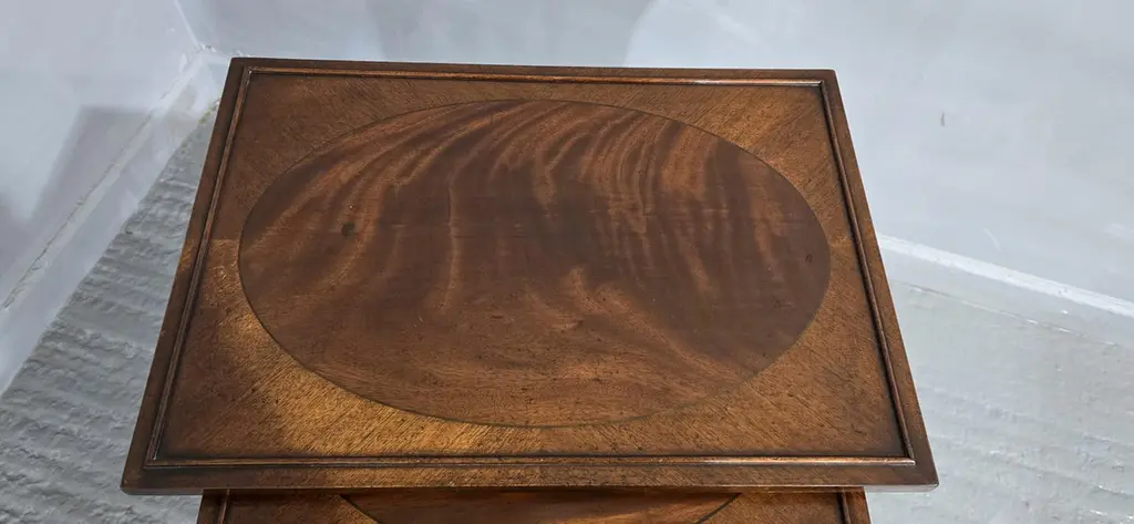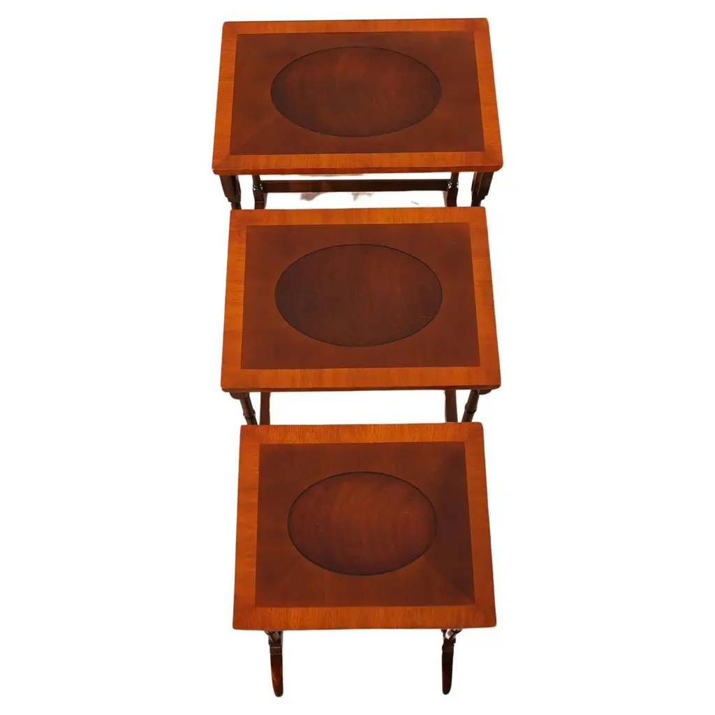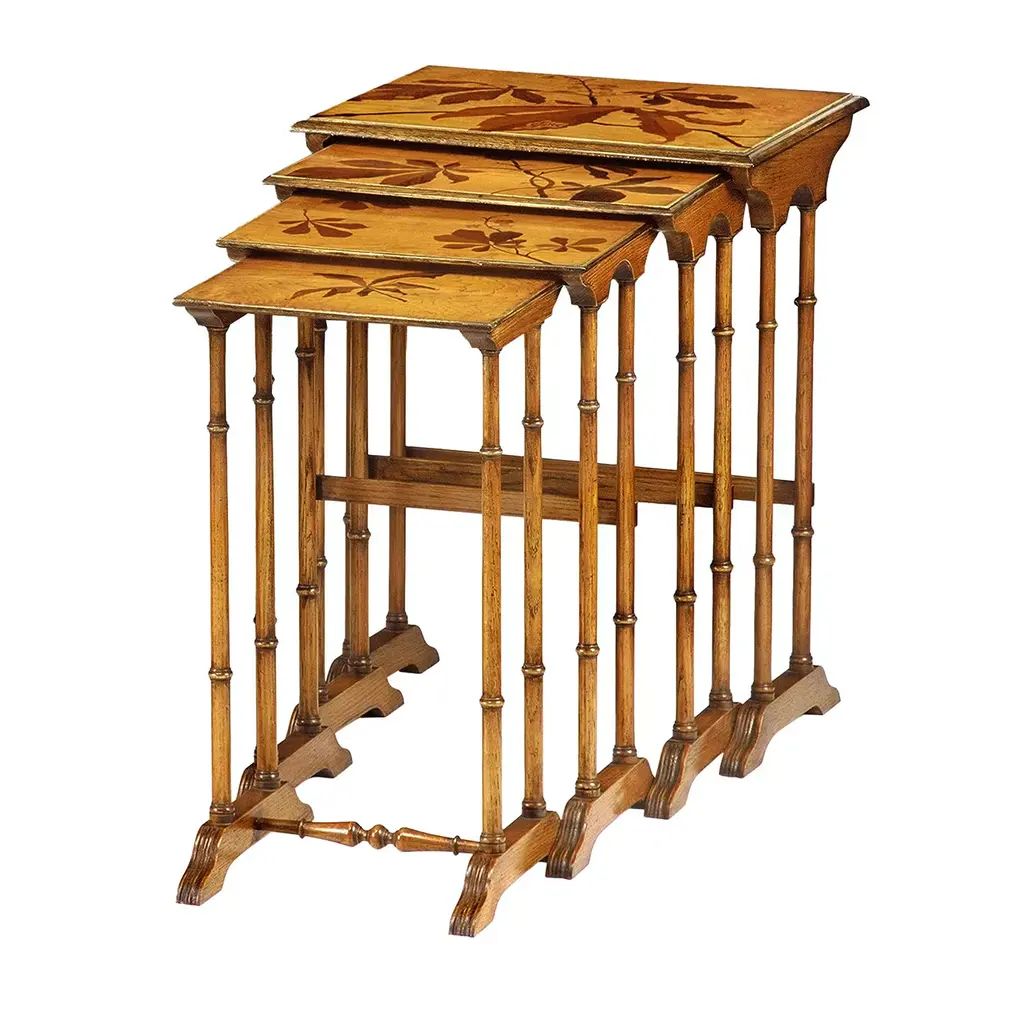 Excellent quality and condition set four mahogany inlaid nest of tables with faux bamboo legs and bowed stretcher, inlaid oval panel to the top.28" high20" wide14" depthYou are welcome to view this item at our showroom, please phone ahead of visiting.Please contact us for more images, Alternatively you are welcome to collect at our large warehouse and showrooms in Derbyshire (20 minutes north of Birmingham). We have a large and ever changing selection of genuine good quality antique furniture and accessories of all types.