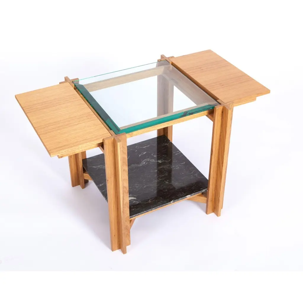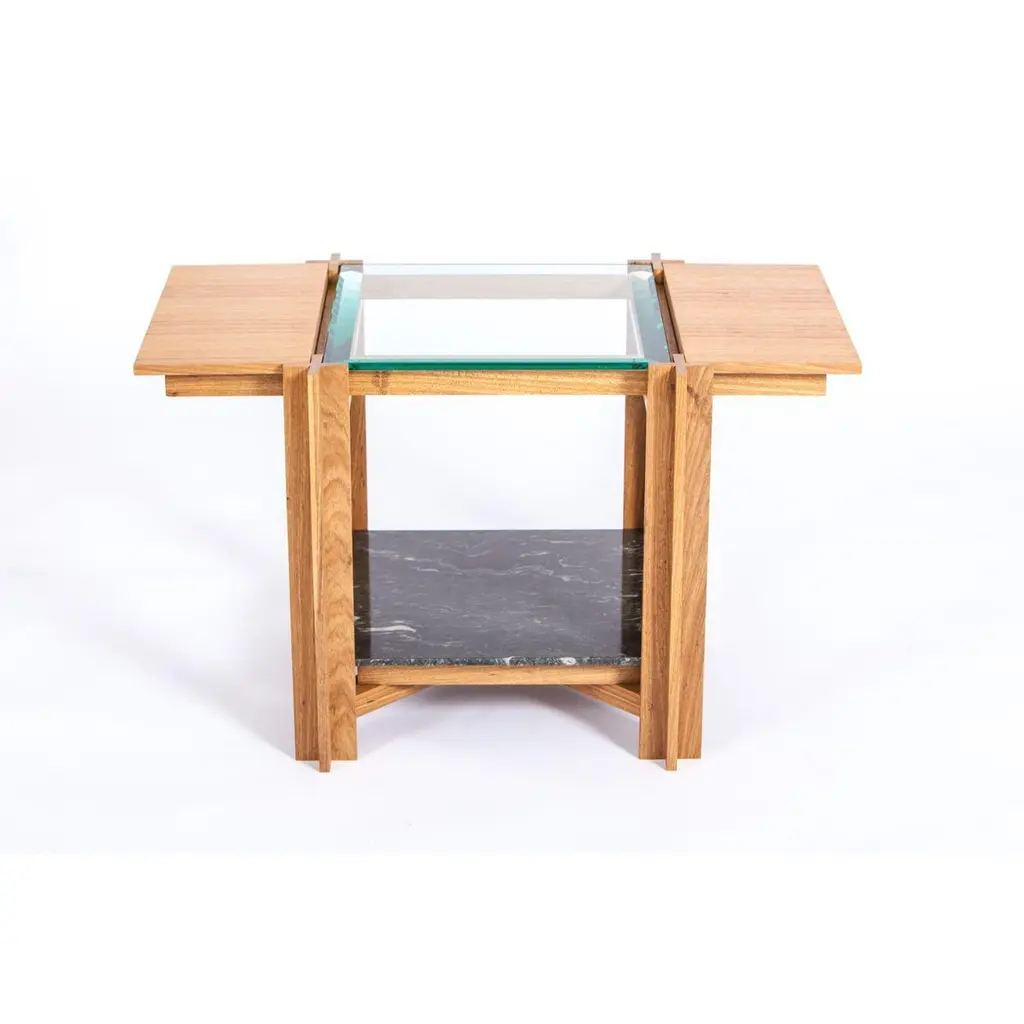 Mais - light freijo table with tabs - by Alva DesignMaterials: Natural or darkened freijó + glass + granite (floral sandblasted green)Dimensions: 83 x 49 x 50 cmAlva is a furniture and objects design office, formed by brothers Susana Bastos, artist and designer, and Marcelo Alvarenga, architect. Their projects are the result of the meeting of these two visions, the architectural and the artistic, and beyond the usual rationality and functionality, they seek the unusual, new uses and an expressive materiality. The duo's creation process starts from a sensitive observation of people's daily lives, their habits and current needs, together with a perception of new potentialities to be artistically explored. In the development of each piece, the technical and aesthetic baggage of the brothers, acquired through important experiences in the architecture and fashion market, is added to a strong relationship with their Minas Gerais and Brazilian origins. In the execution phase, the selection of raw materials and the exquisite manufacturing, often handcrafted, give a unique aspect to the works. The result is contemporary pieces loaded with memory.Alva's first line of furniture and objects was launched in 2013 at the MADE (Mercado, Arte, Design) fair in São Paulo. Following this launch, the firm partnered with Etel - a brand now known worldwide for publishing the best of Brazilian design - to produce and market some of its creations, bringing the brothers' names into the special group of authorial designers represented by it. Since their first release, Susana and Marcelo's creations have gained visibility in several important publications, websites and magazines, both national and international.