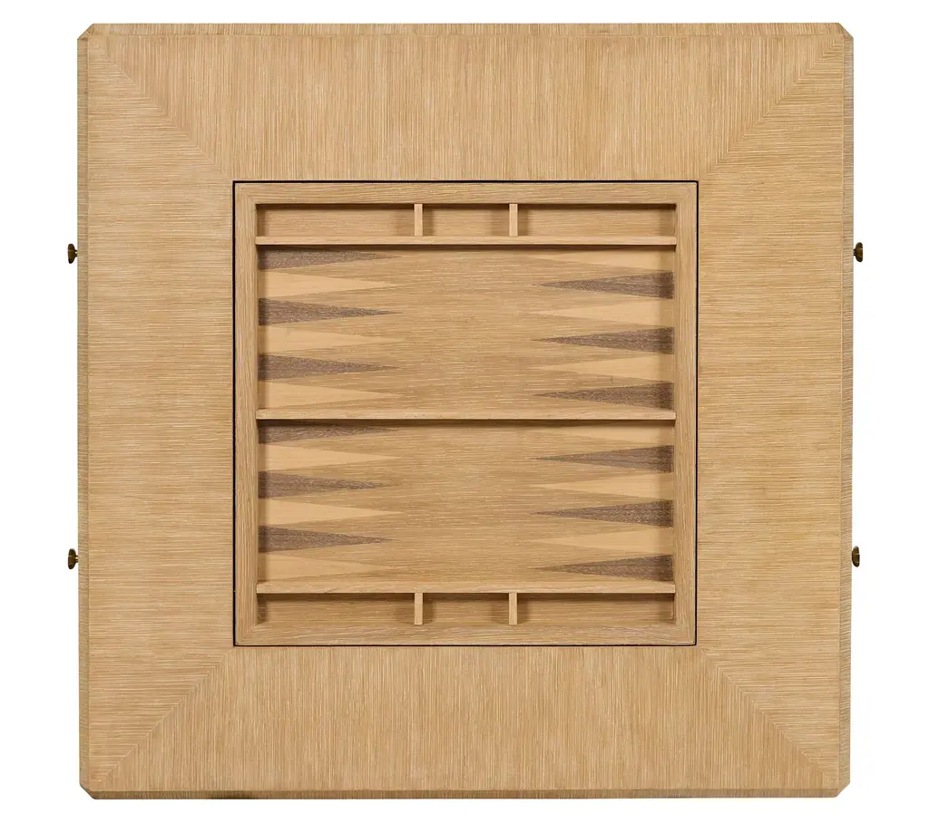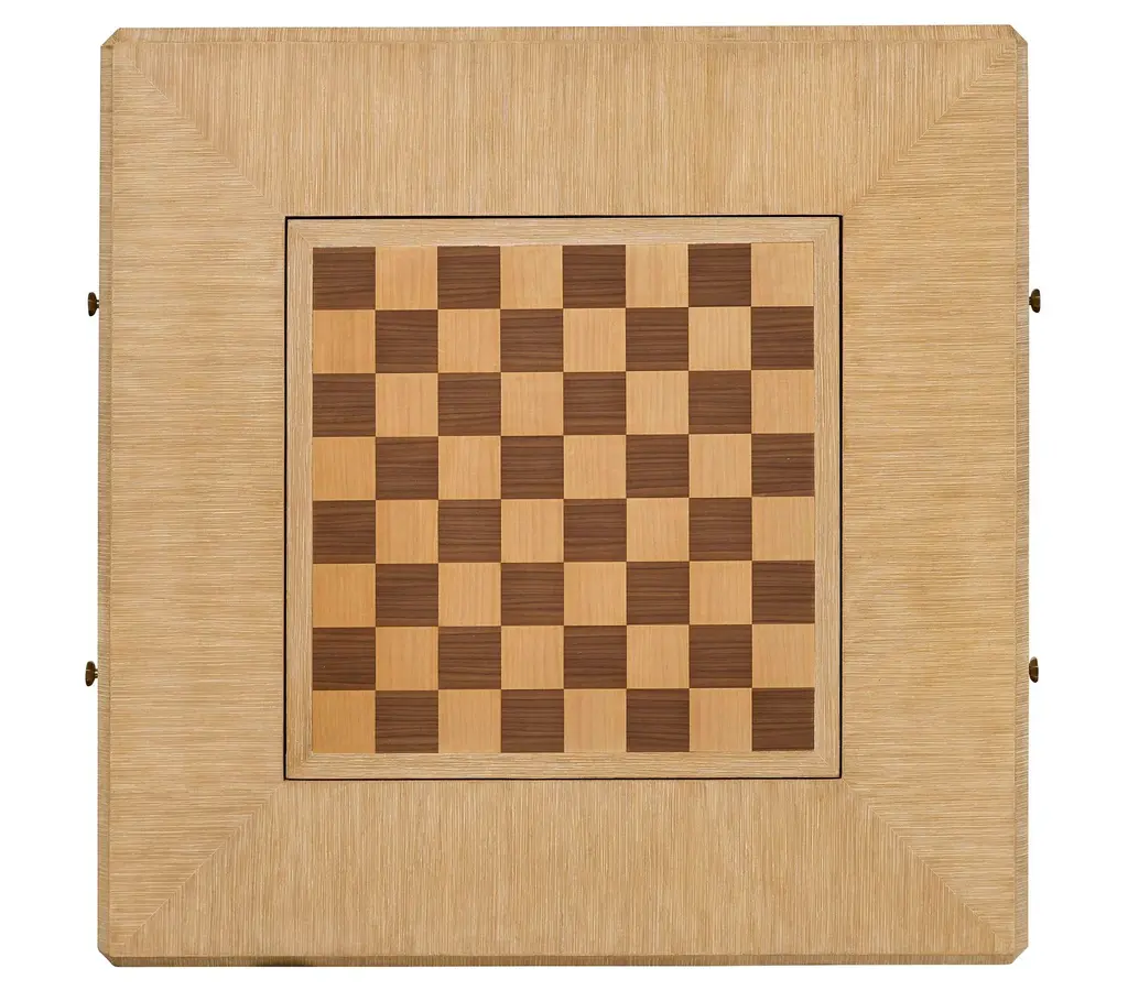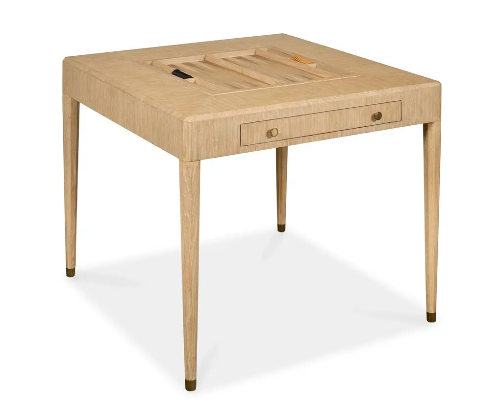 Traditional form meets modern finish in this light cerused oak game table. The reversible game table top can rotate to reveal either a chess setting or a backgammon board. The game board surface is crafted from maple and walnut veneers. Pull both drawers until fully extended to release the locking mechanism and rotate the game board. Custom brass hardware with lightly antiqued finish. Two drawers.