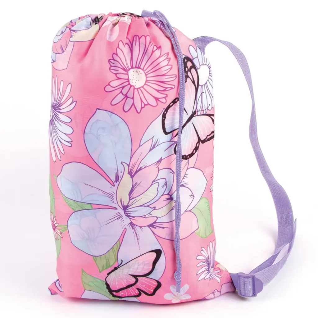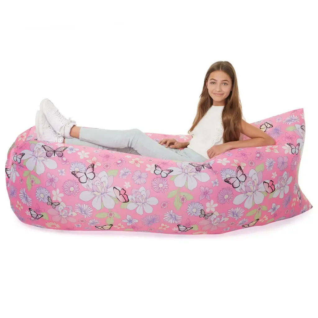 Relax in style! This 6ft long inflatable lounger is perfect for indoor or outdoor use. This easily inflatable (no pump needed) chair has 2 air chambers and a velcro closure. The length of the chair can be made shorter by rolling up the edge prior to closing the final clip. This allover butterfly printed, pink lounger is the perfect accent to any fun tween space and is also great to take outdoors to soak up some sun or hang with friends. It also comes with a matching printed drawstring bag for easy portability and storage. 250lb weight limit. HIGH QUALITY: Our air chair inflatable is made with superb craftsmanship that is strong enough to support up to 250 lb. This blow up couch for camping includes 1 beach inflatable lounger, 1 drawstring bag and 1 easy-to-follow instruction sheet.