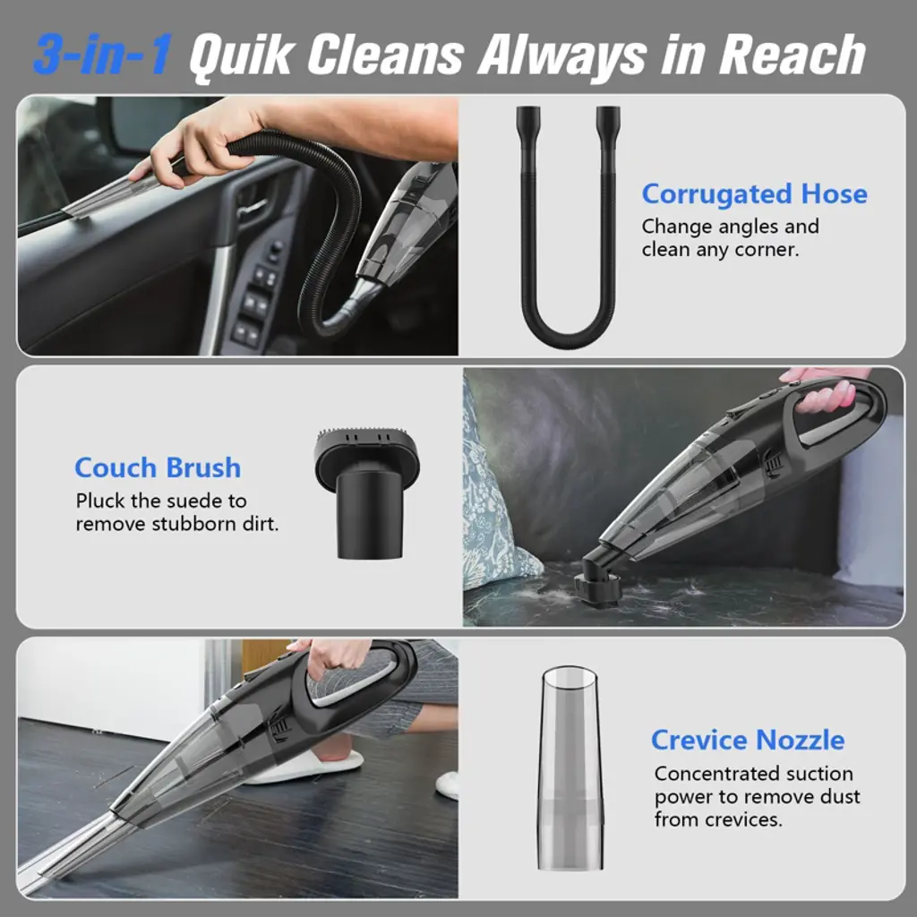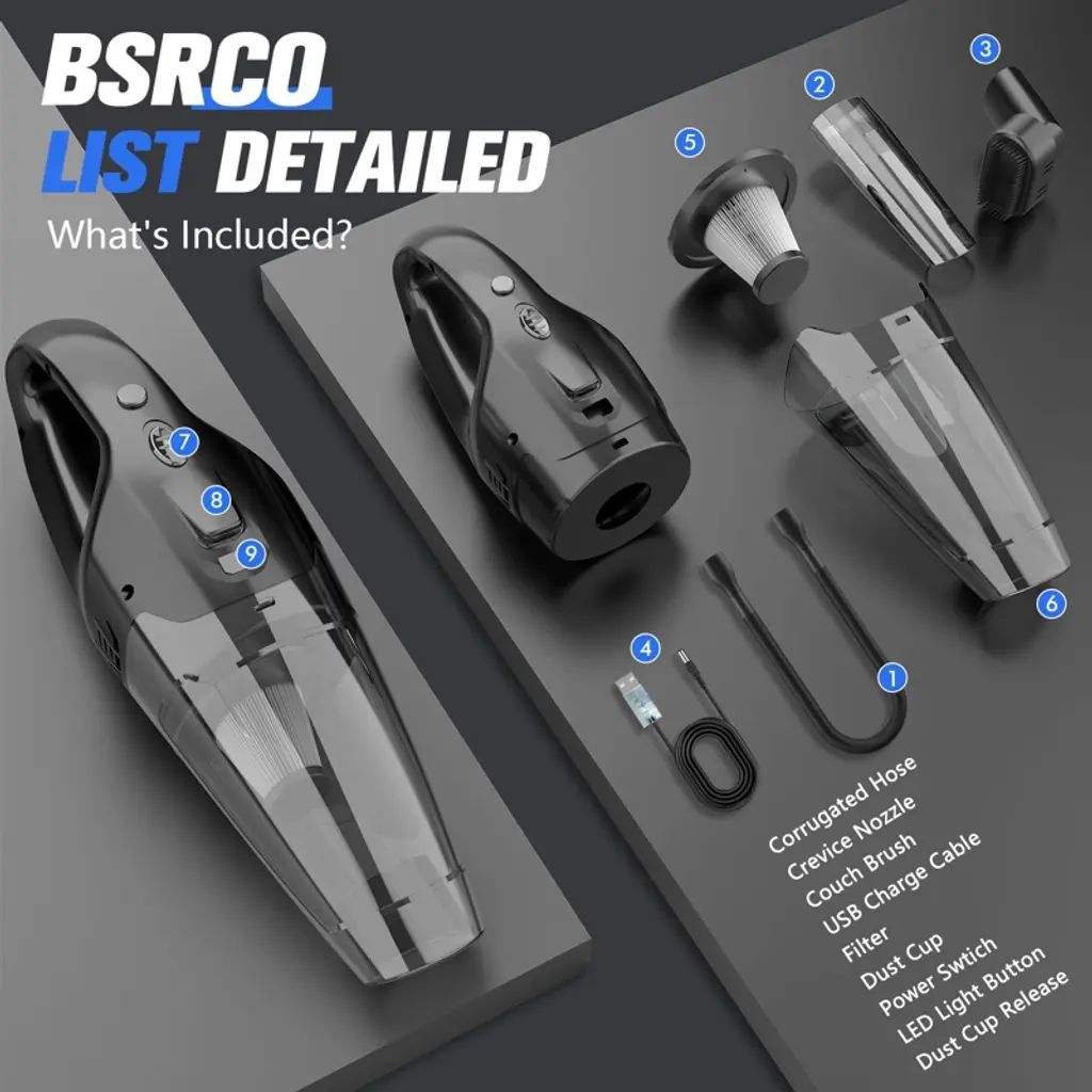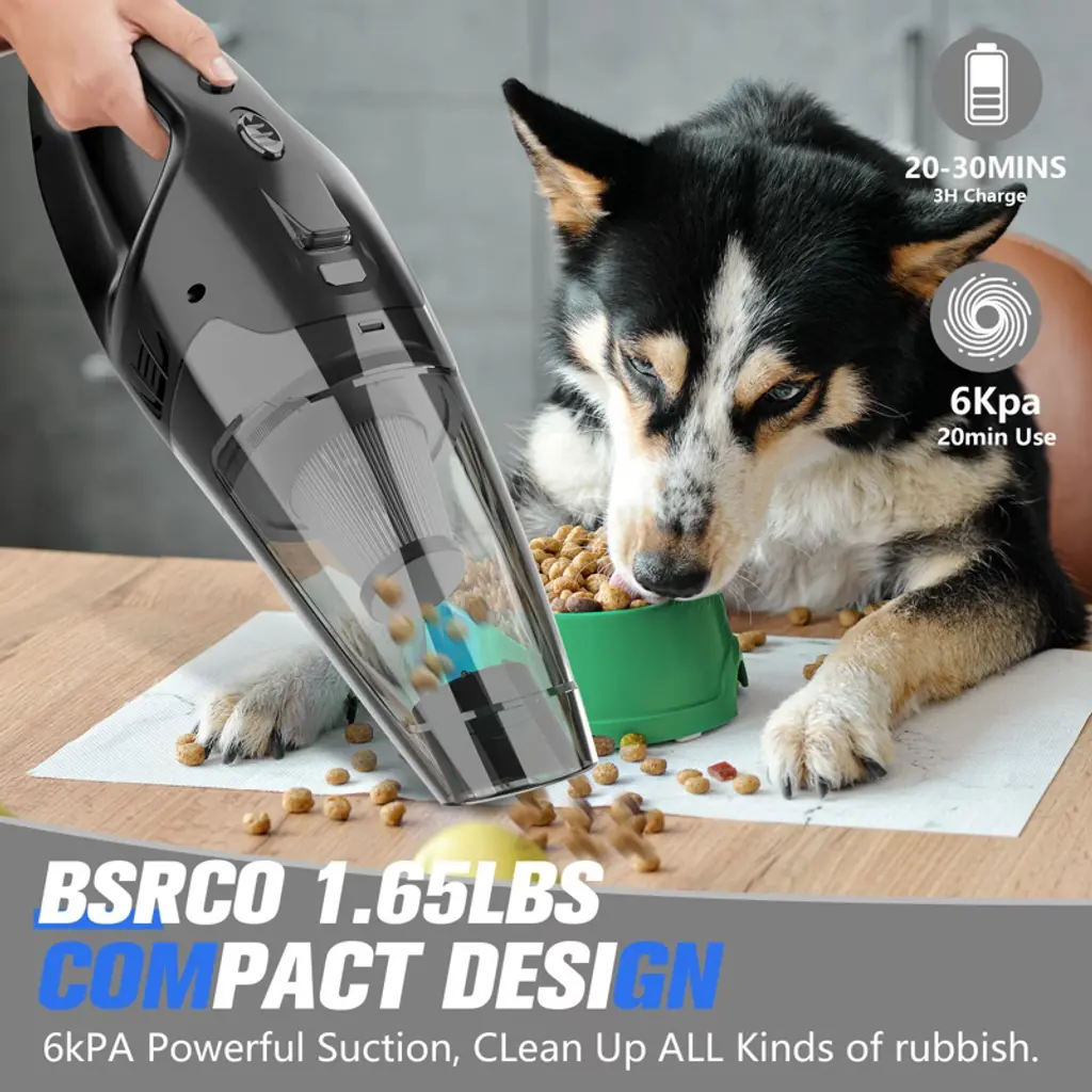 This upgraded handheld car vacuum cleaner has 6000Pa strong suction power, which can easily clean up hair, food residue and dust. Wet&Dry Use, so it's also suitable for kitchen water stains, coffee stains and more. Equipped with LED light, allowing you to clean easily in dark corners or at night. Provides temperature, short circuit and other protection to ensure the device safety. 2.5-3H fully charged, can last for 20-30 mins. Cordless design, 1.5 lbs, lightweight and easy to use, suitable for many spaces such as home and car. Choose our handheld car vacuum cleaner to make cleaning easy and efficient.