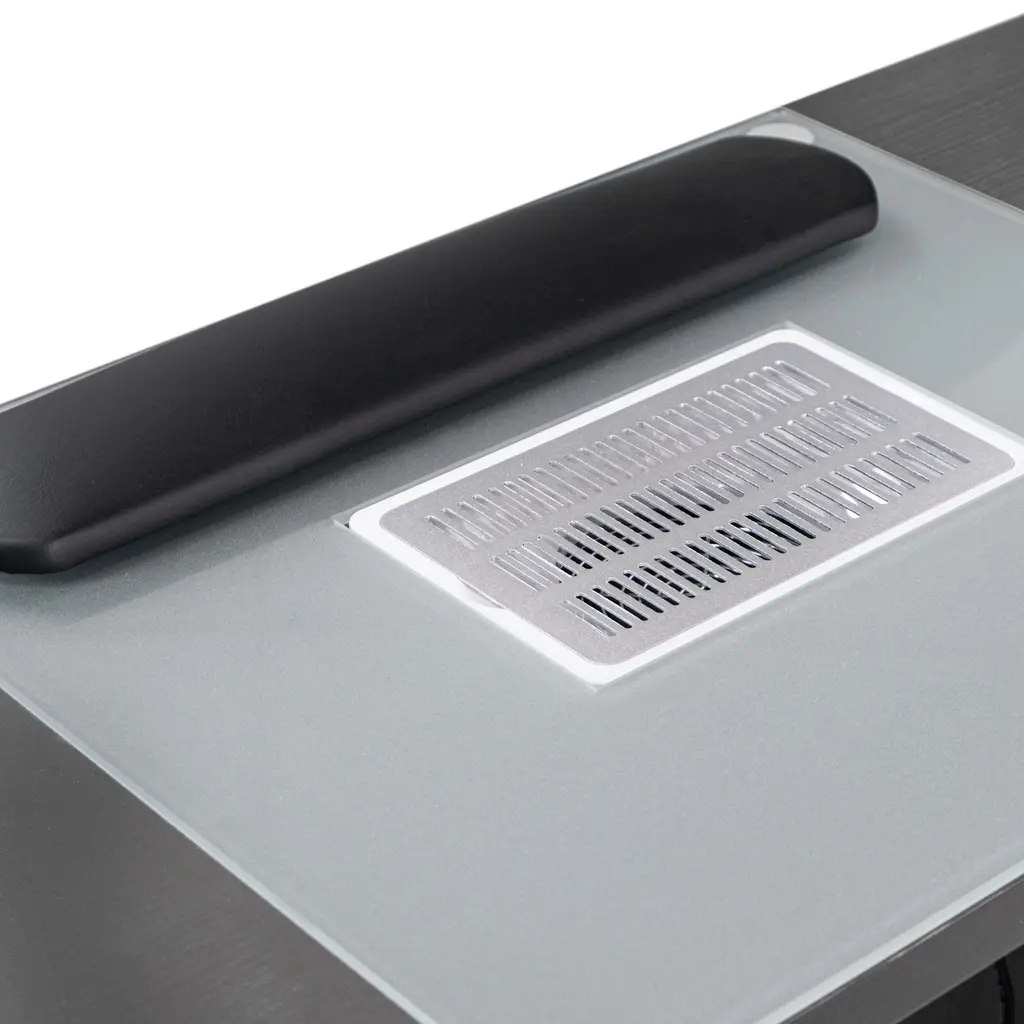 Say goodbye to heavy, cumbersome nail tables that tie you down. Our Glasglow II Manicure Table is designed to be effortlessly portable. With its lightweight construction and easy-to-assemble design, you can take it anywhere your services are needed. Perfect for mobile nail technicians or those seeking flexibility in their salon setup. | ★Full Assembly is required. Table weight 90 lbs | ★Built-in fan, vented for optimal salon use | ★Glass accent in the center size 20" x18" | ★4 Drawers and 1 cabinet for storage, matching armrest included | ★Space under the table for chairs - 17.5" x 25.5"