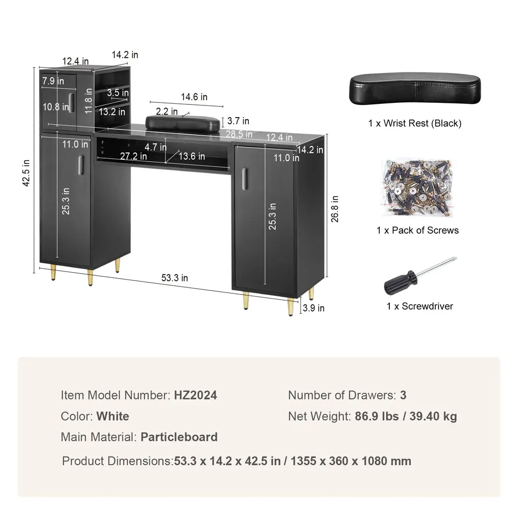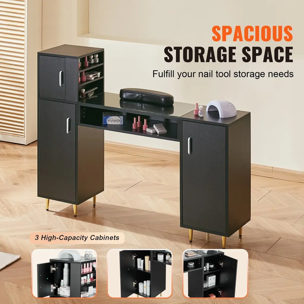 Strong Suction Dust Collector: No worries about flying nail scraps and dust! manicure table is built with a powerful electric dust collector, with one click to quickly collect crumbs and debris during manicure sessions. With 3 reusable dust bags included, maintaining a clean workspace has never been easier. Easy Folding for Space Saving: Our nail desk workstation can be quickly folded when not in use, simply fold it down and stow it away in the included bag for effortless storage and transportation. 4 x 360° rotation wheels offer great mobility. allowing to move nail station to desired location. High-Quality and Easy to Maintain: Crafted from premium medium-density fiberboard (MDF), our sturdy nail desk workstation is resistant to water and bending. It's the perfect blend of practicality and durability for long-lasting manicure service. Brighten Nail Details: Our manicure nail tech desk features 3-level color temperature (warm white, natural white, and cool white), adjustable in 10 levels. With a total of 48 LED beads and bendable LED lamp, it provides you with clearer visibility of nail details and enhancing manicure efficiency. Versatile & Fashionable: Beyond a manicure table, our foldable manicure nail art station serves multiple purposes—it doubles as a makeup table in salons and bedrooms or as a computer desk in the living room. Whether for commercial or home use, it's the perfect choice for versatility and functionality. Package Content 1 x Carrying Bag 3 x Dust Bags 1 x Dust Collector 1 x LED Lamp 1 x Hand Pillow (Black) 1 x Fuse