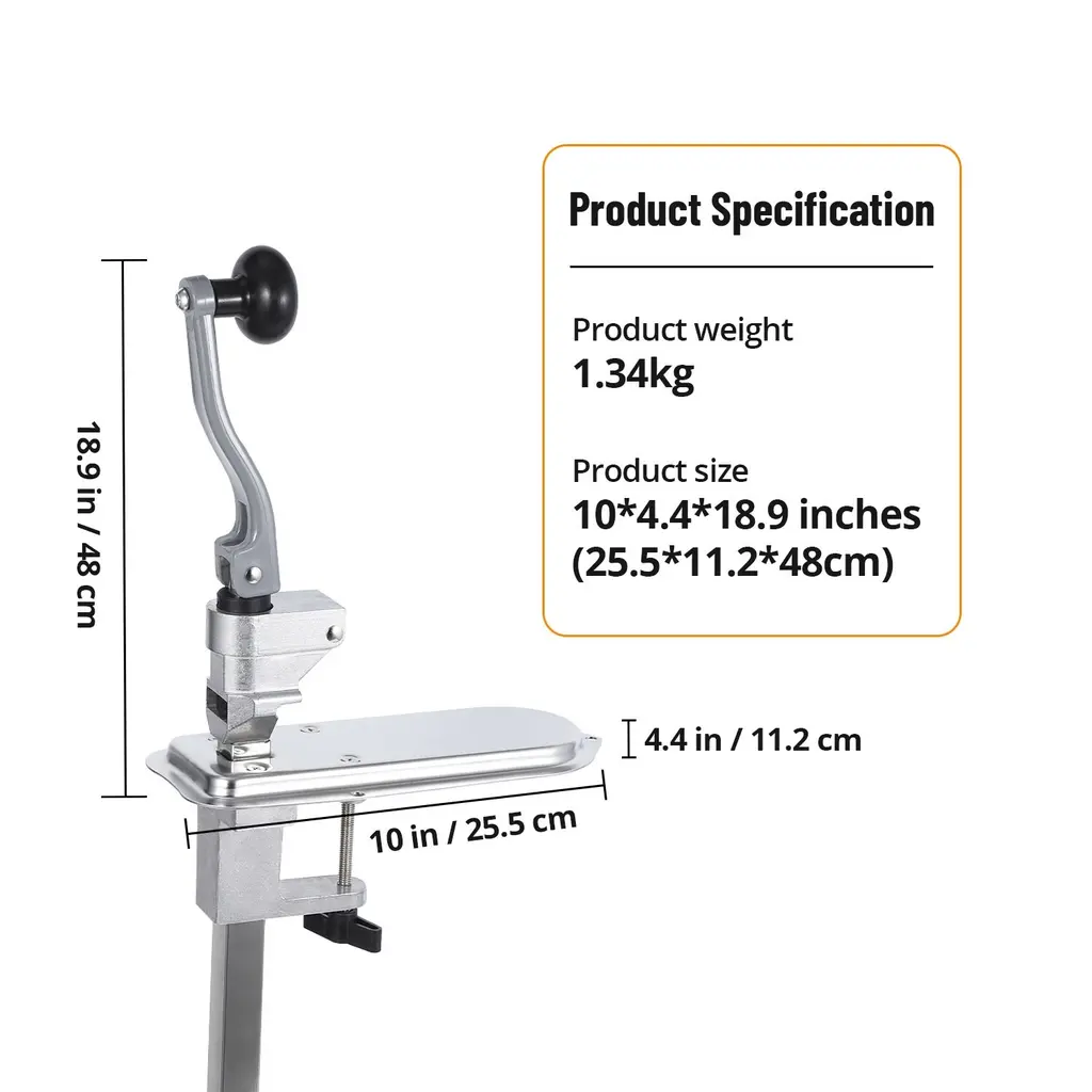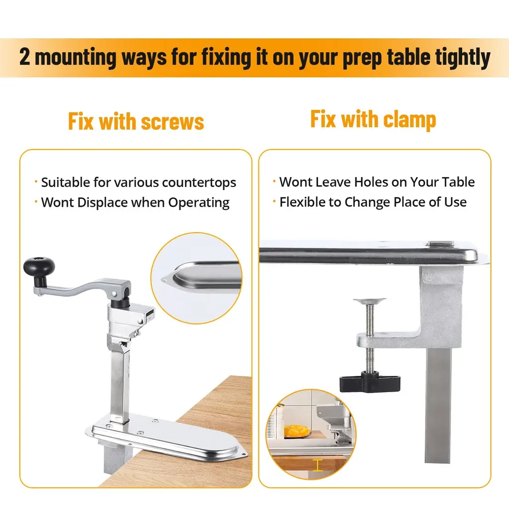 【EFFICIENT CUTTING】You will be glad to use our commercial can opener to open the toughest cans quickly. The blade is made of stainless steel (3Cr13Mo) for greater hardness and wear resistance. Its surface is not plated, so you don't have to worry about metal shavings falling into your cans. A spare blade is also provided for replacement. Opens up to 6 cans per minute, making it an excellent choice for light-duty use. (Maximum can thickness: 0.02 in./0.4 mm.)【TWO FIXING METHODS】You can choose to tighten it or place it on the preparation table as a manual can opener. One option is to secure it with screws, which are suitable for a variety of table tops and ensure that it will not shift during operation. The other is to mount it to the edge of the table with a bottom clamp. With this method, your table top will remain intact without any screw holes and you have the flexibility to change where you use it. (Maximum table edge thickness: 2.4 in./6 cm.)【LABOUR-SAVING ROTATING HANDLE】This industrial can opener comes with a 6.9 inch/17.5 cm long handle that is comfortable to handle and greatly simplifies your time-consuming can-opening tasks. Simply press and turn the rotary handle clockwise a few times to quickly and easily pierce the can with the knife. 【SUITABLE FOR ANY CANS】this tabletop can opener consists of a fixable base and a long bar. The bar can be freely lifted and lowered to adjust the cutting height, suitable for all sizes of cans. The height adjustment range is 7.9 inches/20 cm. It is compatible with cans up to 11.8 in/30cm or 15.7in/40cm in height and 2.2 lbs/1kg in weight.【COMPLETE YOUR KITCHEN PREP AREA】It is widely used in home and commercial kitchens, restaurants, bars and more. Whether you need to open canned fruits, vegetables, soups, seafood or anything else, this can opener is sure to be a welcome addition to your kitchen.