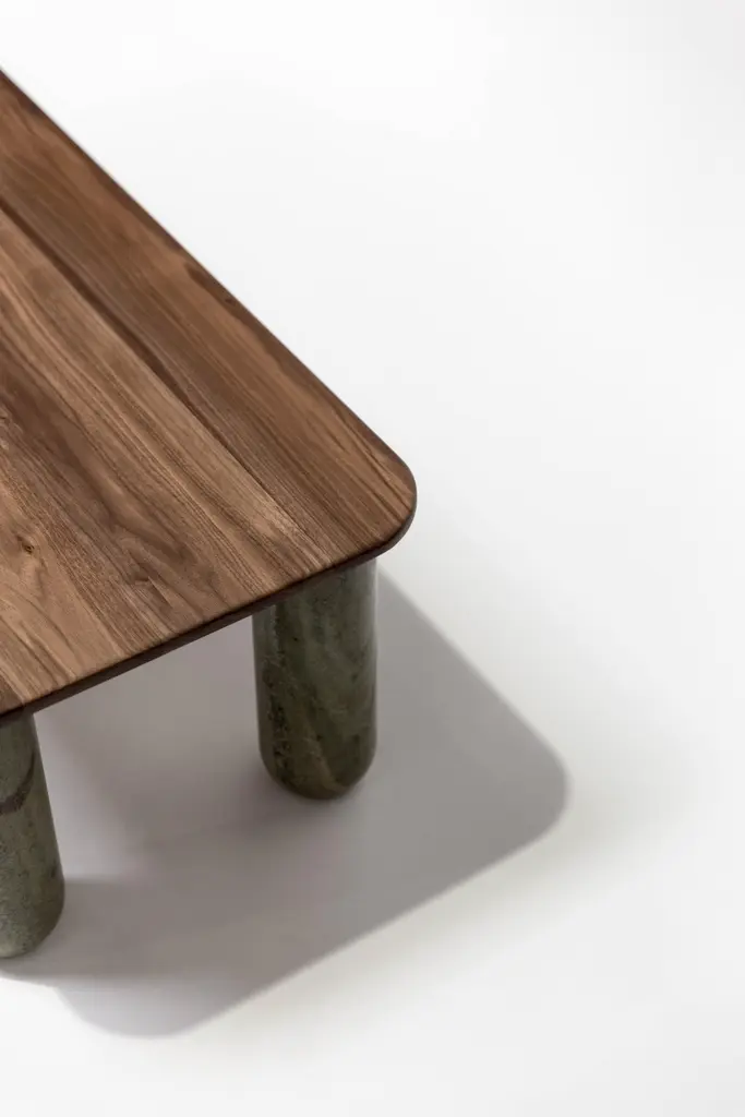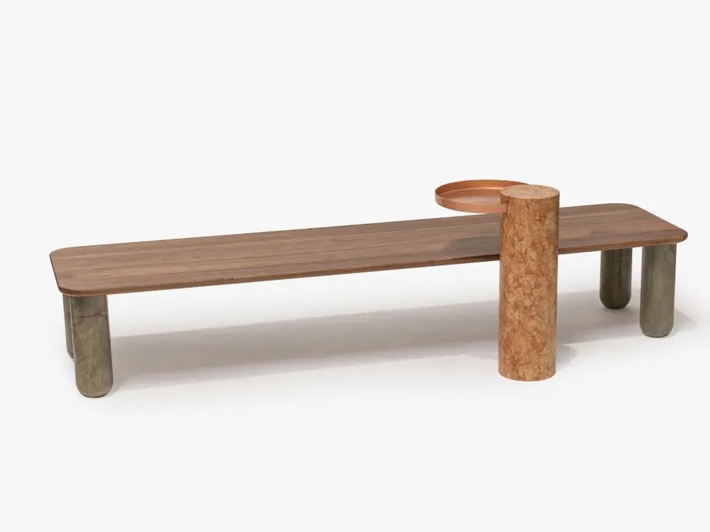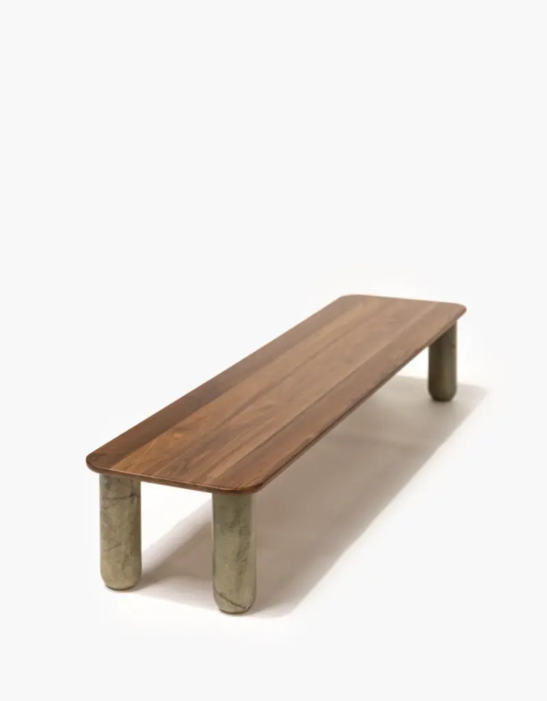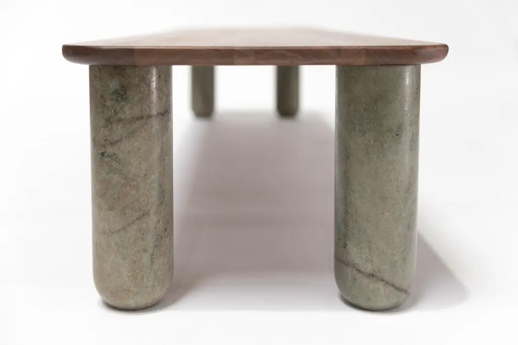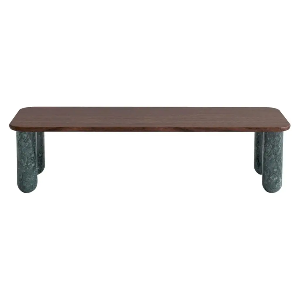 Marble "Sunday" coffee table, Jean-Baptiste SouletieDimensions: 50 W x 200 D x 35 H cmMaterials: Indio green marble, walnut woodAvailable in 4 sizes: D150, W50 / D200, W50 / D150, W100 / D200, W100.Available in 5 top materials: walnut / black stained wood / Pele de Tigre marble / Black Marquina marble / Indian green marble.Available in 3 leg materials: Pele de Tigre marble / Black Marquina marble / Indian green marble.Sunday is a family of coffee tables and low consoles with a simple and clean design vocabulary. The combination of heavy marble legs with the thin solid wood or marble top creates an interesting contrast while the rounded edges and generous proportions provide a comforting feeling.Jean-Baptiste Souletie is the Co-founder of the furniture editor La Chance with Louise Breguet. He studied in India, worked for a merchant bank in London (where he designed their new offices), before working for an investment fund (where he redevised the graphic chart), and in the strategic department of a luxury goods company in Paris. He returned to his first loves, architecture and furniture, when he founded La Chance in 2012.