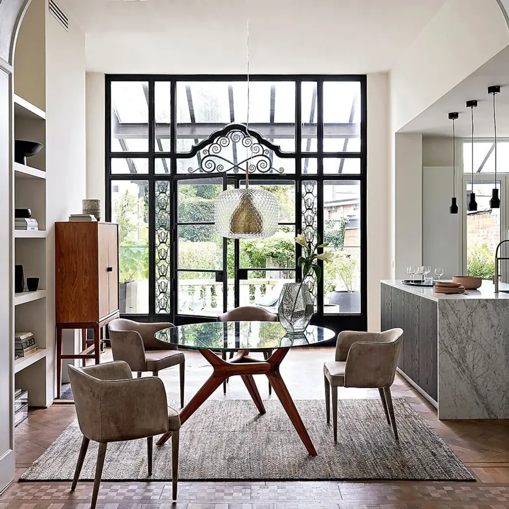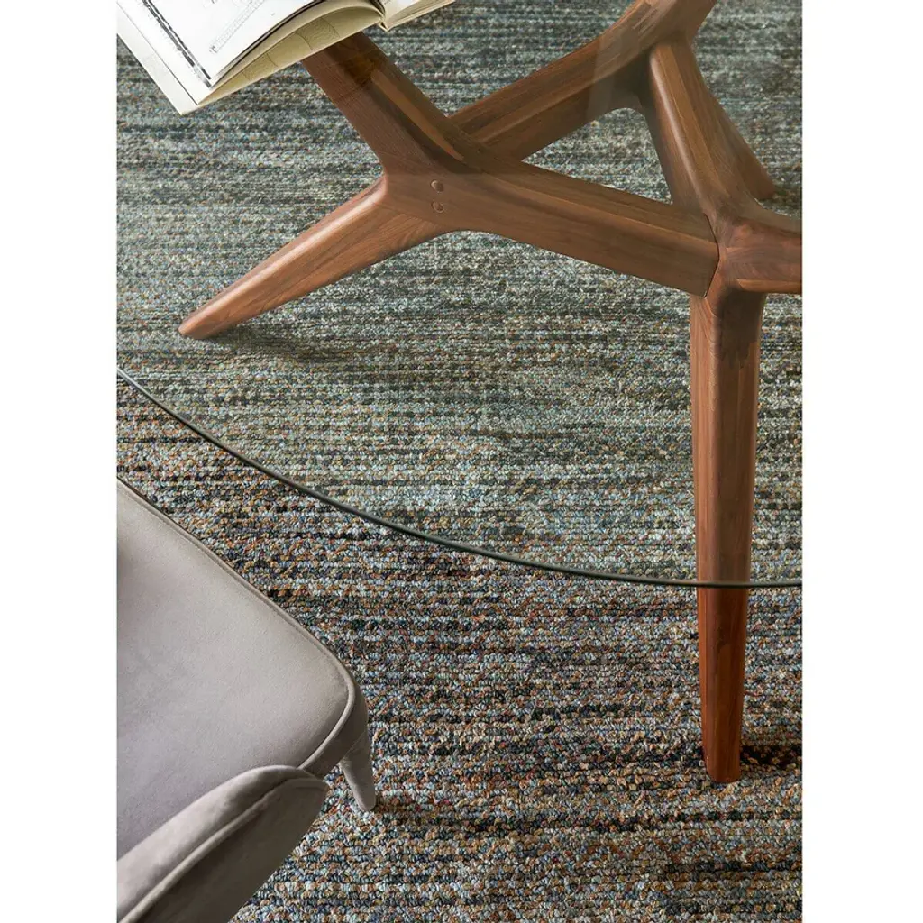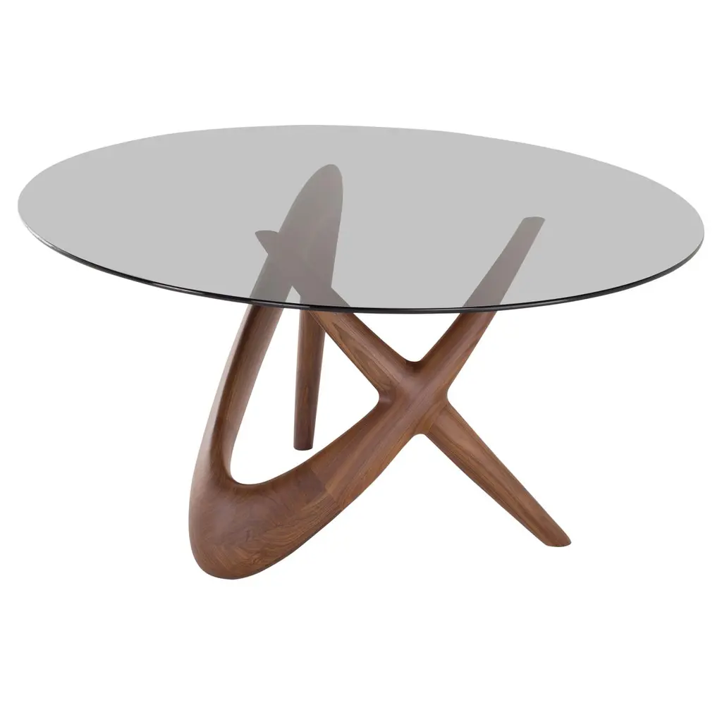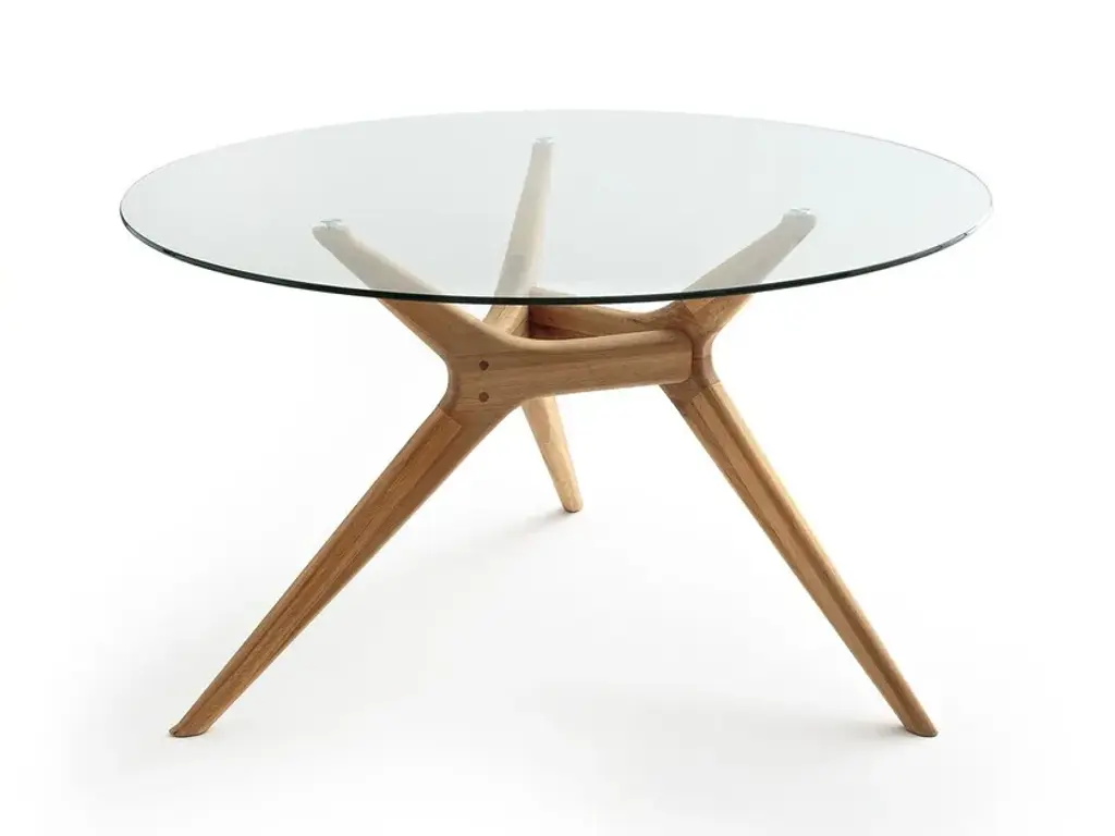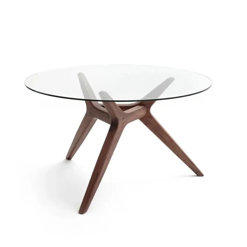 The elegant and refined Maricielo table has a glass top that uncovers its solid wood base with a geometric design.1 cm thick toughened glass top.Legs in solid walnut with polyurethane finish.For 6 place settings