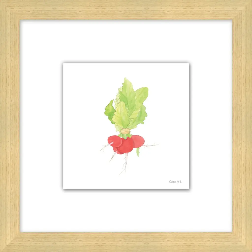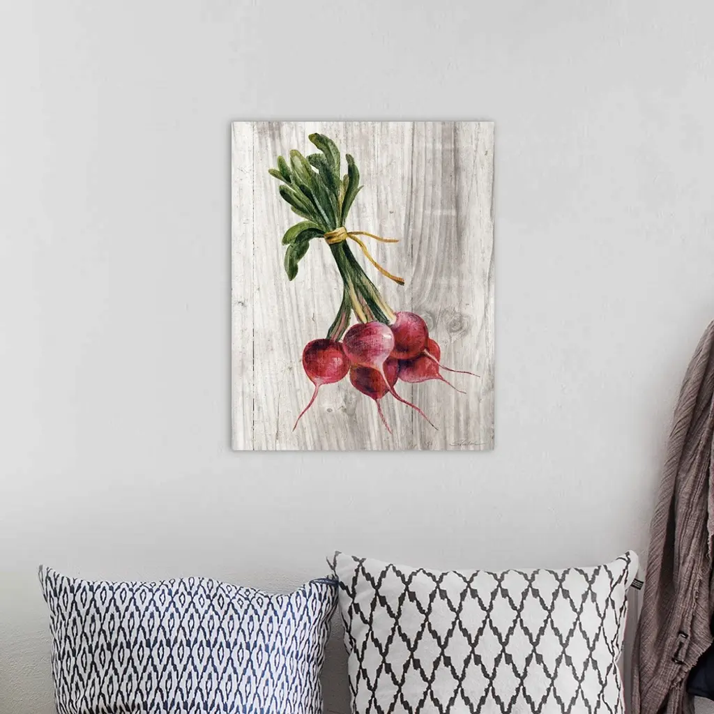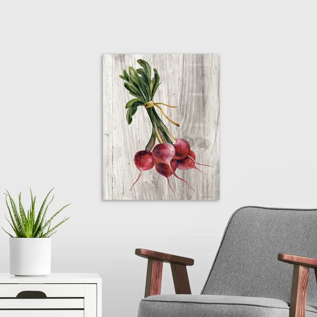 Rustic painting of a bundle of radishes on a white and gray wooden background.