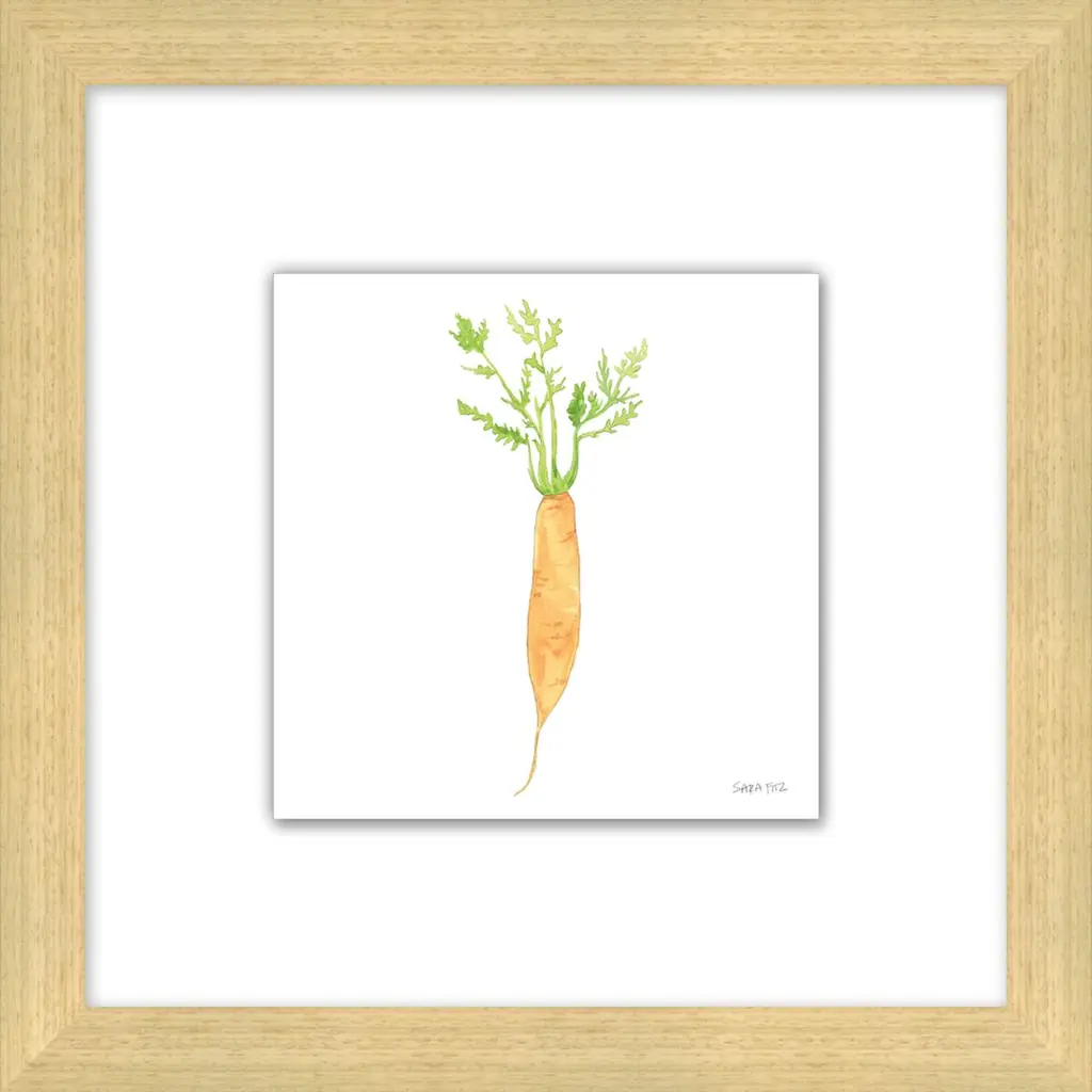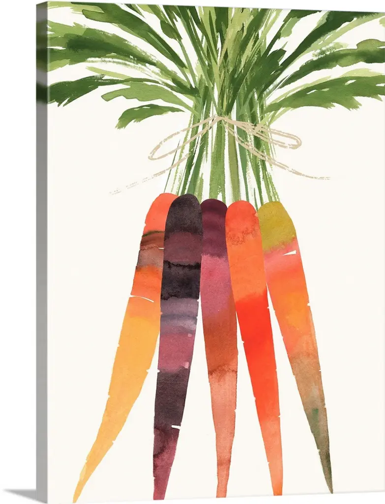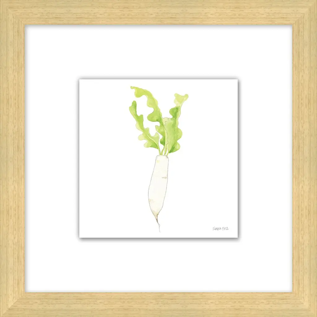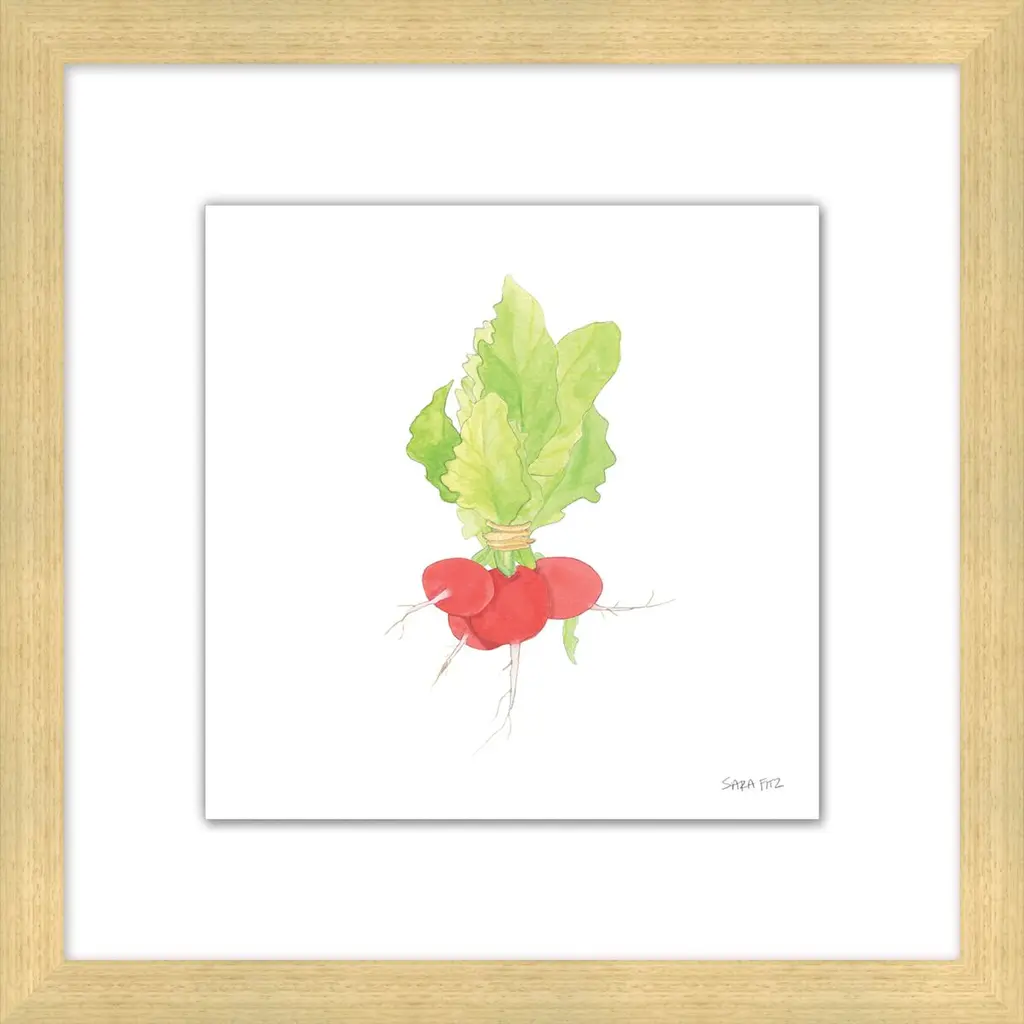 Rustic painting of a bundle of radishes on a white and gray wooden background.