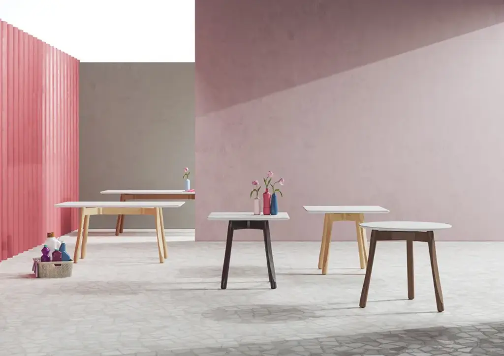 Elegant tables perfect to furnish contract, home and office spaces. Materials and colors: frame in solid ash wood. Top: MDF cold white laquered, th 25 mm.Solid and stable, Marnie is a table that does not go unnoticed: thanks to its fine details, it can enhance with simple elegance hotels, restaurants and home spaces. Made in ash wood with round section, the table features three tapered legs with a particular sidecut working that gives a sense of lightness to the product. The top can be round, square or rectangular in various dimensions. Scratch-resistant lacquered MDF or raw wood tops, specifically designed for places using tablecloth.