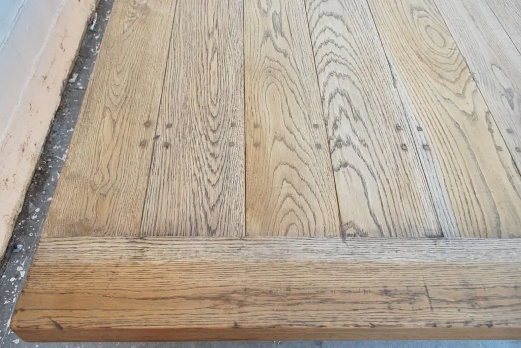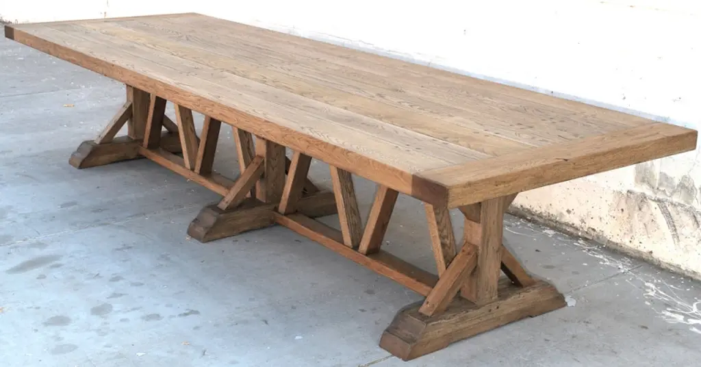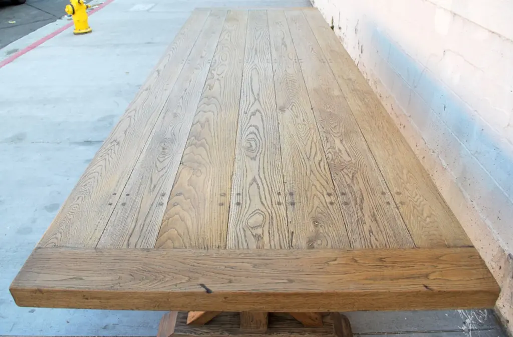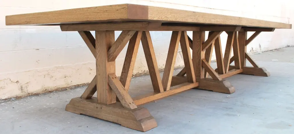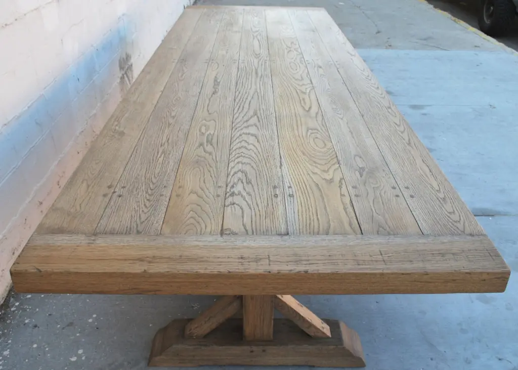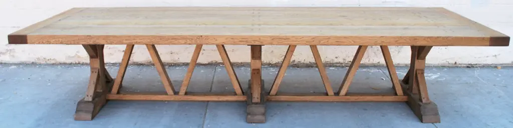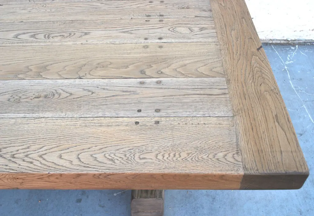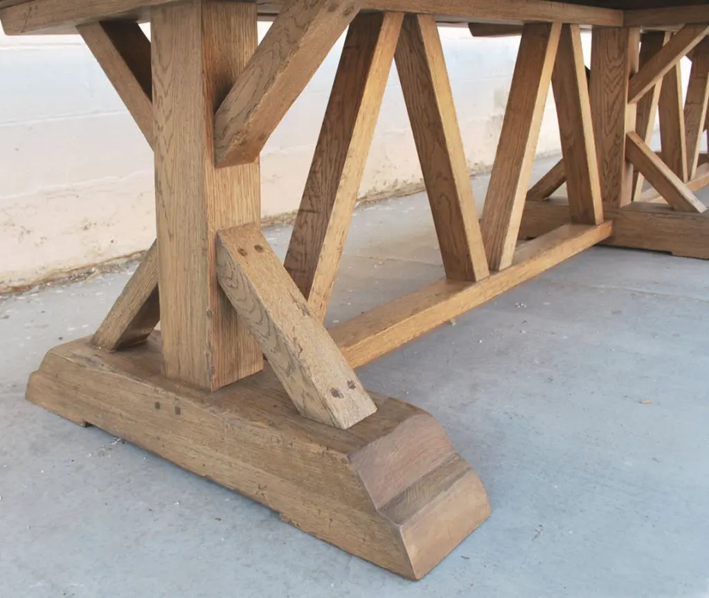 Vintage oak trestle table. Nicely distressed with lots of character.Because each table is bench-made in our own Los Angeles workshop you can influence all aspects of design, including size, wood species and finish. We use only traditional carpentry techniques, no nails or metal fasteners of any kind, just mortise and tenon construction reinforced with hand-cut wooden dowels. If you require customized overhang dimensions please stipulate with order.