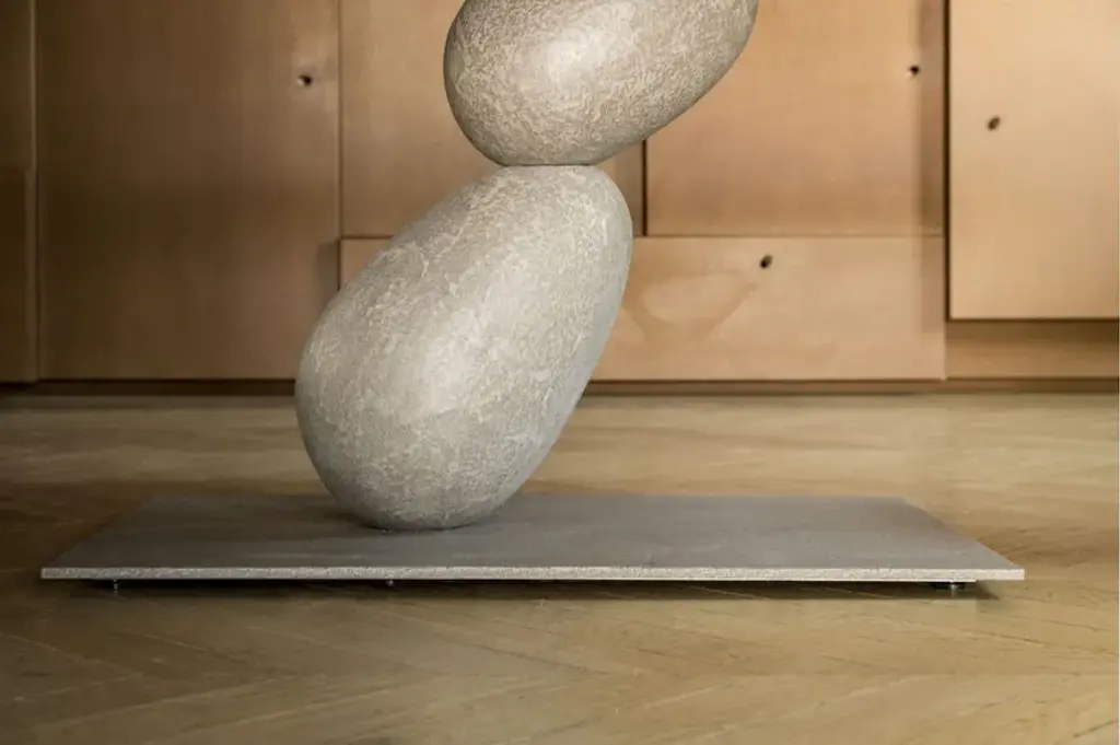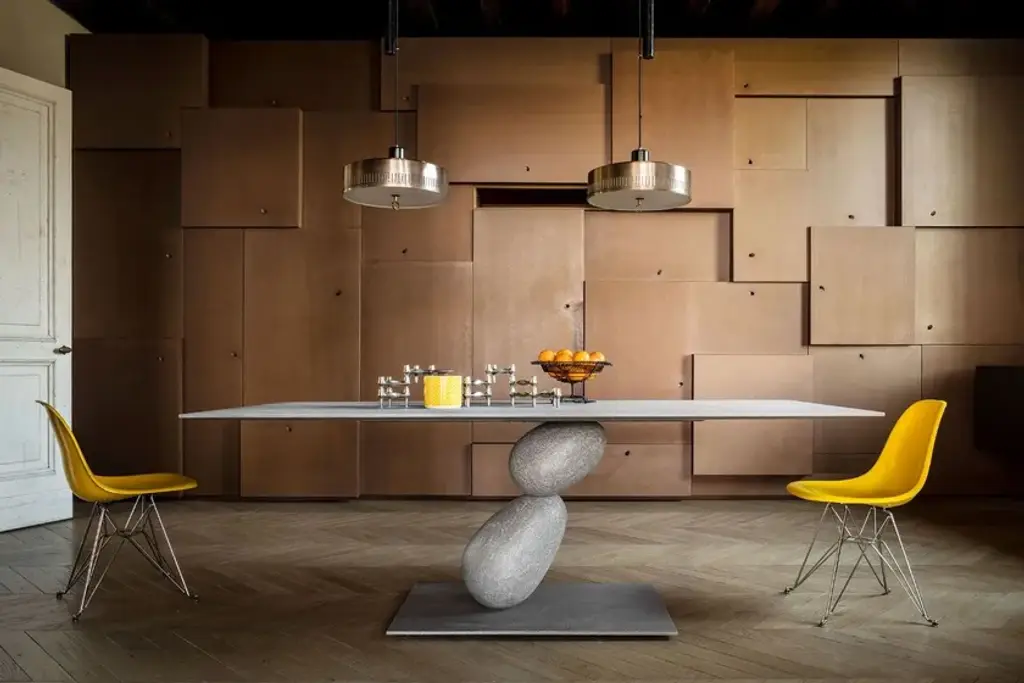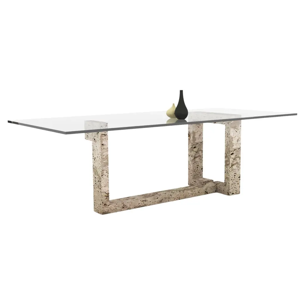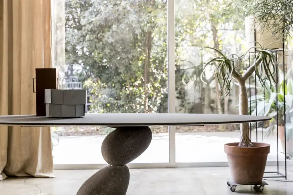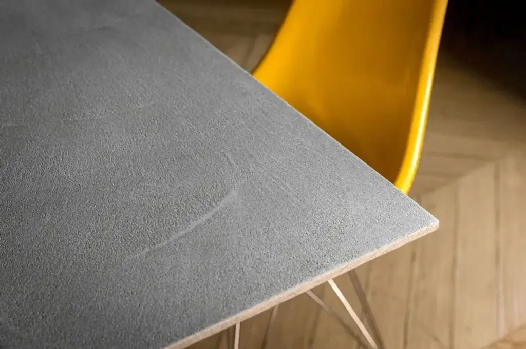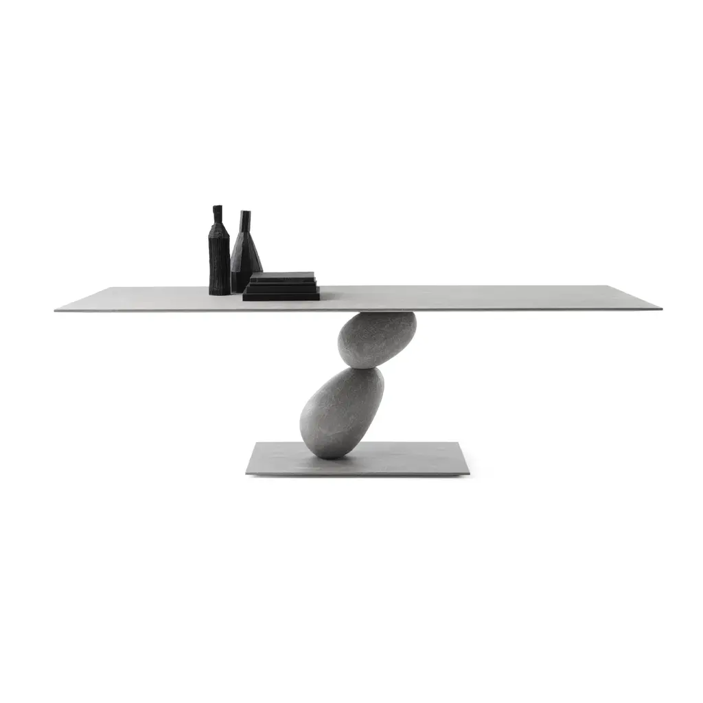 Matera is a recyangular table with metal structure and mdf top. All covered in 3 hand-brushed material finishes Matera is an important table, two balanced stones that support a top.