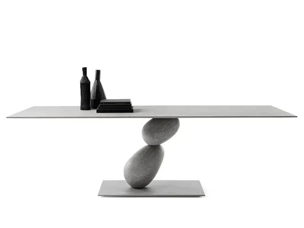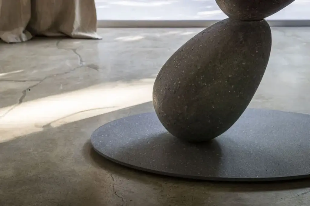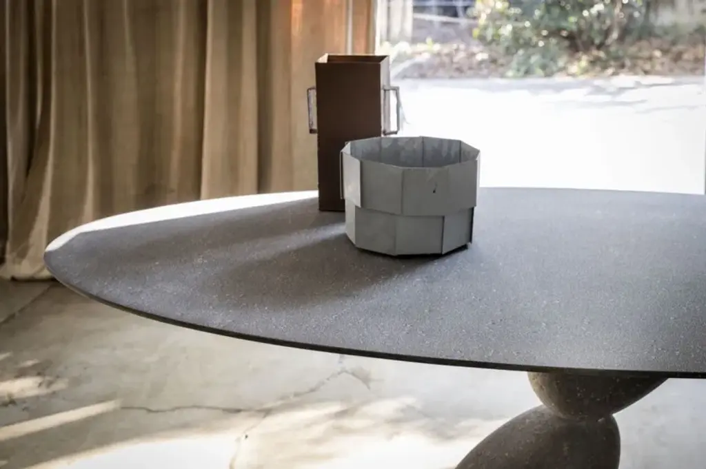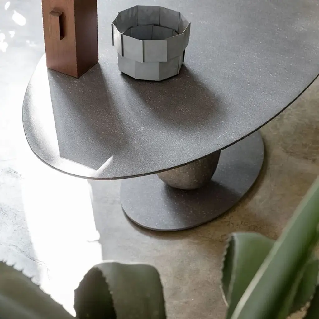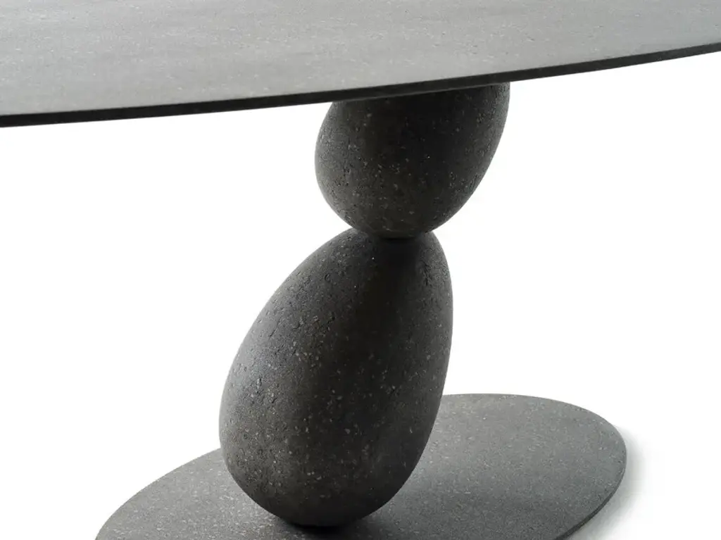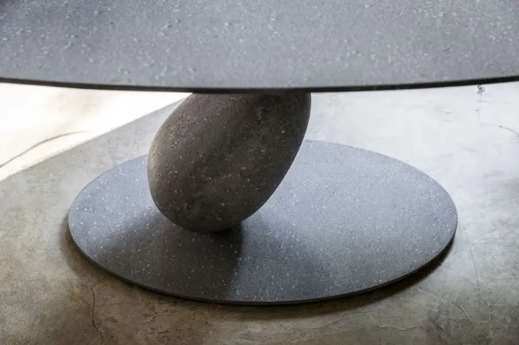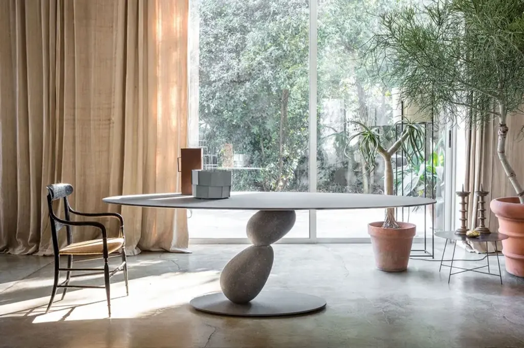 Matera is an oval table with metal structure and mdf top. All covered in 3 hand-brushed material finishes.Matera is an important table, two balanced stones that support a top, a perfect balance game.