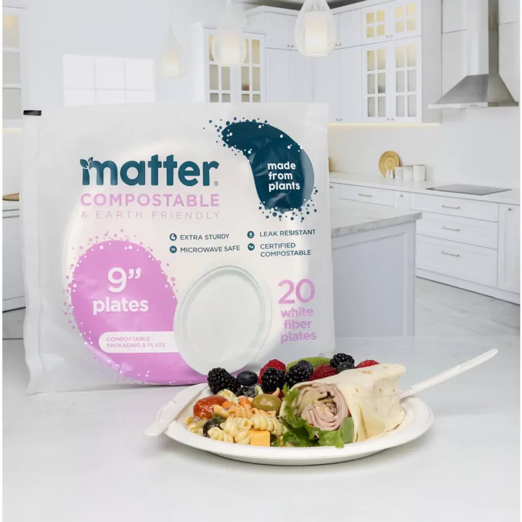 Product contains compostable elements. Packaging contains compostable elements. Matter 9” White Plates powered by Nature Star are compostable, and made using natural, renewable and sustainable fibers. Matter 9" plates, when disposed of properly, will compost in soil in a matter of months. Matter plates are durable, leak-resistant, microwave, and freezer safe. A better plate matters.